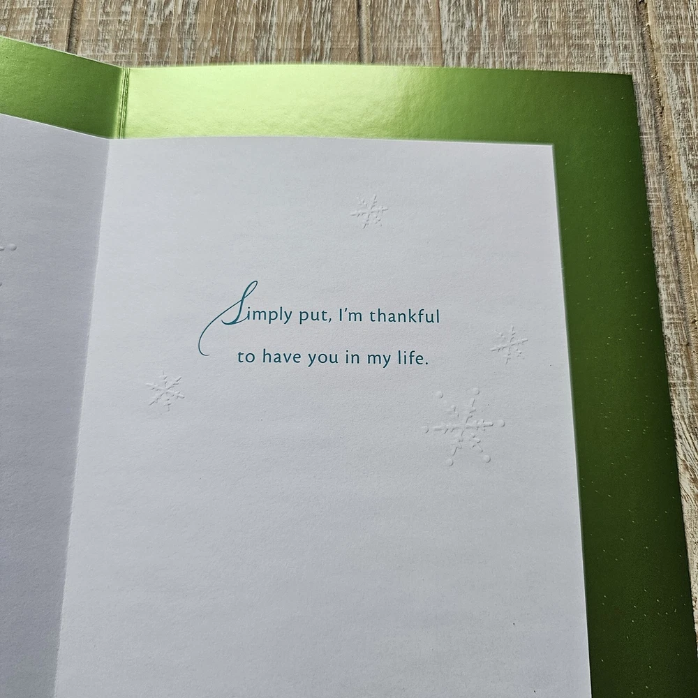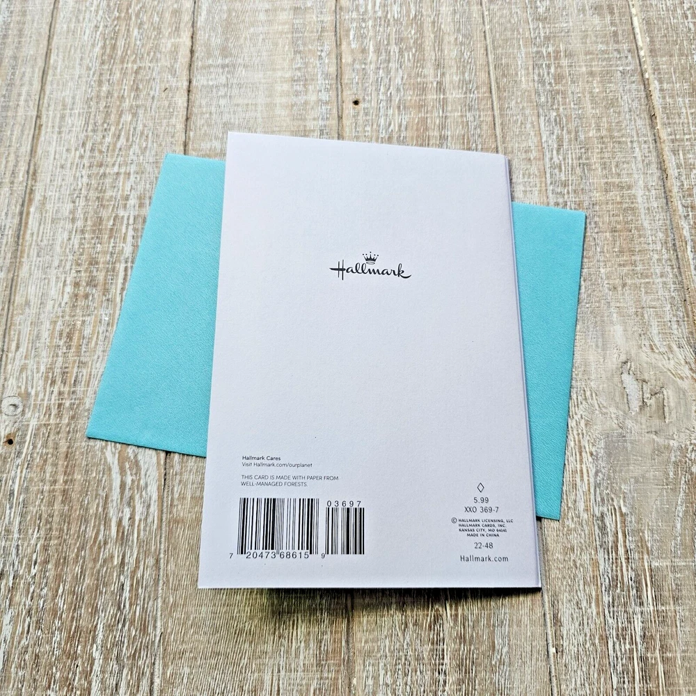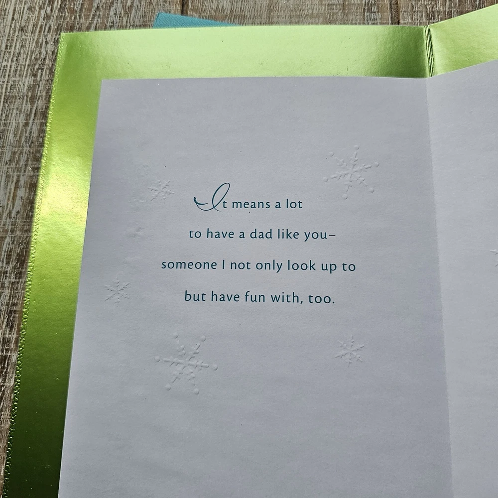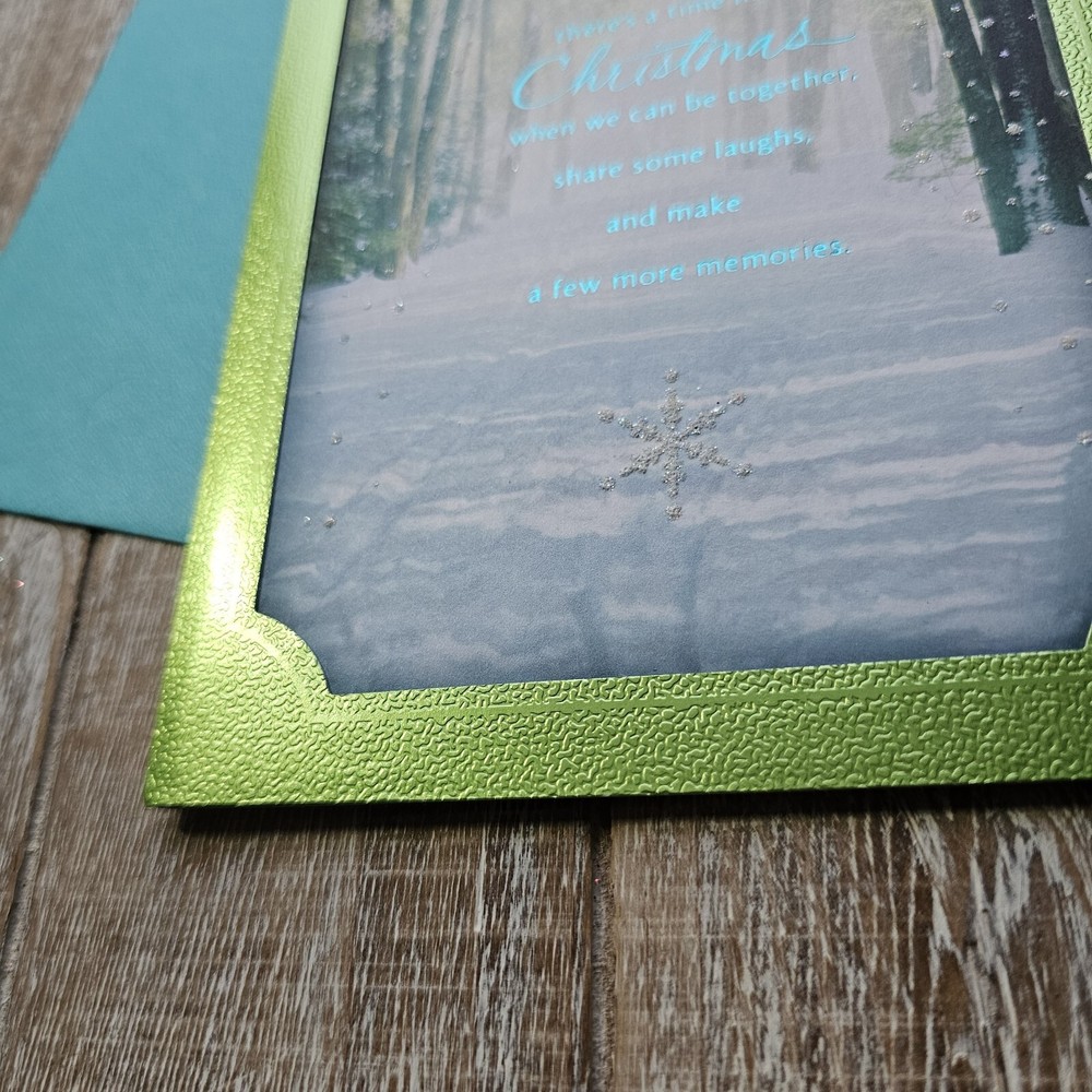 Hallmark Christmas Greeting Card For Dad Green Blue Metallic Snow Glitter Full Size 5.5 x 8 inch card This listing is for a single card and matching envelope in new condition. Click here to add a personalized label to the inside of your card. Search thousands of cards for all occasions in our eBay Store . Our cards ship with limited tracking via USPS First Class. Standard delivery time is 5-7 days but may take up to 10 days.