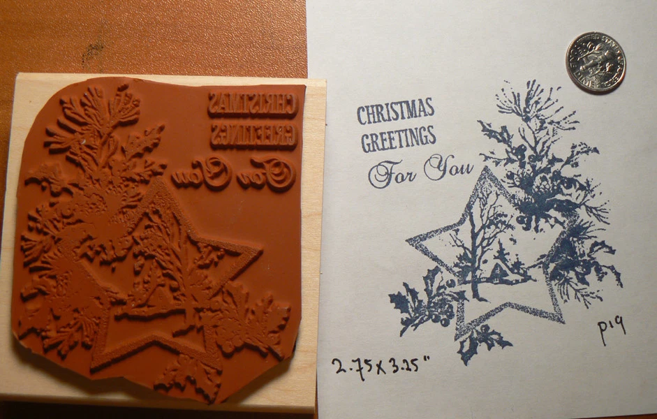 C hristmas Greetings F or You rubber stamp. Great for making your ver y own hand printed cards. Measures 3x3" and is very detailed. Actual vintage image of a be autiful Hol iday card. Deep etched premium rubber and wood mounted. Please do not pay shipping until you see a combined invoice and you are truly done s el ecting st amps. T hat way we can use the most economic way to ship . Thanks, Syl