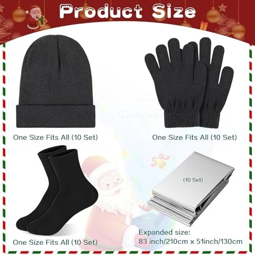 Menu 1. We require immediate payment. 2. We currently accept payment via eBay managed payments only. 3. Once payment is cleared, we will dispatch your shipment within 1-3 business days. Please refer to the "Shipping" tab for more information regarding shipping speed to your destination. Christmas Homeless Care Package Supplies Bulk Winter Beanies Gloves Socks Emergency Blankets for Women Men Product description Nice Homeless Care Package Set: our package contains 10 pieces of bulk beanies for homeless, 10 pairs of winter gloves, 10 pieces of thermal blankets, and 10 pairs of socks, allowing you to give the gift of warmth and comfort to people in need this Christmas Warm and Comfortable: our hats gloves and socks for adults are made of polyester and knitted fabrics, ensuring comfort and durability, letting you experience unmatchable softness while providing crucial protection against bitter winter elements Proper Size: the emergency blanket measures about 51.18 x 82.68 inches/ 130 x 210 cm (unfolded), 4.72 x 2.95 inches (folded), and bulk hats gloves and socks for homeless are designed to fit most men and women, making it easier for you to distribute the supplies to homeless individuals of varying sizes and ages Practical and Bring Warmth: this emergency thermal blanket can retain up to 90% of the user's body temperature, helping you prevent hypothermia and shock, you can provide immediate relief to those in need; These practical items not only offer protection against the cold but also bring warmth and comfort to those who may be struggling without proper shelter Broad Range of Application: our homeless supplies bulk are suitable for various individuals, including homeless individuals, shelters, outreach programs, and charitable organizations; The versatile nature of the items allows for widespread distribution and application, ensuring that more people can gain profit from your generosity PLEASE MESSAGE US IF YOU HAVE ANY OTHER QUESTIONS, AND MANY THANKS FOR READING ALL OF THIS. Copyright ©#. All Rights Reserved.