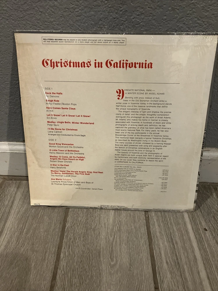 gtin13:Does Not ApplyEdition:StereoStyle:1960s, Chorale, christmasVinyl Matrix Number:WNRS-2347--5S B1 HRecord Size:12"Material:VinylInlay Condition:Excellent (EX)Case Type:Cardboard SleeveLanguage:EnglishSpeed:33 RPMCountry/Region of Manufacture:United StatesRecord Grading:Near Mint (NM or M-)Features:SamplerColor:BlackRelease Year:1968UPC:Does Not ApplyFormat:RecordOccasion:ChristmasType:LPSleeve Grading:Excellent (EX)Era:1960sGenre:HolidayRecord Label:RCA VictorCatalog Number:PRS-276MPN:PRS-276Artist:Al Hirt, Ed Ames, Harry Belafonte, Various, Vic Damone, Arthur Fiedler, Boston Pops, Peter Nero, Lana Cantrell, Morton Gould And His Orchestra, Henry Mancini And His Orchestra, Robert Shaw Chorale, The Norman Luboff Choir, Leontyne Price, Choir Of Men And Boys Of St. Thomas Episcopal ChurchRelease Title:Christmas In California