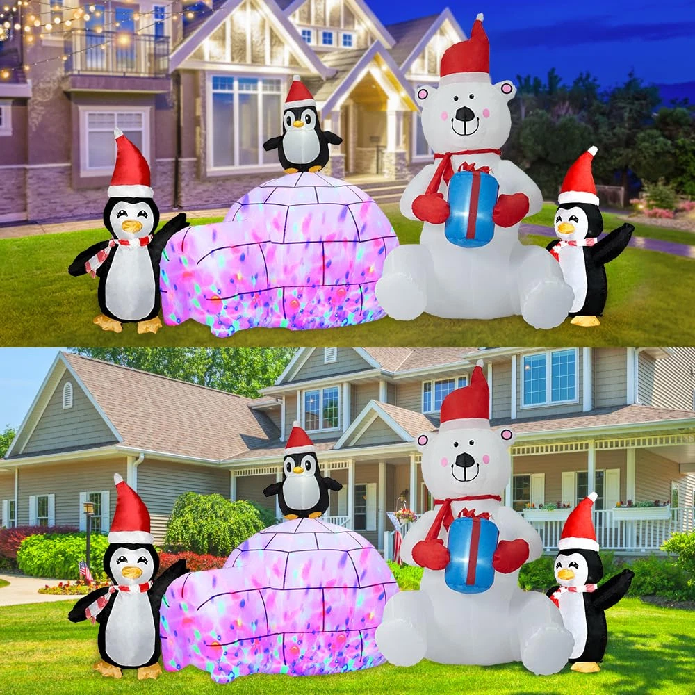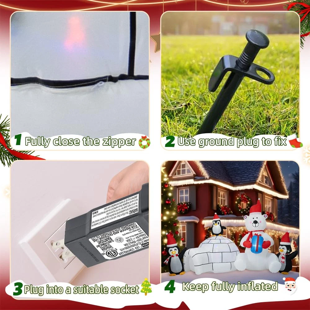 【10FT Chirstmas Polar Bear Decoration】 10 Foot long Polar Bear with its dazzling rotating light igloo will make a great hospitable impression for your front lawn. who can possibly say no to a cute polar bear and his whole family, coming through thousands of mountains and rivers, gives his best wishes for Christmas, adding joyful and delighted atmosphere to the holiday. 【Kaleidoscope Lighting Effect in Igloo】 This Chirstmas inflatables decoration has a built-in automatically rotating light ball which will catch all the attention from your kids, neighbors and friends at Christmas. They must fall in love with this blow up inflatable decor at the first sight! Try it and you will believe it. 【Self-Inflates & Easy to Store】 Equipped with a powerful blower, simply place the Christmas Inflatable Decoration on the ground and turn on the power, it can be quickly inflated in minutes. Secure it with 2 ropes 5 inserts and 2 moveable sandbags in the package. Storage is simple and compact. Just roll up the Christmas yard decorations and put it in the box for storage. 【Waterproof Material for Outdoor Use】 This outdoor Christmas decor is made of high-quality polyester waterproof material, strong enough to withstand rips, tears, and outdoor weather. The excellent stitching improves the durability of the Christmas blow up yard decorations. 【Best Christmas Decoration for Any Occasion】 Great for indoor, outdoor, front yard, lawn, garden, stage props, party, restaurant, cafe, home, party, Christmas, holiday, festivals, vacations, Mardi Gras, New Year's Day, gifts. Holiday blow-ups for parties and More!