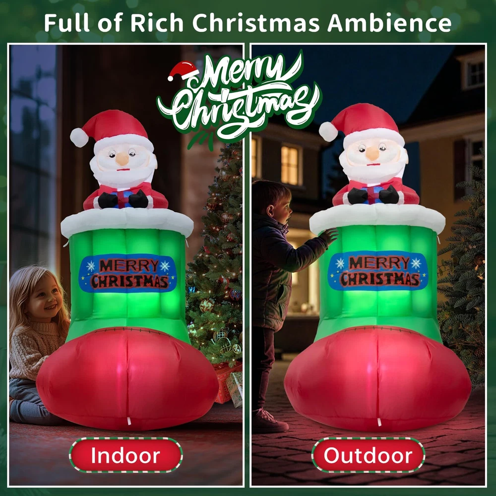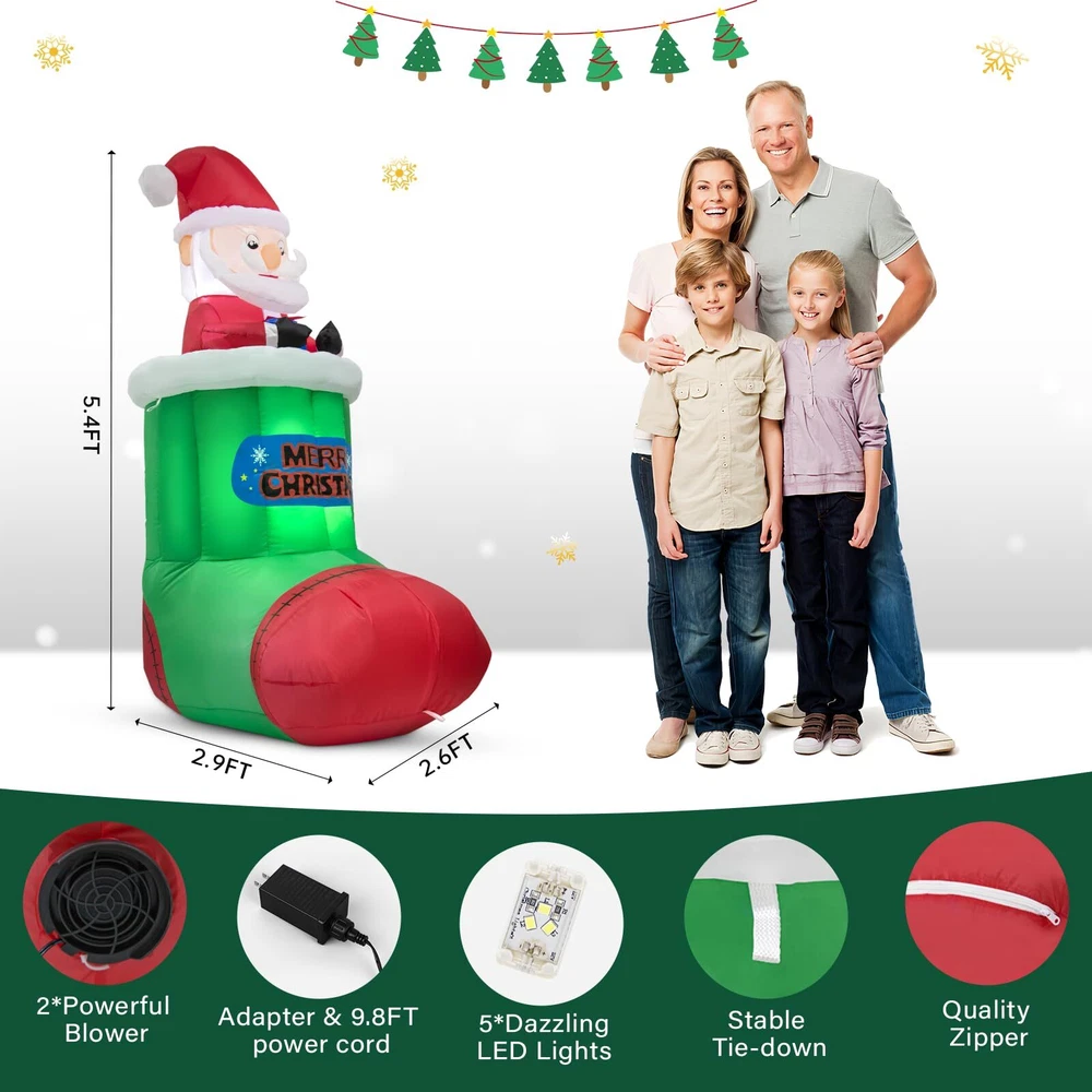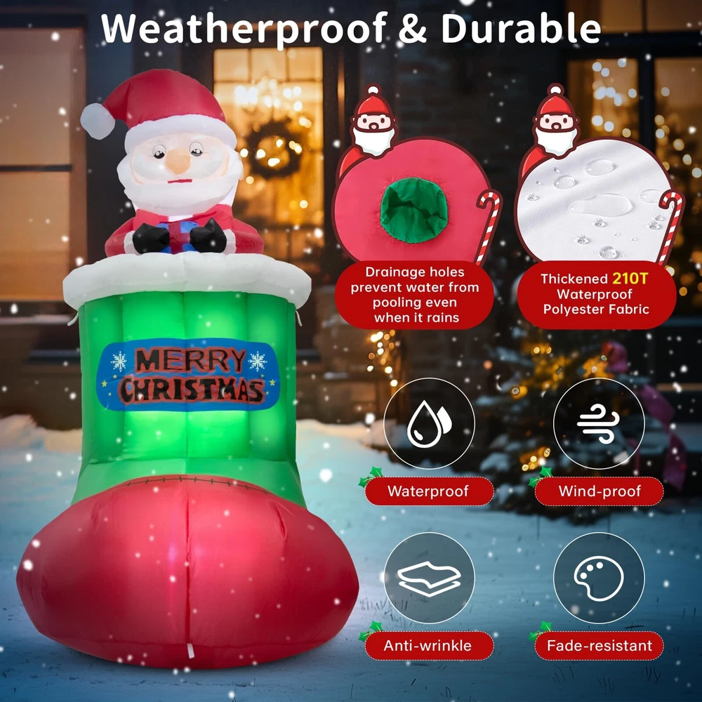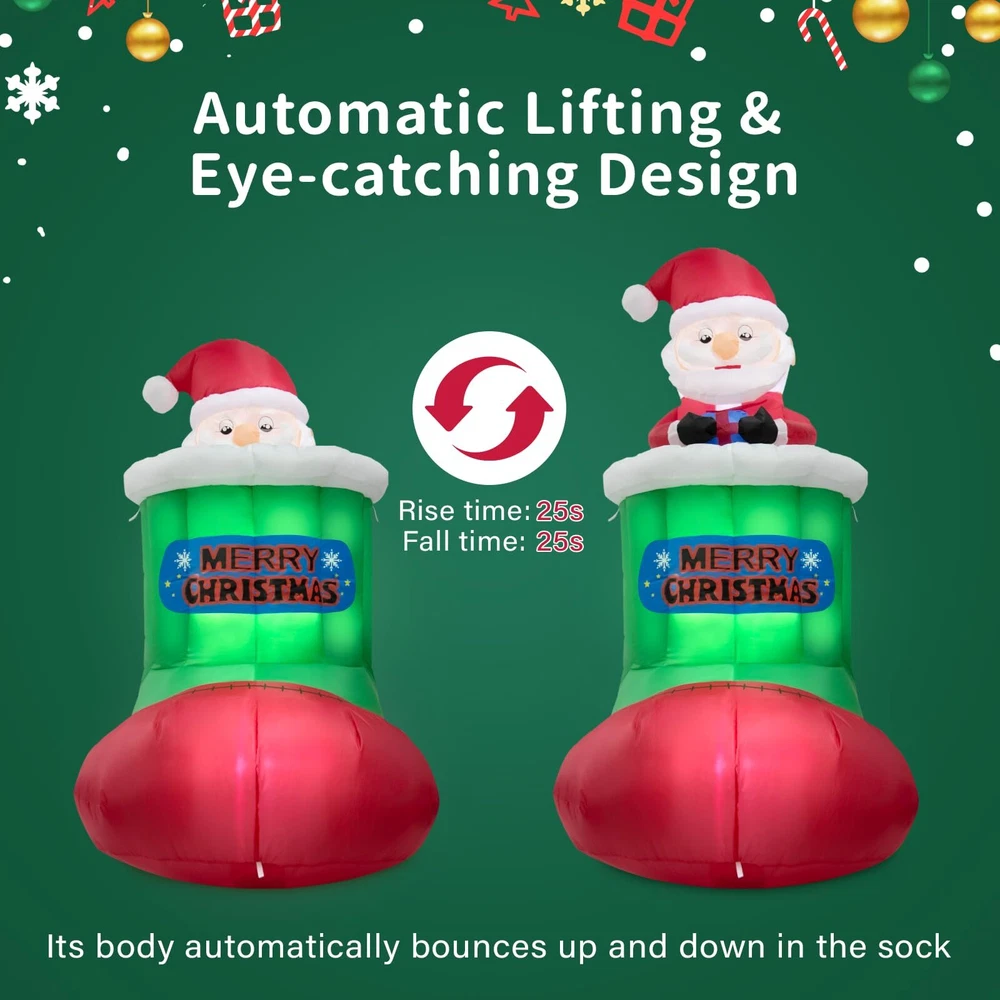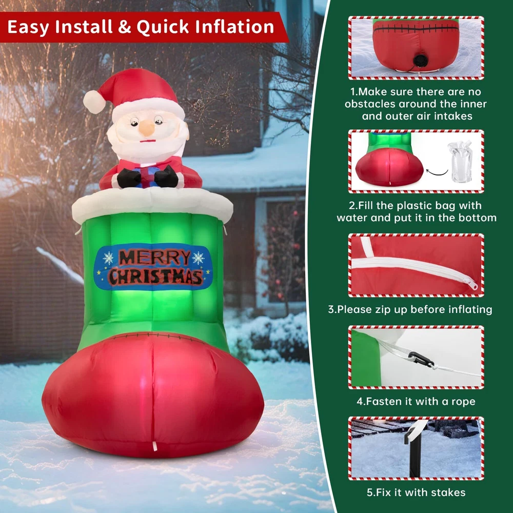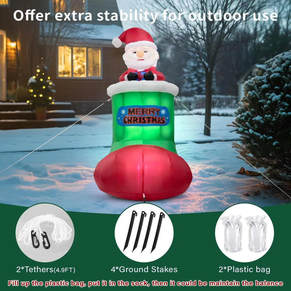 Perfect Christmas Inflatable Outdoor Decoration: Built-in 5 bright LED lights, adding an inviting glow to your Xmas decorations, making it the focal point of your Christmas decorations. No matter whether it is indoor or outdoor, day or night, in rain or snow, it always gives you a memorable Xmas holiday! Material:210T Polyester Product Size: 2.9 ft * 2.6 ft * 5.4 ft Automatic Lifting Design: The cute Santa Claus will slowly rise up and down from the Christmas stocking, which is full of a festive atmosphere and adds more fun! Raise time:25s Fall time:25s Easy to install 1. Make sure there are no obstacles around the inner and outer air intakes 2. Fill the plastic bag with water and put it in the bottom 3. Please zip up before inflating 4. Fasten it with a rope 5. Fix it with stakes Extra stability for outdoor use 2 built-in plastic bags, 4 ground stakes, 2 x 4.9ft tethers What’s more, an extended 10ft power cord also gives you more freedom to decorate anywhere, such as the yard, garden, porch, and lawn. Dazzling Christmas Outdoor Decorations: Built-in 5 bright LED lights, eye-catching designs for Santa, and Christmas stocking combination, Our Christmas inflatable decoration will brighten up your yard festively and perfect for Christmas night parties Automatic Lifting Design: With the unique auto-lift function, you will see the cute Christmas Santa moving up and down inside the stocking, which will not only be a big hit with your friends but also add more fun to your Christmas decoration Easy install & Quick Inflation: All you need to do is follow simple steps, make sure no obstacles around two air inlets, close the zipper in the rear, plug in the socket, wait for 70 seconds of inflation, and enjoy Durable Material & Weather-proof: Our 5.4ft Christmas inflatable Santa decorations are made from high-density rip-resistant waterproof 210T polyester fiber, which is waterproof, snowproof and recyclable, accompanying you every Christmas Stable & Secure Enough: Comes with 2 built-in plastic bags, 4 ground stakes, and 2 x 4.9ft tethers to keep the giant Christmas inflatables Santa Claus firmly anchored to the ground, which makes it more stable for outdoor use