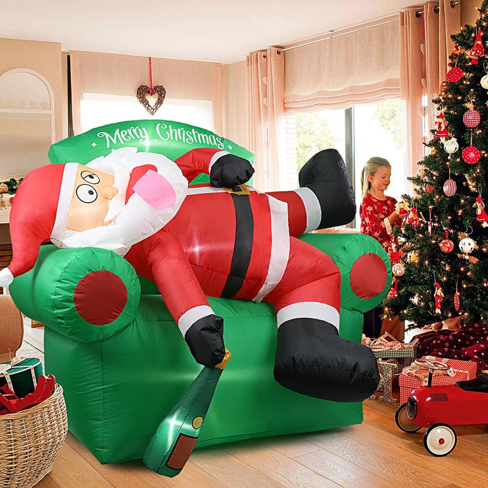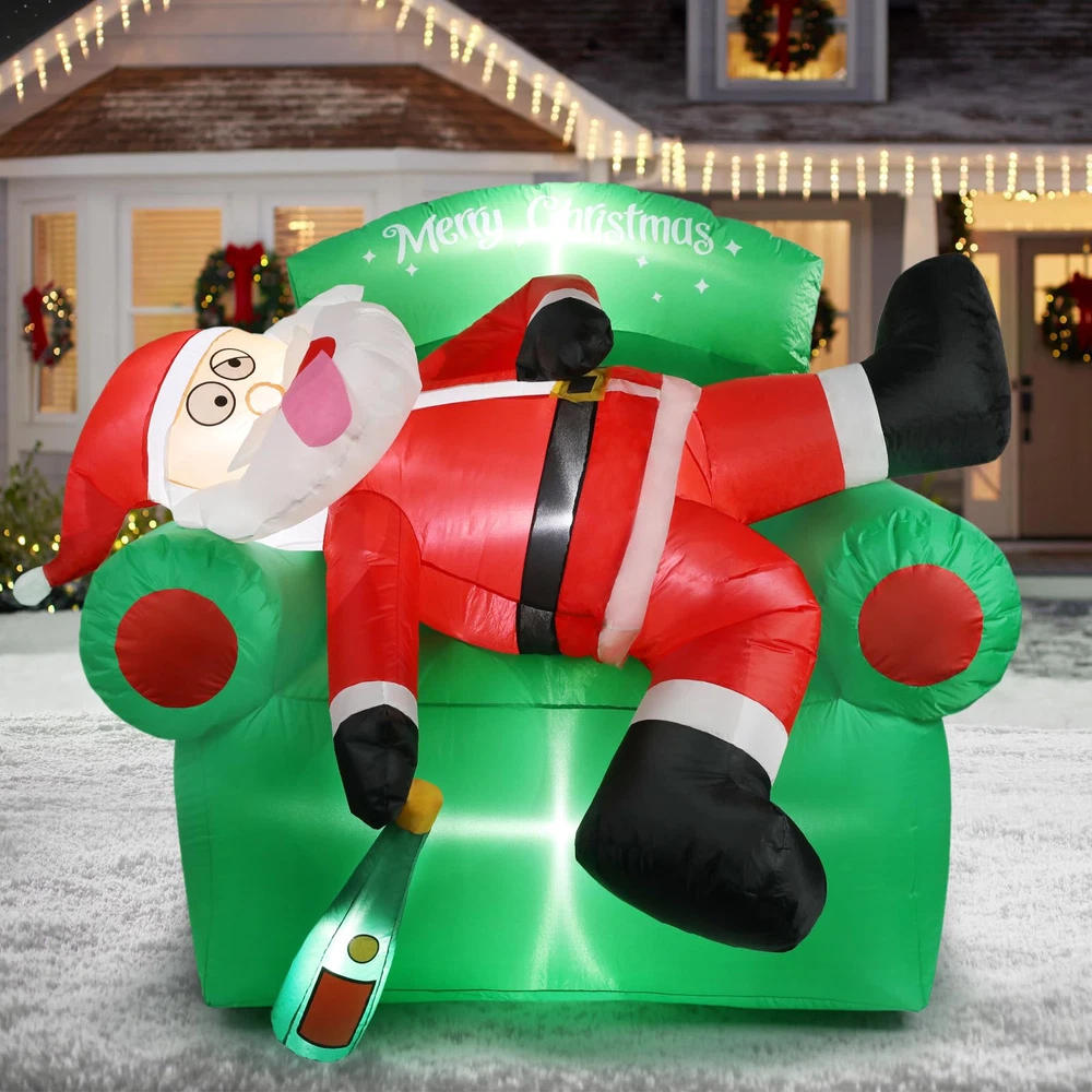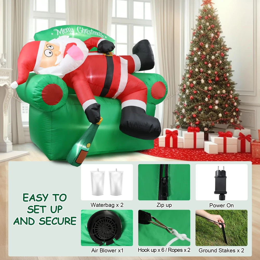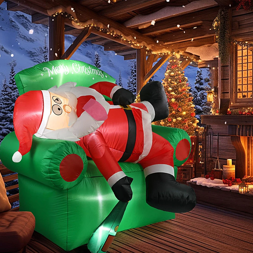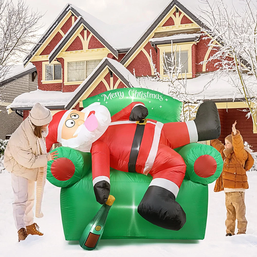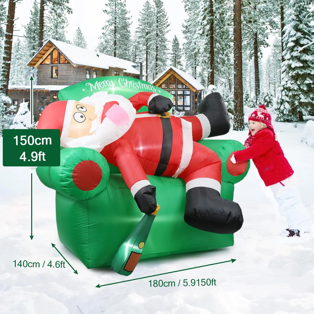 【Create Merry Christmas Atmosphere】: funny Santa Claus lying on the sofa Christmas decorations outdoor. It will bring a Exciting vibe to your outside Christmas decor. Your guests will be intrigued by its eye-catching appearance, making them feel like they are stepping into a winter wonderland. They will absolutely love it! 【Easy to Set Up】: Simply turn on the built-in fan and watch as this Christmas Santa Claus blow up yard decorations come to life in a matter of minutes. Note: Zip up the bottom and not attempt to inflate this Santa inflatables outdoor decorations during unusually strong wind and raining day. 【Funny Christmas Inflatables Outdoor Decorations】: Thanks to its weather-resistant material, this 6 FT Christmas couch decor & Santa blow up yard decorations is able to withstand wind, rain, and other harsh outdoor elements. Use it year after year to add a touch of warmth to your outdoor space during the Christmas holiday. 【Complete Accessories of Christmas blowups】: You will get not just a combination of inflatable Santa and Christmas couch inflatables, but also 2 water bladders, 3 tethers, 7 stakes for securing our Christmas tree inflatables outdoor decorations onto the ground and a detailed instruction manual. 【Widely Suit for】: Are you currently bothered about choosing inflatable Christmas yard decorations? Not only is this merry Christmas tree inflatable perfect for decorating your garden & yard, but it also works well as thanksgiving inflatables outdoor decorations. Trust me, your child will love this funny Christmas gifts for kids, order now and get ready for wonderful Christmas with child!