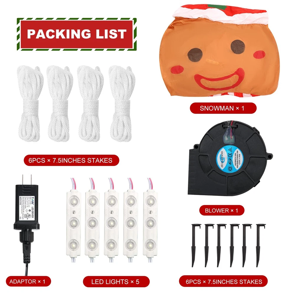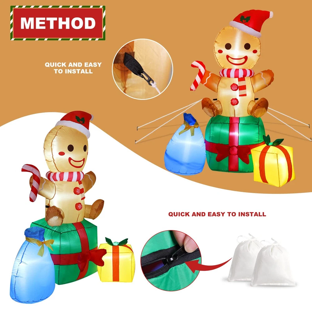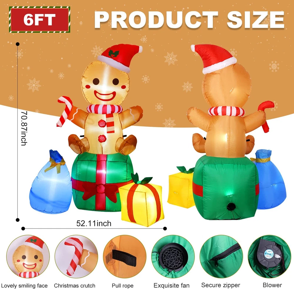 6ft tall gingerbread inflatable đ ăCute Christmas Inflatablesă- You will get a lovely 6ft high Christmas inflatable, which is a Gingerbread baby design. The Cute Gingerbread man sitting on the big gift is a unique design inflatable yard decoration. Place it in your yard will make your kids squeal with delight and make your yard a big hit around neighbors. đ ăExtra Bright LED lightsă: Extra Bright LED lights make the inflatable Christmas decoration more attractive. The inflatable decor with 5 Eye-catching bright LED lights built inside will definitely light up your lawn or garden and make your home full of festive mood, to attract neighbors and guests. Perfectly appeal to younger kids. đ ăDurable Materials QualityăThe outdoor Inflatables decoration with well sewed is made of high-quality Polyester which is lightweight and durable, weatherproof, IP44 waterproof, and fade resistant. Besides, as a lawn decoration, it is also equipped with a powerful built-in fan which can guarantee you a wonderful Christmas experience đ ăSafety and StabilityăWe provide 6 sturdy ground stakes, 4 fastened ropes, and a UL-approved plug for quick and easy setup The bottom opening has a zipper to provide extra space for adding some heavy objects to make it more secure and stable in windy weather outside (please zip up the bottom zipper when inflating, and open the bottom zipper when deflating) đ ăSatisfaction Guaranteeă2022 New style designed holiday inflatable dĂ©cor has an IP44 waterproof rating, and both UL and CE certifications. Perfect for indoors, front doors, yards, lawns, and garden decorations. Bring more festive atmosphere to your holiday and welcomes your neighborhood and friends with warm wishes.
