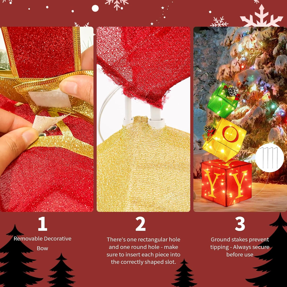 Store New Arrivals Add to Favorite View Feedback Contact Christmas Joy Lighted Gift Boxes Decorations Set of 3, 2.8Ft Stackable Christmas Description Item model number 3pcs Large Lighted Stacking boxes Item dimensions L x W x H 7 x 7 x 7 inches Color Warm White Product Dimensions 7 x 7 x 7 inches Material JOY Light Color Warm White Style Large Item Weight 2.18 pounds Theme Christmas Frame Material Metal Voltage 4.5 Volts (DC) Recommended Uses For Product Holiday Celebrations, Outdoor Decorations, Seasonal Decoration, Decoration Brand COVFEVER Manufacturer the tower of ivory Dimension: The package comes with 3 pieces of Christmas stacking boxes. Extar large:9.84*9.84*9.84, large: 7.87*7.87*7.87, medium: 5.9*5.9*5.9. The stacking height is 2.8Ft Easy to Assemble: The lighted gift boxes can be stacked up to 2.8Ft tall. Each box has a hidden round hole and rectangular slot—just match the shapes to stack them securely. (Note: The slots are discreetly designed, so check carefully!) Versatile Holiday Display: These lighted gift boxes offer 2 arrangement options - display side-by-side or stack up to 2.8ft tall. Perfect for tabletops, mantels & parties, they bring festive cheer with warm glowing lights. Set of 4 beautifully decorated boxes for stunning holiday decor Removable Bows: The bow is not attached to the gift box but placed separately inside the packaging. You can attach it according to your display needs Indoor & Outdoor Uses: This gift boxes is designed can be used outdoor display. While it includes ground stakes for stabilization, please bring it indoors during high winds or severe weather conditions(CAUTION: Do not allow children to touch or handle while stacked.) Battery Operated & Timer: Powered by 3 AA batteries(not included). Rubber Seal strip is added to our battery box. Timer means that it will light up for 6 hours and turn off 18 hours automatically everyday. The lighted gift boxes with build-in 80 LED warm white string lights, you can place it in your home to light up your house Product description Christmas Joy Lighted Gift Boxes Decorations Set of 3, Stackable Christmas Nesting Boxes Battery Operated for Home and Party Decoration Create a magical holiday display with our Christmas Lighted Gift Box Set! This 3-piece stackable decoration brings festive cheer to any space, featuring warm white LED lights and a charming nesting design perfect for homes, parties, and outdoor decor. Key Features: 2 kind of Set of 3 Nesting Boxes –Large Size includes Extar large:9.84*9.84*9.84, large: 7.87*7.87*7.87, medium: 5.9*5.9*5.9 boxes for a tiered holiday display. Standard Size includes Large: 7.48*7.48*7.08, medium: 6.3*6.6*5.9, small: 5.18*5.18*4.72 boxes for a tiered holiday display. 2 Display Options – Arrange them side-by-side for a festive tablescape or stack up to 2.8Ft (Large) or 2.6Ft (Standard) tall for a stunning centerpiece. Easy Stacking Design – Hidden round + rectangular slots ensure secure stacking (just match the shapes!). Removable Bows – Bows come separately packaged, so you can attach them based on your decor style. Battery-Operated with Timer – Runs on 3 AA batteries (not included) and features an auto on/off timer (6 hrs on, 18 hrs off) for convenience. Indoor & Outdoor Use – Includes ground stakes for stability, but we recommend bringing indoors in harsh weather. (CAUTION: Keep away from children when stacked.) 80(Large) or 68(Standard) Warm White LEDs – Creates a cozy glow for mantels, entryways, patios, and holiday parties. Perfect For: • Christmas home decor (tabletops, fireplaces, staircases) • Outdoor holiday displays (porches, gardens, pathways) • Gift-giving & party decorations • Adding festive ambiance to weddings, shops, and events Package Includes: 3 x Lighted Gift Boxes (with hidden stacking slots) 3 x Detachable Decorative Bows 4 x Ground Stakes (for outdoor stability) 1 x Battery Box (with rubber seal for weather resistance) Light Up Your Holidays! Bring warmth and joy to your seasonal celebrations with these versatile, stackable, and beautifully lit Christmas gift boxes! Why Choose Our Lighted Gift Boxes? ✔ High-Quality & Durable – Made from sturdy materials for long-lasting use. ✔ Energy-Efficient LEDs – Long-lasting warm white glow. ✔ User-Friendly – Simple assembly, no wiring needed! ✔ Great Gift Idea – A unique present for family, friends, and decor lovers. Note: Batteries not included. For best results, use high-quality AA batteries. Not suitable for extreme snow/rain—store indoors during severe weather. Removable Bows The bow is not attached to the gift box but placed separately inside the packaging. You can attach it according to your display needs Versatile Holiday Display These lighted gift boxes offer 2 arrangement options - display side-by-side or stack up to 3.6ft tall. Perfect for tabletops, mantels & parties, they bring festive cheer with warm glowing lights. Set of 4 beautifully decorated boxes for stunning holiday decor Indoor & Outdoor Uses This gift boxes is designed can be used outdoor display. While it includes ground stakes for stabilization, please bring it indoors during high winds or severe weather conditions(CAUTION: Do not allow children to touch or handle while stacked.) ABOUT US We offer the best prices around on high quality products. Our E-store includes media such as books, movies, music and games while offering electronics, toys, sporting apparel, clothing, tools, general home, garden items and more. SHIPPING We are always working hard to ensure your package arrives as soon as possible. Please understand that some factors like weather, high postal traffic, and the performance of shipping companies are outside of our control. We offer free shipping to the lower 48 states and ship within 2 business days of payment, usually sooner. We do not accept P.O. Boxes. Please provide a physical address. RETURNS We offer a 30-Day Return Policy on items which you are not completely satisfied wit