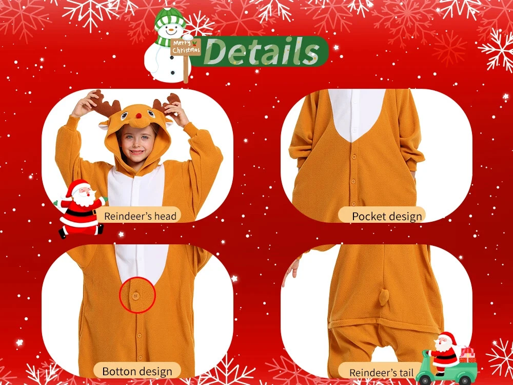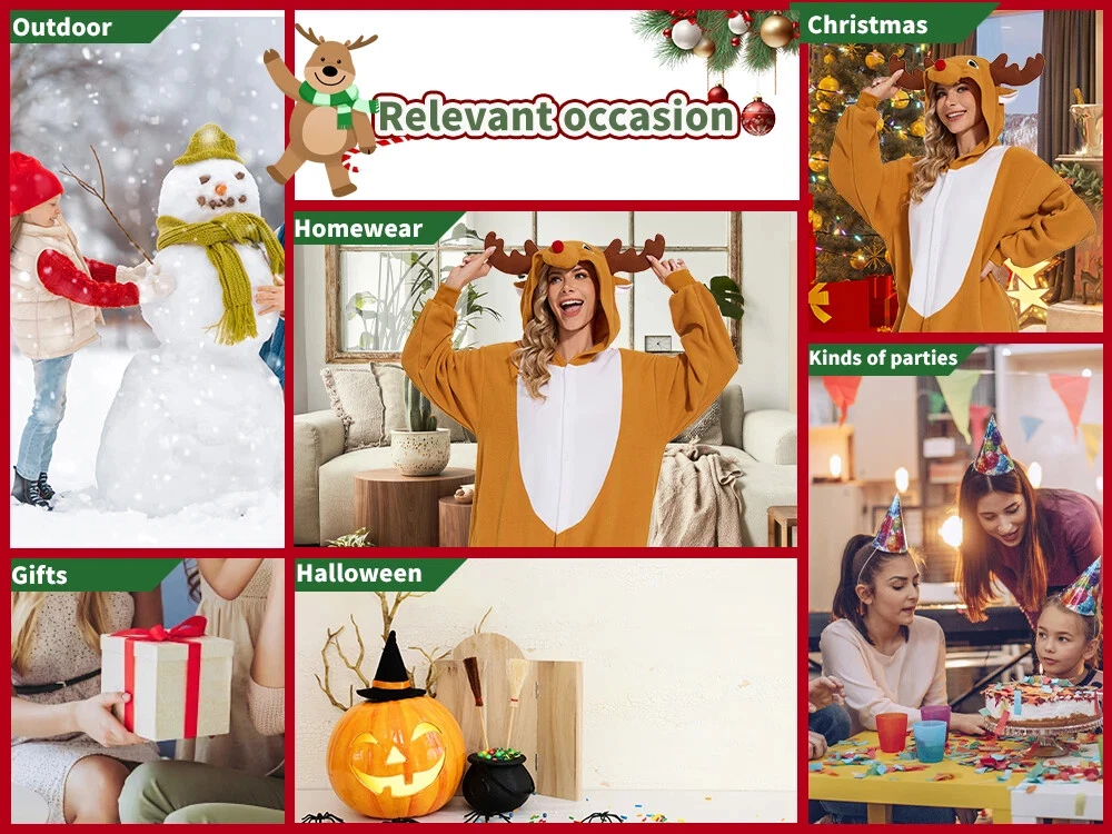 This Christmas, let's make our homes a haven of warmth, laughter and unforgettable memories - all in these festive Reindeer one-piece pajamas. Details The hat is designed according to the real appearance of the reindeer.The eyes ,noses ,antler add a touch of whimsy and fun. Front button design in accordance with the adult reindeer pyjamas. At the same time easy to button,strict thermal insulation. On the back of adult reindeer costumes,there is a lovely reindeer tail. The pockets are designed to keep your hands free and warm at the same time. Our Reindeer Onesie is crafted from soft, skin-friendly fabric, meticulously tailored to encapsulate every detail, as if wrapping you in the warmth and serenity of the northern forest. Occasions On chilly winter evenings,our Reindeer matching onesie for couples provide extra warmth and coziness.Whether watching a movie, reading a book,or simply relaxing in bed, the material keeps one comfortably warm. On lazy weekend mornings or afternoons, the Reindeer pyjamas are perfect for lounging around the house, doing nothing in particular, and simply enjoying the comfort of being cozy and warm. On holidays like Christmas or Halloween, our Reindeer one-piece cosplay sleepwears add atmosphere to a simple holiday.You can wear it to take fun photos with your family and make many fantastic memories. When you just need to run a quick errand, like checking the mailbox or grabbing a few items from the store, the pajamas can serve as a casual and comfortable outfit. Our adult Reindeer suits are also the best gifts for lovers, family and friends during Halloween and other holidays.