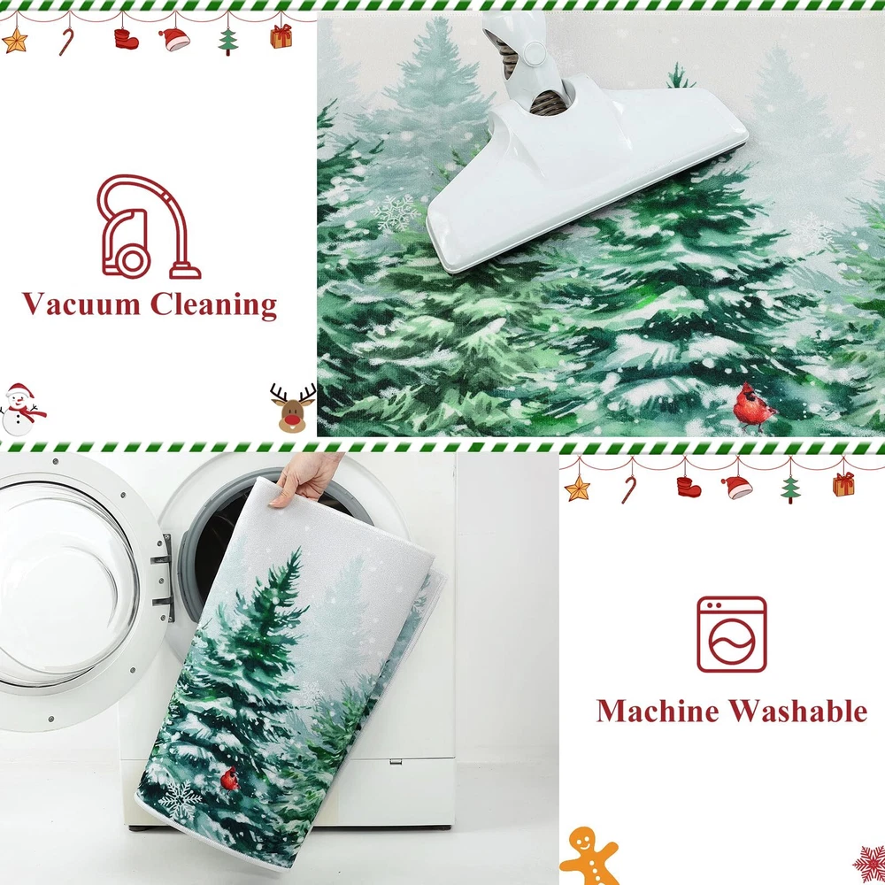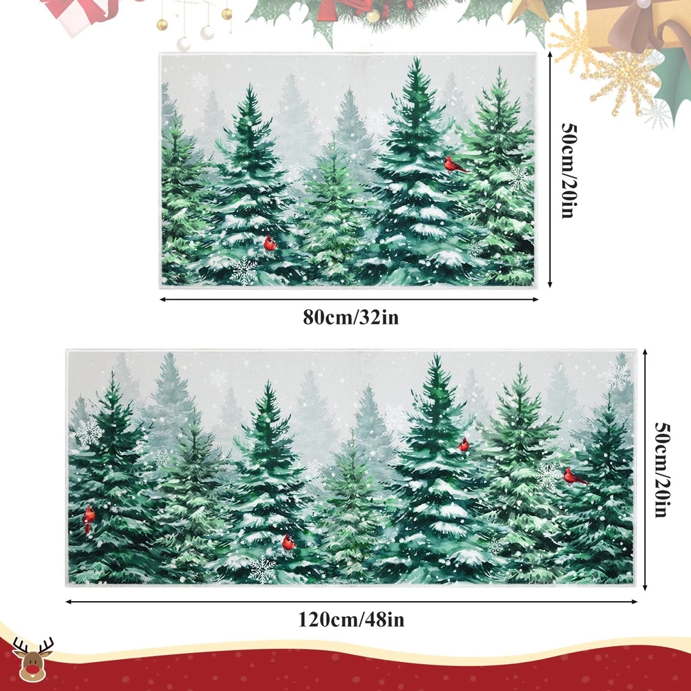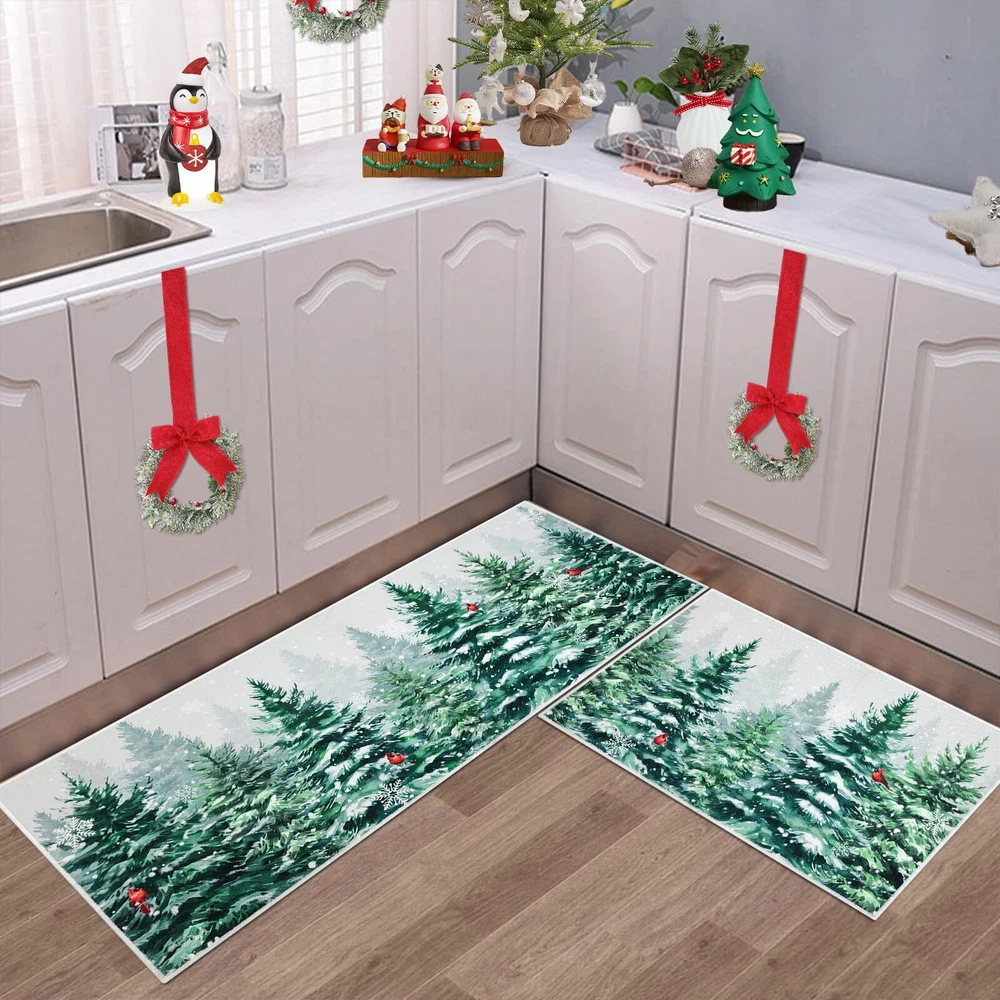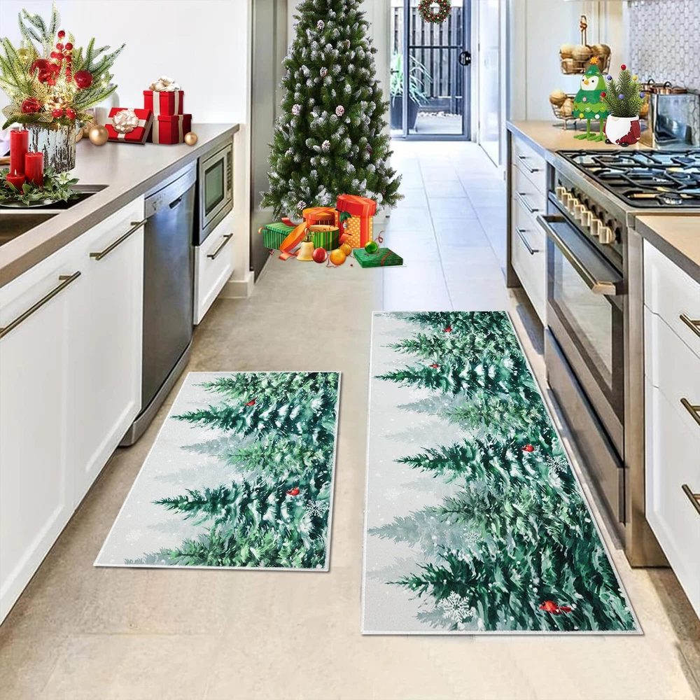 Perfect Size & Flat - Measuring 20x32+20x48inch, our Christmas kitchen rugs fits perfectly in front of your kitchen or entrance. Featuring a 0.2-inch slim profile, our kitchen mat is flat with no sides curling up, This kitchen carpet is perfect for any place in your house Christmas Theme Design - Our winter Christmas kitchen rugs design - snowflake and Xmas pine tree, which will help you increase the festive atmosphere, nice and beautiful festive decorations for home kitchen indoor and outdoor Durable and Non-Slip - Backed with non-slip recycled TP rubber and topped with polyester that is low-profile to reduce chances of tripping, high-quality durable construction that is stain resistant Easy to Care - Our washable Christmas rugs make maintenance easy. Vacuum cleaners can be used regularly for daily cleaning to prevent dust and debris from entering the fibers. You can also use a washing machine and dryer or hand wash for deep cleaning Multiple Uses - Make your kitchen more stylish and comfortable with these durable, unique, seasonal kitchen mats. Add a pop of color in the entryway and protect your floors too. Perfect for any kitchen, deck, patio, porch, veranda, bathroom, laundry room and entryway