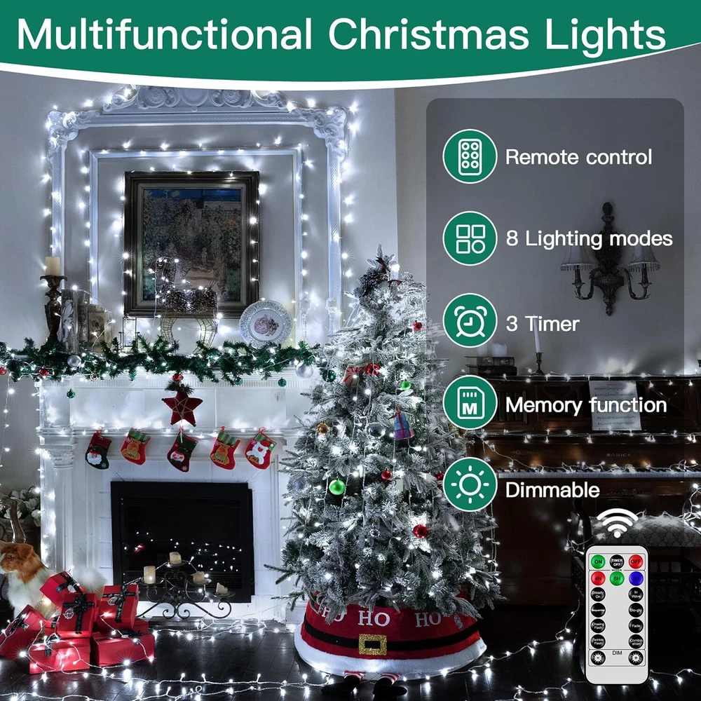 Ultra Long Christmas Lights: 328FT 1000 LED christmas outdoor lights with a 10ft extension cord; enough to decorate every corner of your house, patio, garden, yard, Christmas tree, party, birthday, outside and indoors 8 Modes & 4 Brightness Adjustments: Our Christmas lights have 8 Lighting Modes and 4-level brightness adjustments. Different modes are suitable for various occasions, you can switch them by the remote control or the adapter according to your needs Remote Control & Timer: christmas lights come with a remote control with a time and memory function. You can choose the right timer option that suits your life habits. Lights will auto on/off once set Widely Used: IP44 waterproof design of this Christmas light, 100% protected against solid objects like dust and sand. And fun for your family at Christmas, Thanksgiving, Birthdays, Weddings, and Anniversary Safe & Flexible: Christmas lights have passed the UL588 certification; which enough safe to use. Christmas outdoor light wire made of PVC and copper is durable and flexible, and can be folded and bent arbitrarily, easily builds the shapes you want