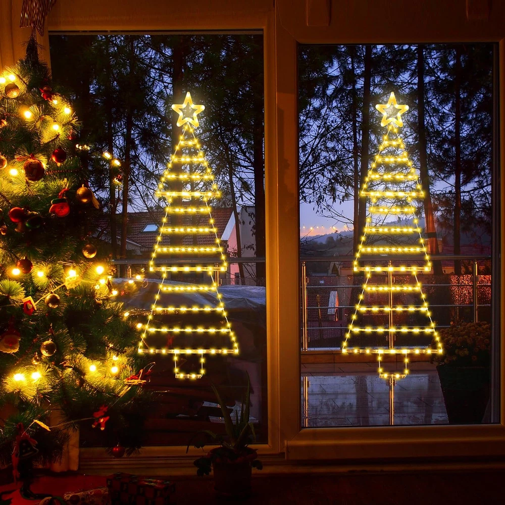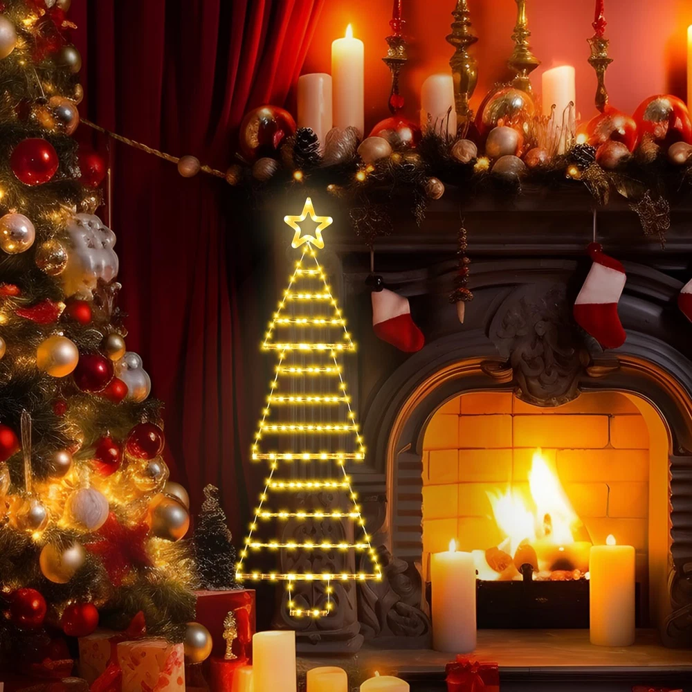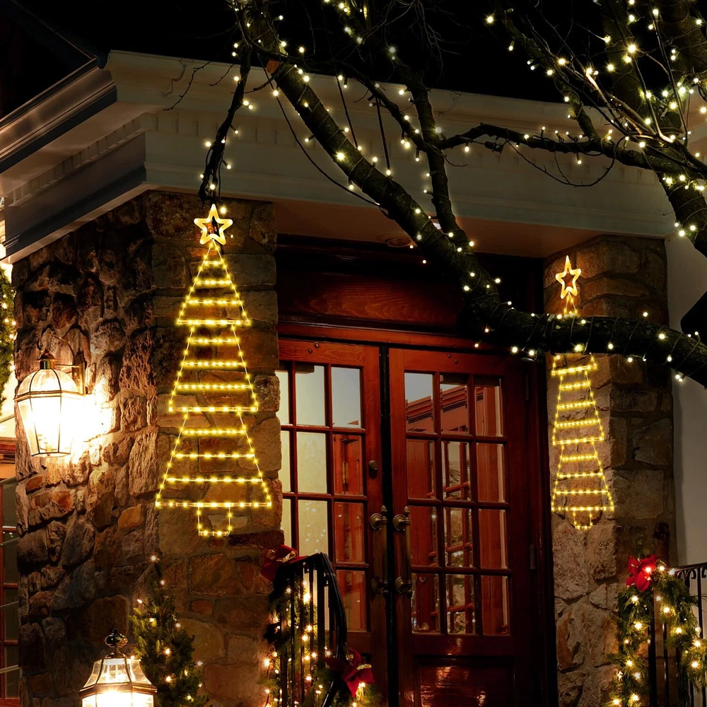 2024 Newest Christmas LED Ladder Lights: Unique Designed Christmas light consists of a 4.4 FT long illuminated rope ladder shaped like a lighted Christmas tree, with a star at the top, funny and cute, it will add a lot of festive atmosphere for your Christmas. Novelty Christmas Decor: Simply hanging the Christmas tree light indoors or outdoors with the included hook, the lights will create a warm and festive atmosphere for your holidays, it's perfect for your home, garden, yard, roof, window, porch, Christmas tree DIY decor. Impressing your neighbors and friends! 8 Lighting Modes & Memory Function: LED Christmas ladder lights come with 8 different lighting modes including steady on, twinkle, flashing and more, you can create the desired Christmas ambiance. The built-in memory chip, which will save your last mode setting. No need to reset mode every time. IP55 Waterproof: The Christmas window decorations lights are powered by 30V low voltage, safe to touch. Constructed with waterproof materials, it's suitable for indoor and outdoor use during the holiday season. (Note: The plug is NOT waterproof, keep it away from water.) Ideal Christmas Gift Choice: 4.4ft height Christmas tree lights with 189 pcs LED, 16.4ft lead wire, perfect for decorating Christmas trees, windows, bedrooms, living rooms, fireplaces, lawns, great gift for Valentine's Day, Christmas, Thanksgiving day and more.