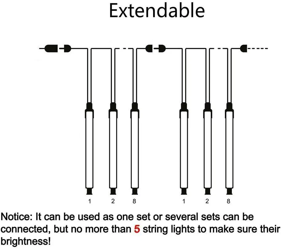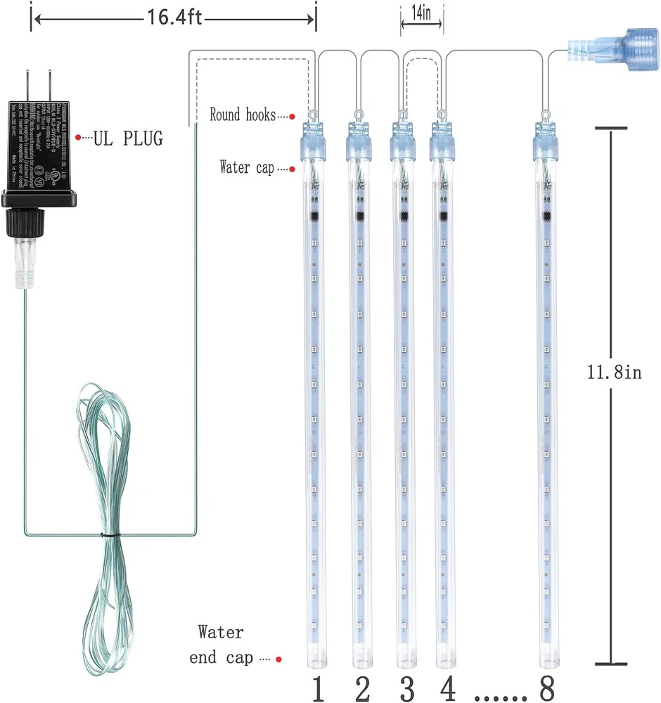 Kwaiffeo Christmas Lights Outdoor, 8 Tubes Meteor Shower Lights LED Snow Falling Icicle Cascading Lights for Xmas Tree Wedding Decoration Party, UL Plug, White Item Description 【Romantic Meteor Shower Lights】Led falling rain drop lights, the light of every bulb turns on and out one by one in sequence and quickly just like meteor shower or falling snow in the night sky, very beautiful. These icicle string lights can be used as one or be connected (The best effect is to connect 3-4 strings). If the whole light with 8 tubes can't come light when you connect many sets, pls check the female and male connectors are linked correctly. 【High Quality & Energy Efficient】Dust proof, corrosion resistant, cost resistant, aging resistant, more durable. Made of premium PC material that is transparent, you can see the white glow clearly through the tube. The dripping icicle lights outdoor is IP65 waterproof, ideal for indoor & outdoor decoration, please protect the plug from water on heavy raining day. 【Brighter & Specs】Kawiffeo Christmas string lights is brighter and have longer lifespan, 192 LED beads are attached on both two sides that can provide 360 degree lighting. Tube length: 12 inch; tube quantity: 8 tubes; length of power cord: 16ft; total length of 8 tubes: 10ft; voltage: 110V 【Wide Application】These LED falling snow lights outdoor are perfect to decorate trees along street/park/ river, hang along the roof, great for market engineering lighting, urban and architectural beautification. Ideal for patio, yard, garden, hotel hall, shopping mall decoration, suit for Halloween, Christmas, New Year, Wedding, Party, Holiday, Valentine's Day, Thanksgiving Day, Business Celebration and any celebrating time. 【Safe Guarantee】Authoritative UL certified, powered by 7V low voltage that is lower than human body safe voltage for safe use, definitely no risk of electric shock. The LED beads are low consumption and energy saving, no overheat after long time using, no risk of fire. Just plug it into the socket to turn the meteor lights on, unplug to turn it off, super easy to operate. These icicles are all powered by its own IC chip and falls at random to make a pretty display, act like a meteor shower or falling snow crosses the sky. They add a nice touch to your outdoor decorations, you can hung them from a multi-branched tree in front yard, and the more you string them together, the more spectacular they look, for example, you can connect about ten sets on the tree, they will be very impressive and cool to watch. I'm sure you'll get compliments from your neighbors if you decorate your Christmas with them, they are perfect Christmas lights and Christmas decoration outdoor. Payment Free Worldwide Shipping Shipping safe payment via paypal . Return 30 Day's returns
