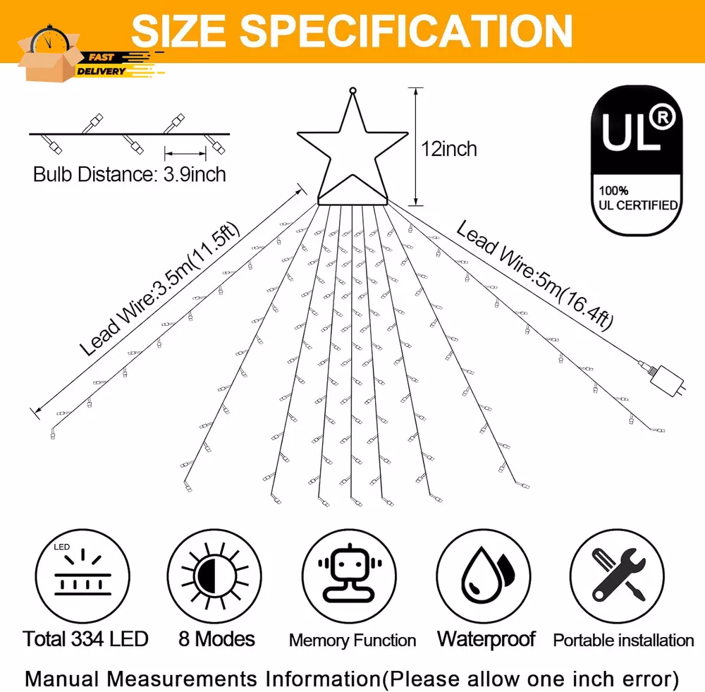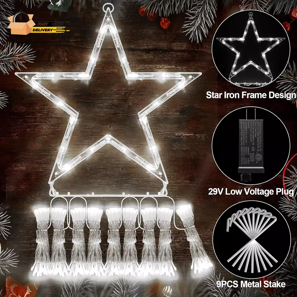 Store New Arrivals Add to Favorite View Feedback Contact Christmas Lights Outdoor Decorations 344 LED Star Lights Easy to Install Waterproof Fairy String Lights 8 Modes Xmas Tree Lights for House Garden Party Wedding Holiday-Cool White Description Item model number BG-CL3M3-306L01 Part Number BG-CL3M3-306L01 Style Modern Material Polyvinyl Chloride (PVC) Power Source Corded Electric Color Cool White Number of Light Sources 344 Type of Bulb LED Batteries Required? No Item Weight 1.63 pounds Theme Christmas, Halloween, Thanksgiving Batteries Included? No Voltage 29 Volts Shade Material Metal Package Dimensions 13.39 x 12.4 x 2.24 inches Size 344LED 8 Modes Christmas Decoration Star Lights: The outdoor Christmas decoration star lights feature 344 LEDs, 1 metal star and 9 strings of lights at the end, each 11.5 feet long, resembling a comet. The twinkle Christmas lights are ideal for your outdoor and indoor decorations. Light up your home or backyard with this Christmas light display. 8 Lighting Modes & Waterproof : The Christmas star lights have 8 different light patterns: Combination, In Wave, Sequential, Slo-Glo, Chasing/Flash, Slow fade, Twinkle/Flash, Steady on. IP44 waterproof is perfect for outdoor use without any damage, including heavy rain and snow. Safe & Easy to use: Directly plug in and unplug the outside Christmas decorations star lights for power on and off. With a 29V low voltage adapter, this Christmas starlight is safe to touch and will keep at a low-temperature state after lighting up for hours, safe, power-saving, and eco-friendly. Ideal Gift & Decoration Choice: Christmas tree string lights with stars can be used as large outdoor tree ornaments, as a Christmas present for your family, friends, birthday, wedding, anniversary, etc. The beautiful Christmas tree lighting creates a better festive atmosphere and is the best choice for indoor and outdoor Christmas decorations. Upgraded LED Super Bright Christmas lights: Equipped with latest upgraded LED, The Christmas lights offers super bright light to add amazing atmosphere to decorate your holiday. With unique PVC intensified cord material, The fairy lights is strong, non-flammable and resistant to weather changes. LED beads are made of high durability and the energy efficiency material, saves up to 90% energy compared to traditional incandescent bulbs and last for at least 10 holiday seasons. Product Description JXLEDAYY Outdoor Christmas Decorations Star Lights Widely application: Perfect for yard,patio, garden, eaves, wall, window, bedroom, living room, wedding, party, birthday, Christmas, New Year, Festival decor etc. Features - Long wire: These lights work great with Christmas trees from around 8 feet to 13 feet tall. - Waterproof: It's IP44 waterproof, but the junction box has to be kept in a dry place. - Safe to Touch: The bulbs don’t heat up, which allows you to touch them anytime. - Memory function: It's easy to set the lighting in the previous mode without resetting it. Package Include: 1 x star string lights, 1 x adapter, 1 x User Manual ,9 x Metal insert Specification Product Name: 344 LED Christmas String Light LED Color: Cool White Material: Copper+plastic LED Quantity: 344 Waterproof grade: IP44 Mode: 8 Lighting Modes Wire Length: 5m(16.4ft) Memory Function The built-in memory chip of the Christmas decoration star lights can save your last mode setting, and there is no need to reset the mode every day. Safe Touch 29V Low-voltage plug, through the UL authoritative certification, long working hours also do not heat, people can safely touch. IP44 Waterproof The Christmas decoration star light reaches IP44 waterproof rating, can withstand light rain, perfect for outdoor indoor decoration. ABOUT US We offer the best prices around on high quality products. Our E-store includes media such as books, movies, music and games while offering electronics, toys, sporting apparel, clothing, tools, general home, garden items and more. SHIPPING We are always working hard to ensure your package arrives as soon as possible. Please understand that some factors like weather, high postal traffic, and the performance of shipping companies are outside of our control. We offer free shipping to the lower 48 states and ship within 2 business days of payment, usually sooner. We do not accept P.O. Boxes. Please provide a physical address. For shipping outside of the continental USA, we only use eBay's Global Shipping Program.The item is shipped to KY and then sent to the rest of the world. International customers are responsible for all duties and taxes. Continue to check out in order to calculate costs for shipping the item to your country. Messages regarding eBay's Global Shipping Program MUST be directed at eBay EXCLUSIVELY. RETURNS We offer a 30-Day Return Policy on items which you are not completely satisfied with. You have the option for a full-refund or an exchange of the item. No returns are available on items shipped outside of the USA. PAYMENT We accept PayPal. CONTACT US This page content is yet to come Please ad us to your favorite seller and visit again later Thank You CUSTOMER SATISFACTION We try our very best to make sure every customer is completely satisfied. If there's a problem, message us! We're happy to help. WE ACCEPT Copyright © 2021 AutoDS. | All Rights Reserved