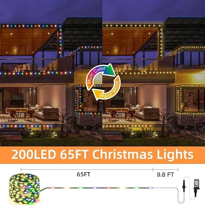 Design: Bulb IP Rating: IP67 Output Voltage: 120 V Theme: Tree, home, Christmas Style: Modern Voltage: 120 V Light Color: Warm White Power Source: Corded Installation Area: Outdoor Occasion: Anniversary, Chinese New Year, Christmas, New Year's Material: Copper Size: 200LED-66FT Features: Color Changing, RGB, Waterproof, With Light, With Remote Control Country/Region of Manufacture: China Lighting Technology: LED Type: String Light Brand: Anycosy Cord Color: Multicolor Energy Star: A++ Number of Lights: 151-200 Color: Multicolor