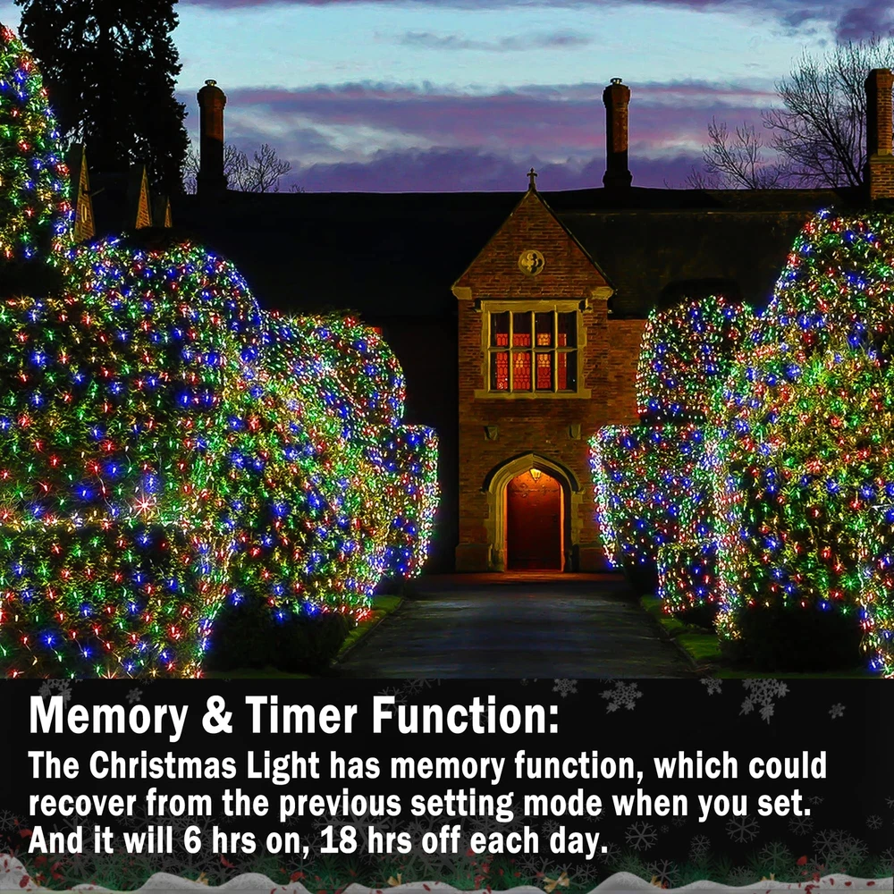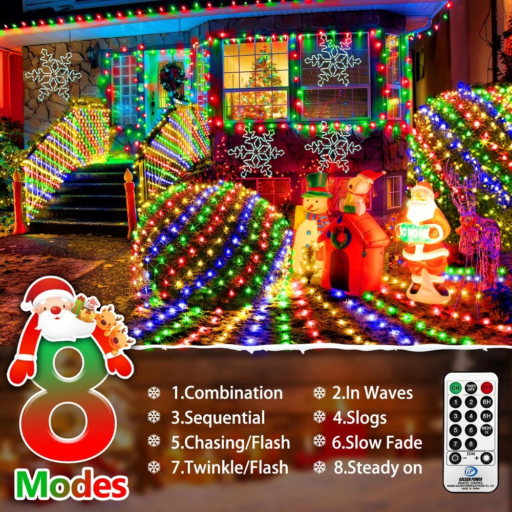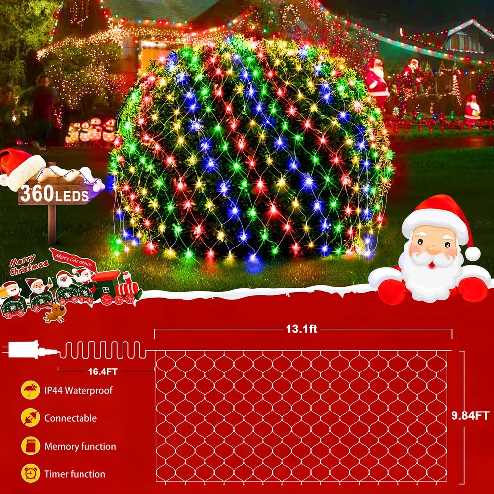 【Easy to Install & Safer】Easy to use and cover a lot of area in either horizontal or vertical spacing. Keep these up all year, they case a perfect warm soft surrounding light for our Trees, Hedges, Bushes, Fence, Yard, Balcony, Backyard, Wall, and more. UL Listed Plug and Low-temp LED bulbs ensures safe to touch even after long time use. Allows you to save time and effort. Safer to use! Connectable & Widely Use:360 LED net lights size is 13ft*9.8ft with 16.4ft lead cable. Come with a waterproof end-to-end connector, that connects up to 3 strands to meet your needs for large or small area decor. Easy to cover bushes, grassland, treetops, walls, hedges, shrubs, fences, railings, windows, balcony, add a relaxed and romantic ambiance to your Easter, Halloween, Xmas, party, camping, wedding and room. Christmas Net Mesh Lights:The biggest advantage of this net light is its unique fishing net design and easy installation, saving you the hassle of winding decorations. Whether it's for lawns, shrubs, gardens, windows, or balconies, you simply need to spread out the net light and turn on the switch, and it will become a beautiful sight. The net light features a built-in fishing net shape, making it very eye-catching. Enjoy the charm and fun that this delightful net light brings you! 8 Lighting Modes & Memory Function:Outdoor mesh lights are available in 8 lighting modes, including steady on, In Waves, Sequential, Slo-Glo, Chasing/Flash, Slow Fade, Flash, and Combination, which will create a cozy & romantic atmosphere for you or your family. The LED net lights built-in memory chip saves your last mode's setting, no need to reset every day! Timer Setting & Dimmable:Press DIM+/- button to adjust the brightness level ( 100% 75% 50% 25% ), you can choose the brightness that makes you feel most comfortable & happy.And 3 Timer Setting modes can custom your time by remote control. 6 Hrs on, 18 Hrs off; 8 Hrs on ,16 Hrs off; 6 Hrs on, 6 Hrs off, 3 Hrs on, 9 Hrs off. Safely Install & Waterpoof:These outdoor mesh string lights have passed the authoritative UL588 safe certification,and a 29V low output voltage will not overheat after long time use. It is safe for children and pets. The net lights made of of IP44 Waterproof design to make sure a long lifespan, perfect for rainy/snow weather and humid environment.