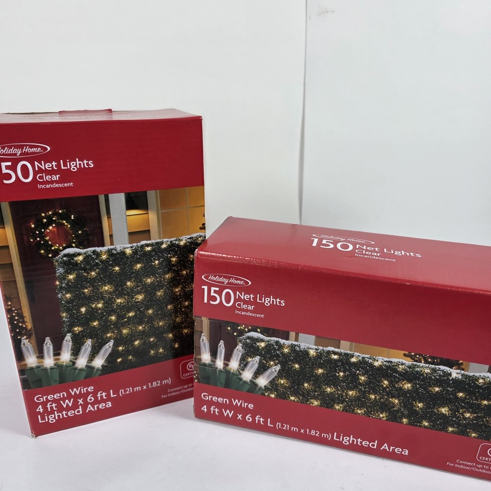 Lot of 2 – Holiday Home 150 Clear Net Lights (Green Wire) Perfect for easy outdoor decorating! These net-style Christmas lights make covering bushes, hedges, railings, and shrubs quick and uniform. Product Details: Brand: Holiday Home Quantity: 2 Boxes (Lot of 2) 150 Clear Incandescent Lights Per Set Net Size: 4 ft x 6 ft (1.21 m x 1.82 m) Wire Color: Green UL Certified Connect up to 6 sets Indoor / Outdoor Use Condition: New in box. Boxes may show light shelf wear from storage. Lights have not been tested due to sealed packaging. These are great for: Bushes & hedges Porch railings Christmas décor Holiday yard displays Quick, even light coverage Net lights save time compared to traditional string lights and provide a clean, professional look. Ships securely packaged.