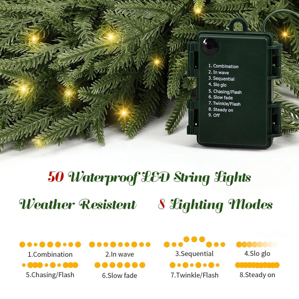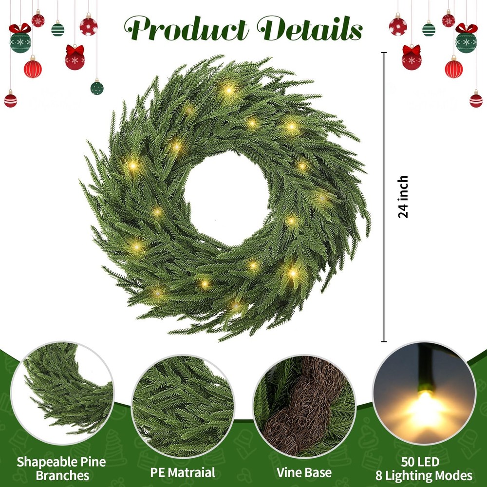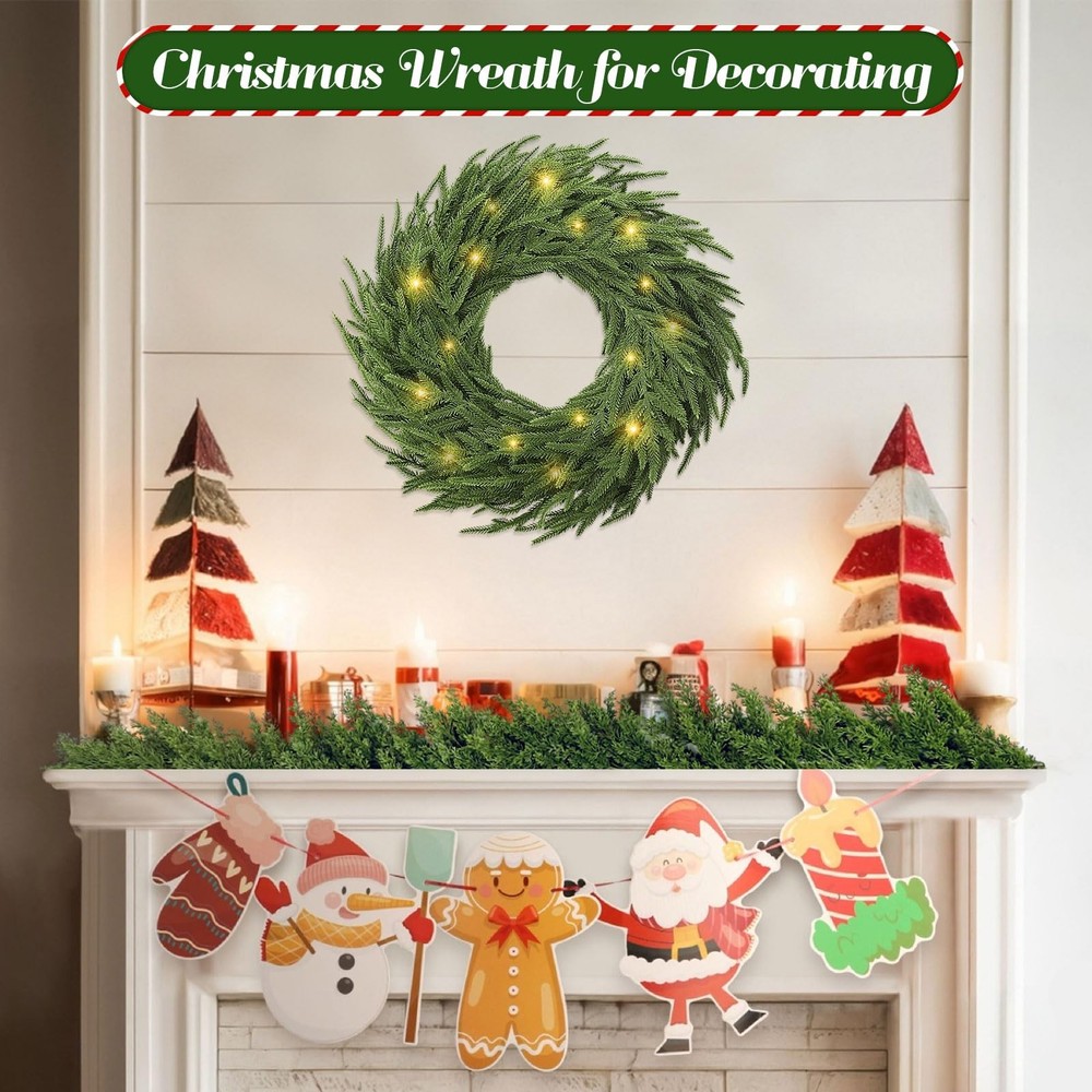 Real Touch Christmas Wreath: 24" pine wreath offers a realistic design, handmade with care. Compared with other Christmas wreaths for front door, this 24 inch Christmas pine wreath is fuller, more layered and more realistic.The real touch large artificial green Christmas wreath is as lifelike as a pine tree in nature Real Touch Christmas Wreath: 24" pine wreath offers a realistic design, handmade with care. Compared with other Christmas wreaths for front door, this 24 inch Christmas pine wreath is fuller, more layered and more realistic.The real touch large artificial green Christmas wreath is as lifelike as a pine tree in nature 50 Warm White LED Lights 8 Lighting Modes : Choose from 8 lighting effects, including combination, wave, sequential, slow glow, chasing/flash, slow fade, twinkle/flash, and steady on-to match your holiday mood. This battery operated garland with lights equipped with 50 long-lasting warm white LED fairy lights (up to 30,000 hours), this lighted garland indoor delivers a soft, welcoming glow for cozy holiday evenings. The waterproof battery box (requires 3 AA batteries, not included), cordless operation for both indoor and outdoor decorating-no outlet needed Natural and Vivid Pine Wreath: This artificial pine wreath is made from quality polyethylene (PE) materials and features a sturdy grapevine base for durability. The 24 inch Christmas wreath outdoor stems and leaves with dark green and tender green interlaced , which is astonishingly realistic. The branches have clear textures, allowing the Christmas cedar wreath to get rid of the stiff and plastic feel of artificial plants Outdoor Christmas Decorations Yard: Designed to withstand outdoor conditions, the Christmas door wreath is resistant and fade-proof, making it the perfect choice for outdoor wreaths for front door displays. It can handle wind, rain, and snow, so your wreath stays vibrant and beautiful no matter the weather Perfect Holiday Accent for Every Celebration: Add a decorative touch to festive occasions with this warm light Christmas wreath for mantle, ideal for holiday dinners, themed parties, seasonal photo backdrops, or retail displays. Whether arranged as a table centerpiece, draped along reception desks, or wrapped around indoor columns, it instantly enhances your space with classic Christmas style and joyful atmosphere