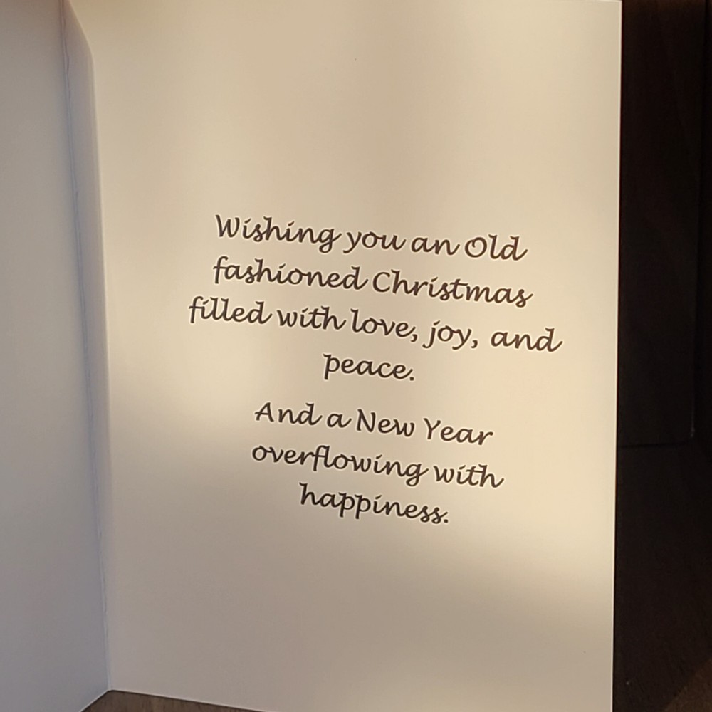 Inside Card: Wishing you an Old fashioned Christmas filled with love, joy, and peace. And a New Year overflowing with happiness. Quantity: 10 Christmas cards and white envelopes. Cards and envelopes are packaged 2 to a cellophane bag for protection. Size: 5x7 folded cards. Matt finish on front and interior. Veteran and family owned small business Our cards are designed and printed in the western United States. We take pride in our work and want to make sure that the card your friends & family receive is the best.