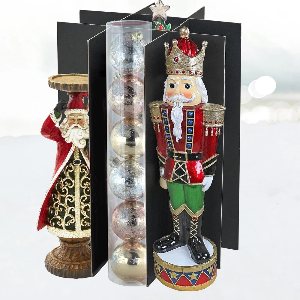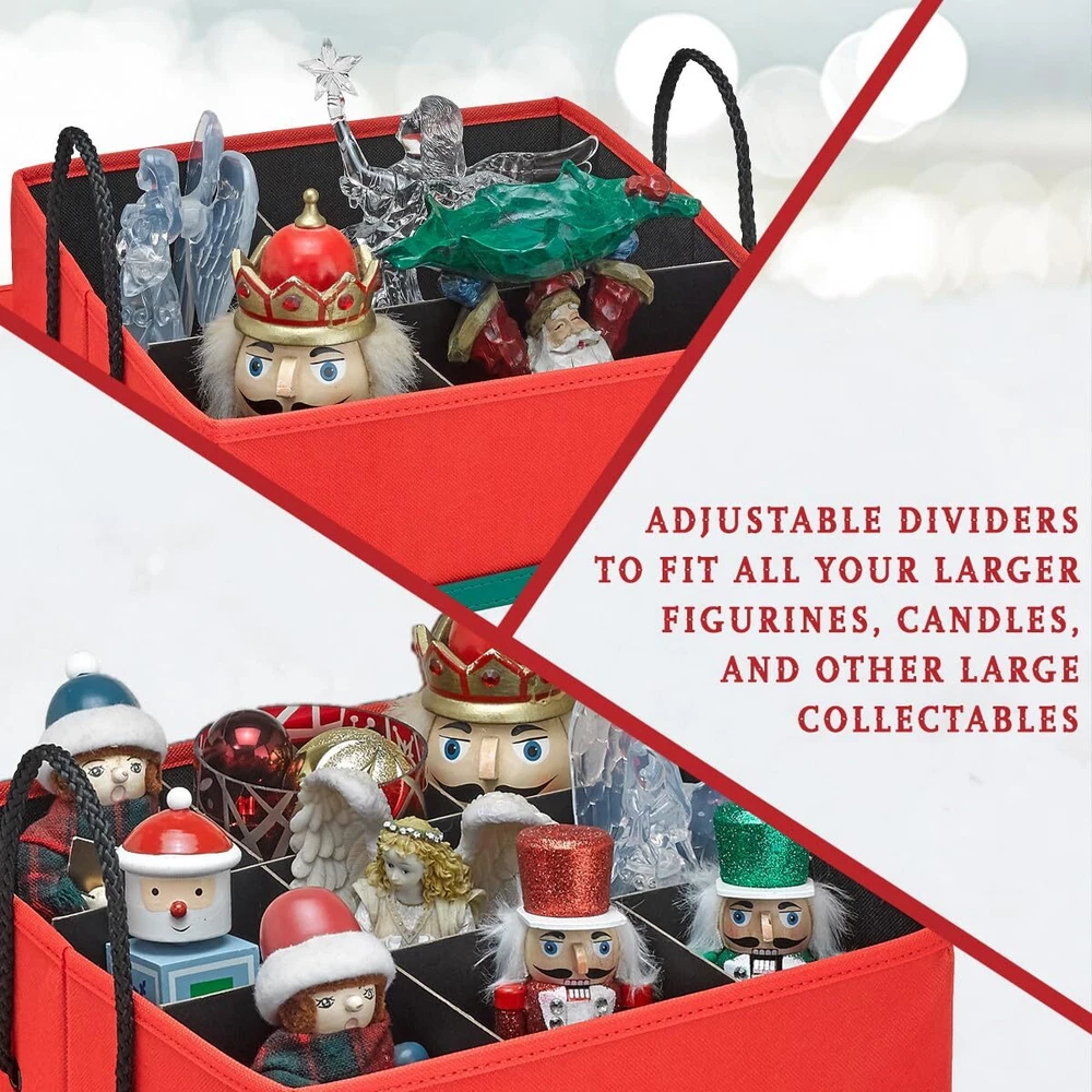 Premium Nutcracker and Figurine Collectible Storage Box Santa, Nutcrackers, and nativity scenes are a few of the most cherished decorative items for the holidays. You probably have a treasured collection passed down from family members or gifts from loved ones. While they are lovely to display, they can also be the most fragile to store. Protect these adored keepsakes in a container that will surely keep them in good condition year after year. Adjustable & Versatile - Accommodate Up to 9 Nutcrackers or Figurines That Measure 16-inches Tall Our Nutcracker and Figurine Collectible Storage Box is designed to preserve your favorite collectibles while keeping them organized. This 17” x 12” x 12” container can accommodate up to 9 figurines that measure 16 inches tall. Adjustable dividers allow you to customize according to your needs. The same dividers are wrapped in acid-free material that will prevent the contents from being damaged or discolored. Nutcrackers and figurines are not included Quality Craftsmanship in Every Detail We have designed the storage box as a better option to storing your figurines in tissue paper and flimsy boxes or plastic bins. The handles on the side allow for easy transport, the clear identification card slot enables you to label the contents and the color makes it easily identifiable from your other storage cases. The HOLDN STORAGE Holiday Decor Storage Bag aims to solve your problems and make life easier for you so that you can spend less time stressed & more time relaxing and enjoying the holidays with your family, friends and loved ones. That's why customer satisfaction is the cornerstone of our business so you can be confident that your satisfaction is always our top priority We stand behind our products 100% and are committed to fulfilling our customers’ needs. If you are unsatisfied with your purchase, get in touch with us and we will be more than happy to assist you. PROTECTS AND ORGANIZES: Storing your holiday decor once the holidays are over should be given the same care and thoughtful consideration as to when you were displaying them. Family heirlooms, rare, or one-of-a-kind figurines should not be kept in flimsy boxes or loose plastic bins that are not always reliable. What you need is our Nutcracker and Figurine Collectible Storage Box to keep them safe year after year. Nutcracker NOT included. DESIGNED FOR FRAGILE NUTCRACKERS & COLLECTIBLES: Measuring 17” x 12” x 12”, our storage box can fit up to 9 collectibles and figurines with a maximum height of 16 inches. You can significantly reduce the need for more storage containers since you can store several pieces in just one case. Keep similar items in each box so you can easily keep track of when it's time to put them on display again ADJUSTABLE DIVIDERS: Storage case comes with 4 dividers that you can customize. If you have figurines or nutcrackers that are bigger or bulkier, you may choose to use only 2 of the dividers providing you 4 - 6-inch compartments. For smaller items, use all 4 of the dividers and you'll have 9 individual slots measuring 4 inches each. You won't find this option with ordinary holiday storage boxes or bins! SECURE STORAGE SOLUTIONS: With our storage container, we are not only offering you convenience but also peace of mind as well. Your prized figurines and collectibles will be protected from dust and dirt while in storage. The acid-free dividers will prevent any discoloration and damage keeping your favorite decor looking as good as the first time you brought them out on display AN IDEAL CHOICE THIS HOLIDAY SEASON: Not just for figurines and collectibles, this storage box is appropriately sizes so that you can use our storage box for other holiday decor throughout the year. It can also be used for ornaments and dolls. Without the dividers, you can store lights, garlands, tree skirts, and more. The clear slot on the exterior of the box allows you to label the contents so you'll know at first glance what it holds