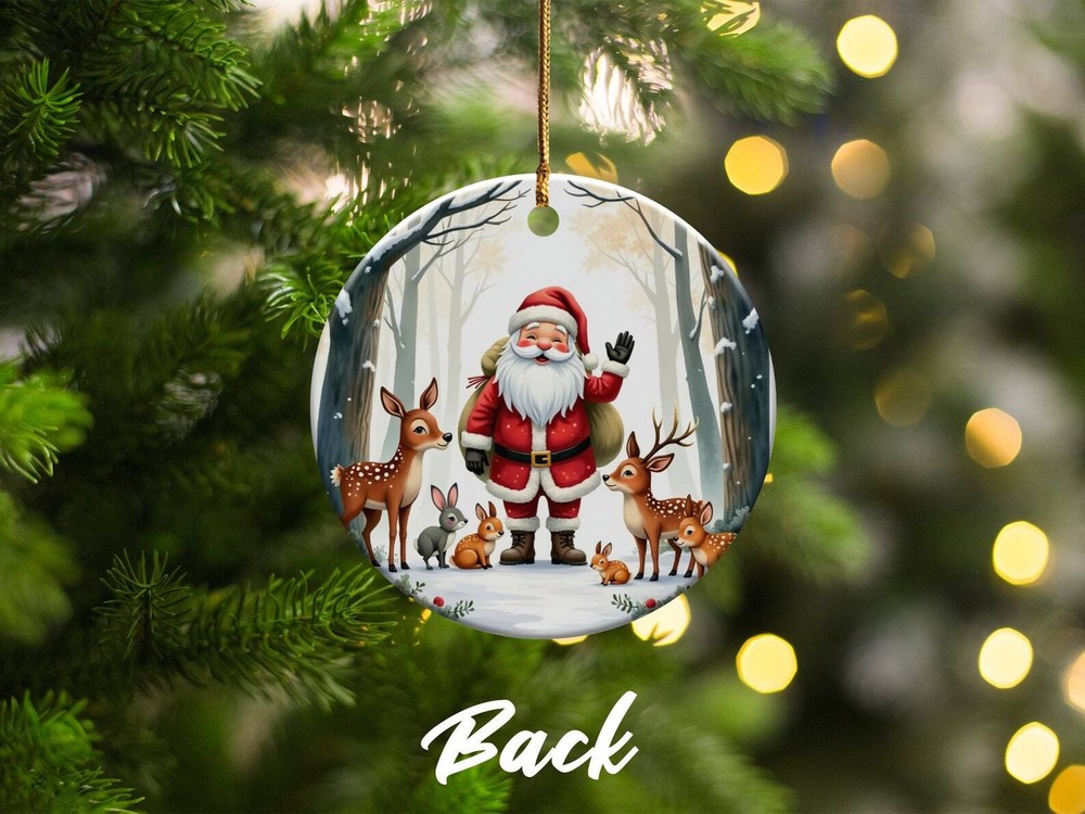 Christmas Ornament Santa And Woodland Animals Festive Holiday Decoration Santa Claus With Deer And Bunnies Tree Decor Material: Ceramic Color: White Shapes: Circle, star, heart and oval Can be printed on both sides Imprint full-color artwork, photos, or logos Hole for hanging string and hanging string included Printed in the USA