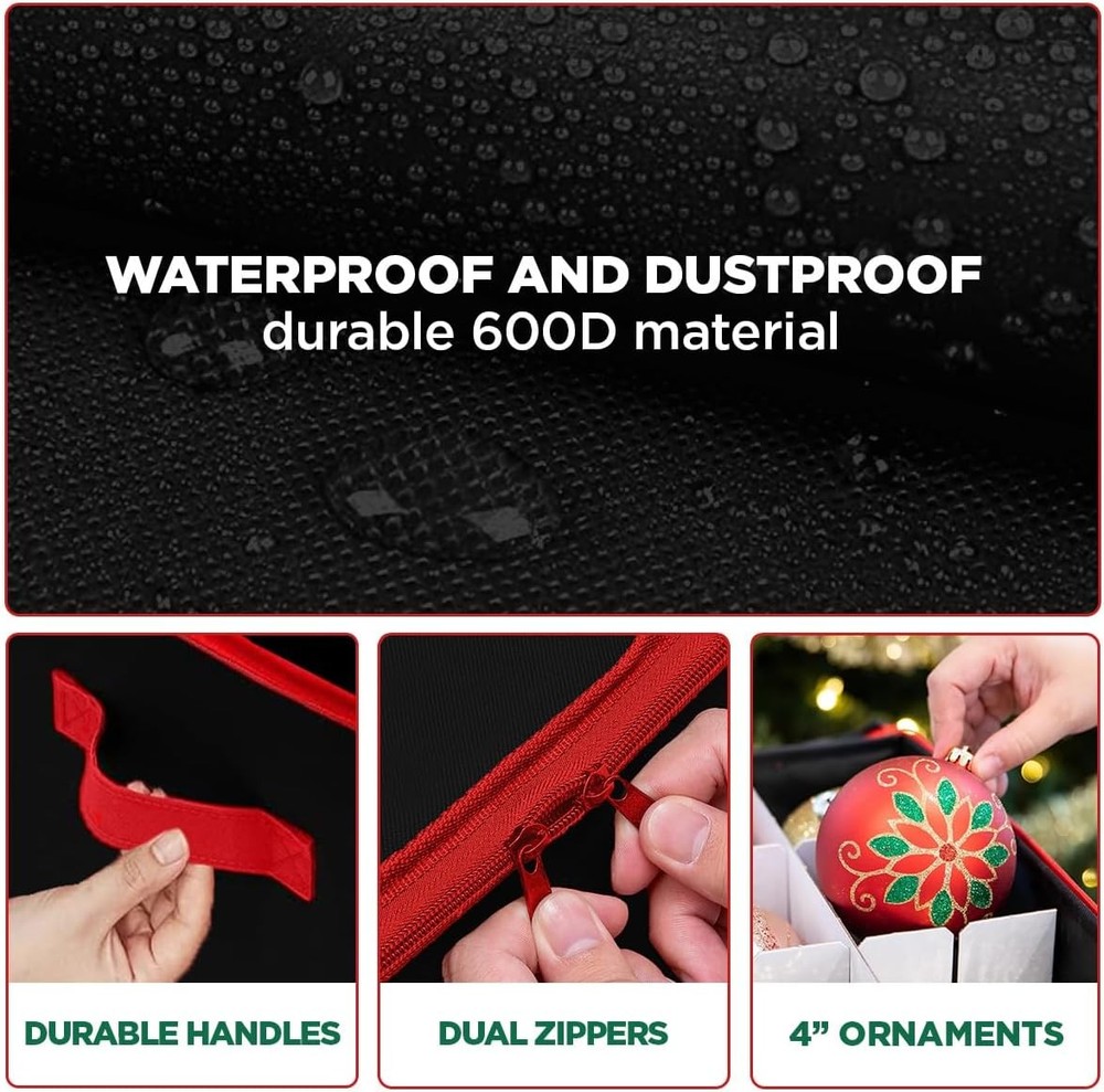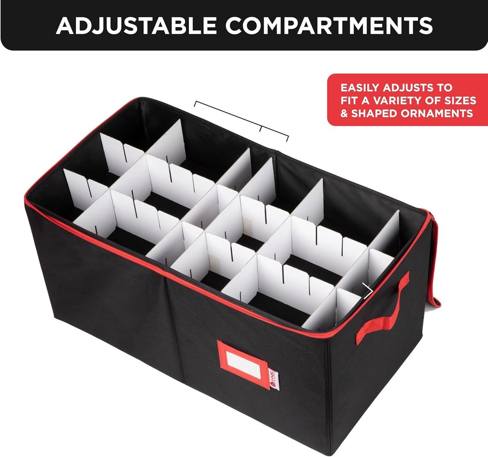 Christmas Ornament Storage Container with 54 - 4" Ornaments, Black Description Features: [PROTECT - KEEP YOUR ORNAMENTS SAFE] Picture yourself taking down your Christmas tree and not having to worry about how you're going to store your holiday decorations. Finally, there's no need to keep the flimsy packaging your ornaments came in with. Our Christmas Ornament Storage Box solves your problem since our 54-count chest can safely and securely protect all your Christmas Ornaments in one place. [SORT - ADJUSTABLE ORGANIZER] The included cardboard dividers can be easily assembled to fit your ornament storage needs. You have the flexibility to store and sort big or small or oddly shaped ornaments without bumping or banging into one another. The compartments can hold either a medium-sized Christmas ball or two small ones. Larger sized adornments can be accommodated by removing the inserts [SAVE - HIGH-QUALITY CONSTRUCTION] Made of durable, heavy-duty cardboard, 600D fabric exterior, and zippered closure cover, this storage container ensures that your ornaments will last for years to come. The individual compartments will keep your decoration from bumping into each other preventing breaks. The bin lid blocks dust, dirt, and light from damaging your ornaments keeping them looking like new every season [STORE - SPACE SAVING DESIGN] The storage container comes in 2 colors: red and gray and measures 25" W x 12.8" H x 13" D. A clear identification card slot is positioned in front so you can label your ornaments and keep them organized. Box collapses flat when not in use and can be stored anywhere. Durable handles allow you to comfortably carry your container from room to room. Product Details: Brand: HOLDN’ STORAGE Color: Black Material: Tear-Resistant 600D Special Feature: Customizable Dividers, Durable Zippered Top Style: Classic Recommended Uses For Product: For Christmas Ornaments Product Dimensions: 25"L x 13"W x 12.8"H Capacity: 25 Cubic Inches Water Resistance Level: Not Water Resistant Item Weight: 2.67 Kilograms Opening Mechanism: Zipper Shape: Rectangular Number of Items: 1 Number of Compartments: 18 Unit Count: 1.0 Count Item Package Quantity: 1 Occasion: Christmas Closure Type: Zipper Manufacturer: HOLDN’ STORAGE Item Weight: 5.87 pounds Size: 54 - 4" Ornaments Number Of Pieces: 1 Special Features: Customizable Dividers, Durable Zippered Top Batteries Included?: No Batteries Required?: No Brand: HOLDN’ STORAGE Color: Black Material: Tear-Resistant 600D Special Feature: Customizable Dividers, Durable Zippered Top Style: Classic Handling We will ship all orders within 3 business day of payment. Delivery We take pride in offering fast and reliable delivery for your orders! We are committed to getting your products to you as quickly as possible. Generally, we would like to inform you that all orders will be delivered to you within 1-3 business days after processing.However, in some cases, delivery times may vary depending on the buyer's location. Especially in remote or rural areas, the expected delivery time may be extended. In such situations, we do our best to ensure that your order reaches you as quickly as possible.If there are any delays, we will be happy to contact you to explain the situation. Our goal is to enhance your satisfaction with our fast delivery times. We work diligently to ensure that your order arrives safely.Trust us and enjoy our speedy delivery! Return Policy All items qualify for returns within 30 days of receipt. Buyer is responsible for return shipping on any item that is not damaged. Feedback We take our reputation seriously, we buy and sell online, so we understand the value of trust. If you are unsatisfied with your order, please contact us and we will work with you to resolve it to your satisfaction.