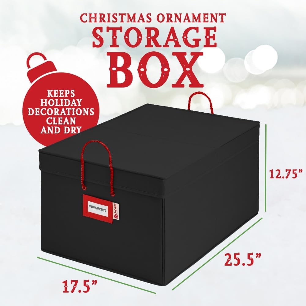 HOLDN’ STORAGE Christmas Ornament Storage Box 72 - 4" Ornaments, Black Product Details Brand: HOLDN’ STORAGE Color: Black Material: Durable Non-Woven Fabric Special Feature: Stackable, Durable, Foldable, Adjustable Style: Modern Recommended Uses For Product: For Storing Christmas Decorations Product Dimensions: 25.5"L x 17.5"W x 17.75"H Closure Type: Lid Water Resistance Level: Not Water Resistant Opening Mechanism: Hinge Shape: Rectangular Pattern: Solid Number of Items: 1 Number of Compartments: 3 Unit Count: 1.0 Count UPC: 810155080259 Manufacturer: HOLDN' STORAGE Part Number: HS-40028-RS-BLK Item Weight: 12.23 pounds Country of Origin: China Item model number: HS-40028-RS-BLK Size: 72 - 4" Ornaments Number Of Pieces: 1 Special Features: Stackable, Durable, Foldable, Adjustable Batteries Included?: No Batteries Required?: No Brand: HOLDN’ STORAGE Color: Black Material: Durable Non-Woven Fabric Special Feature: Stackable, Durable, Foldable, Adjustable Style: Modern Protect Your Ornaments: Store up to 72 ornaments (4 inches each) with sturdy dividers that prevent scratches and damage, ensuring your decorations stay safe year after year. Customize Your Storage: Adjust the dividers and use the 3 stackable trays to organize ornaments of any size or shape for a neat and efficient storage solution, featuring a front-opening design for easier access. Move with Ease: Carry the container or individual trays effortlessly thanks to the durable rope handles that provide a convenient and secure grip. Save Space: Perfect for all ornament sizes, including large or oddly shaped ones, thanks to the box dimensions of 25.5”W x 17.5”D x 12.75” H. Built to Last: Constructed with Durable non-woven fabric and Acid-free cardboard, this box ensures your ornaments remain protected and organized for years.