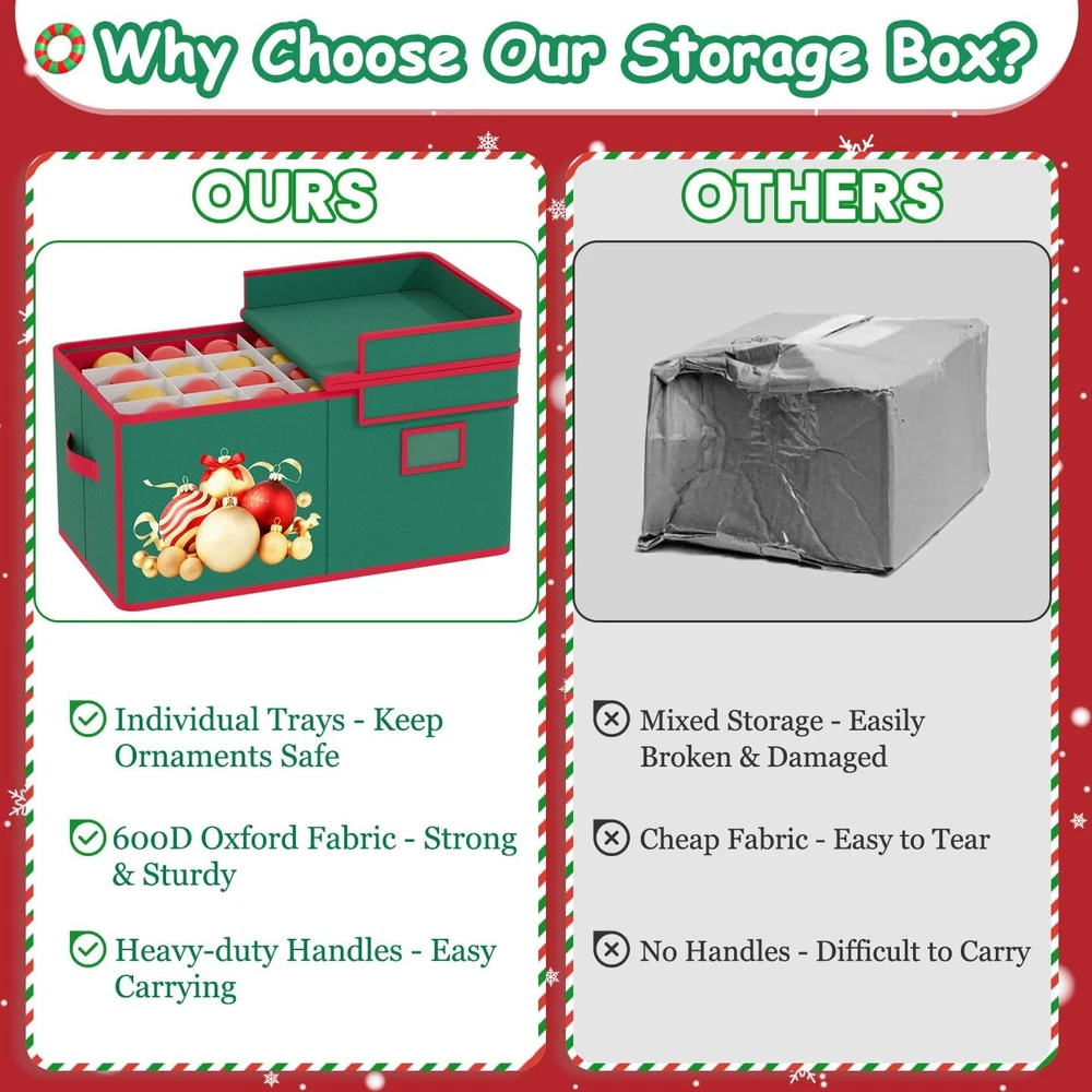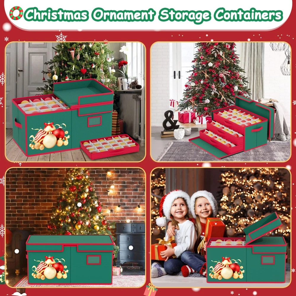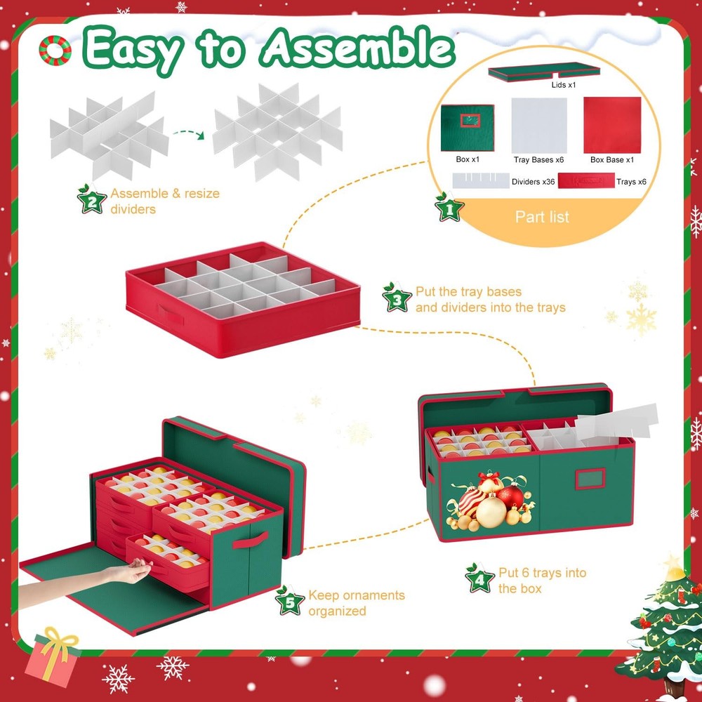 ornament storage box ornament organizer christmas ornament organizer ornament box christmas storage containers christmas ornaments storage box christmas storage box Features ❖1. Extra Large Capacity -- Our christmas ornament storage box measures 25.5 inches in length, 12.9 inches in width, and 9.5 inches in height. The christmas ornament organizer storage box includes 8 individual trays, each designed to securely hold ornaments. Each tray has ample room for ornaments, allowing for easy organization and safe handling. ❖2. Sturdy Material-- The christmas ornament storage containers features a 600D Oxford fabric exterior and cardboard dividers inside. The materials provide strength and stability, helping to keep ornaments separated, dust-free, and well-organized. ❖3.Foldable Design-- When not in use, the box is fully collapsible, allowing it to fold flat to save storage space. ❖4.Easy to Carry-- The christmas ornament boxes storage features sturdy side handles, making it easy to carry and transport, whether moving it around the house or to different storage areas. ❖5.Easy to Store-- Perfect for both long-term storage and quick access during the holiday season, this ornament storage box keeps your decorations safe, organized, and easy to transport. ❖❖❖ornament boxes ornament holder christmas organizers and storage christmas decoration storage❖❖❖ Christmas Ornament Storage Box Adjustable Dividers Store Up to 96 Holiday Ornaments 3 Inch Christmas Decoration Ornament Storage Containers Ornament Organizer with Lids & Removable Drawer Trays ★【Large Storage Space - Christmas Ornament Storage Box】The size of ornament storage box is 25.5" L x 12.9" W x 9.5" H, large to hold up 96 ornaments. The ornament holder provides ample space to keep them protected and neatly arranged for the next season. ★【8 Individual Trays - Christmas Ornament Storage】The ornament organizer includes 6 individual trays, each measuring 12.2" L x12.2" W x 3.3" H. These trays help in organizing and protecting your ornaments, preventing scratching and tangling. You can customize the layout to fit any shapes and sizes of ornaments. ★【Quality 600D Oxford Material- Christmas Ornament Boxes Storage】The Christmas ornament storage boxes are made of heavy duty 600D Oxford fabric and thick cardboard, sturdy and stable, to ensuring that your ornaments are protected from dust and damage throughout the year. ★【Easy to Carry - Ornament Boxes for Storage】The ornament storage box is dsigned with reinforced handles for effortless carrying, even when fully loaded with ornaments, perfectly suited for closets, attics and garage. ★【Keep Organized & Sapce Saving】With a collapsible design, the christmas ornament storage containers can be easily folded flat, making it easy to store without taking up much space. If you have any questions, don't worry, our professional customer service team will solve it for you in time.
