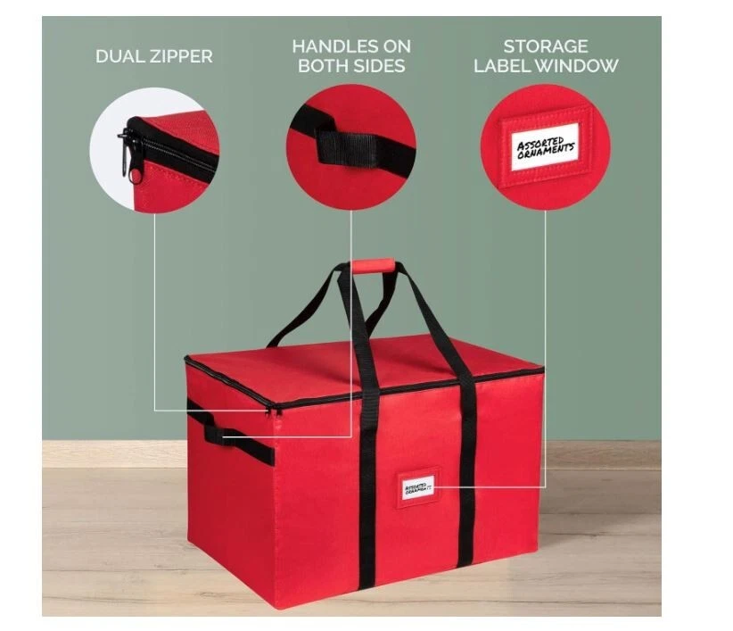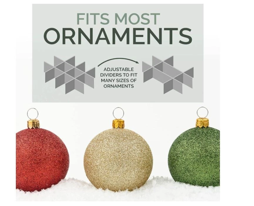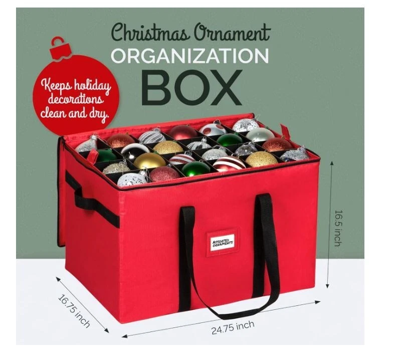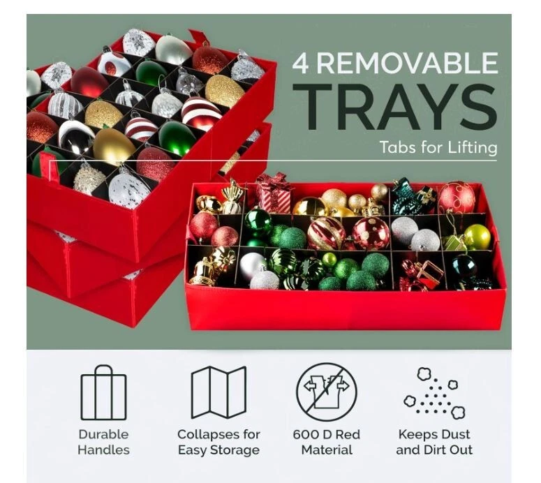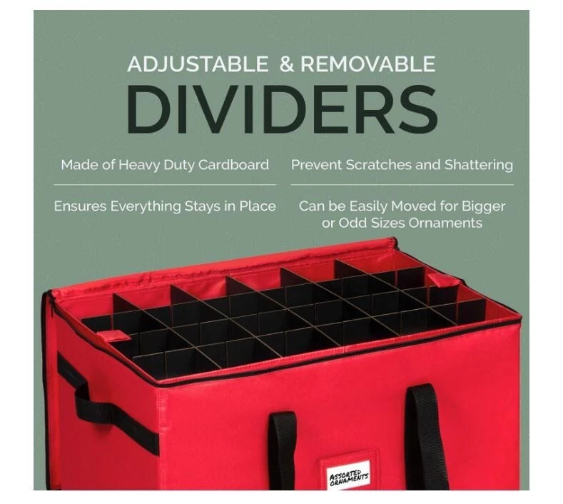 About this item 600D Tear Resistant TEAR RESISTANT 600D MATERIAL: This Christmas Ornament Storage Container will keep your decorations safe and secure. The chest is made of premium quality 600D Tear-Resistant Material. The storage container features durable zippers for easy opening and closing and 3 individual stackable trays that can hold up to 96 - 4-inch ornaments EASY TRANSPORT-DUST PROOF DESIGN: This Christmas Ornament Storage Container comes with 4 individual trays to make your tree decoration fun and hassle free. Container measures 24.75” W x 16.75” D x 16.5" H. The durable cardboard dividers can be adjusted to store big or small or oddly shaped ornaments into the cubes. No need for multiple containers STURDY HIGH-QUALITY CONSTRUCTION: Engineered for a lifetime of quality and service this Christmas Ornament Storage Box is made of highly durable, heavy-duty cardboard, a non-tear 600D exterior. This holiday storage container preserves your ornaments from dirt, dust and debris while the dividers prevent them from bumping into each other preventing breaks. CHEERFUL & FUN HOLIDAY COLORS: The storage container comes in cheerful holiday colors and includes a clear identification card slot so you can label it and readily identify it from your other storage boxes. Durable handles allow you to comfortably carry the container or the tray anywhere. Unlike other trays, ours have side walls ensuring that the ornaments won't slide off PRACTICAL HOLIDAY STORAGE SOLUTIONS THAT YOU'LL LOVE: HOLDN' STORAGE products aim to solve your problems which make life easier for you and because customer satisfaction is the cornerstone of our business, we are confident in the quality of our brand. Everything you love in a Christmas Ornament Storage Container purchased at NO RISK backed by our 100% Satisfaction