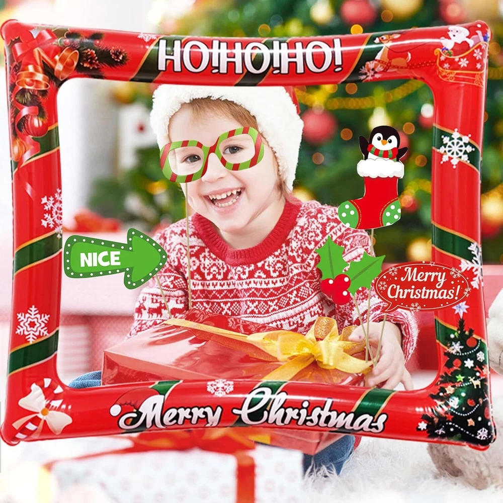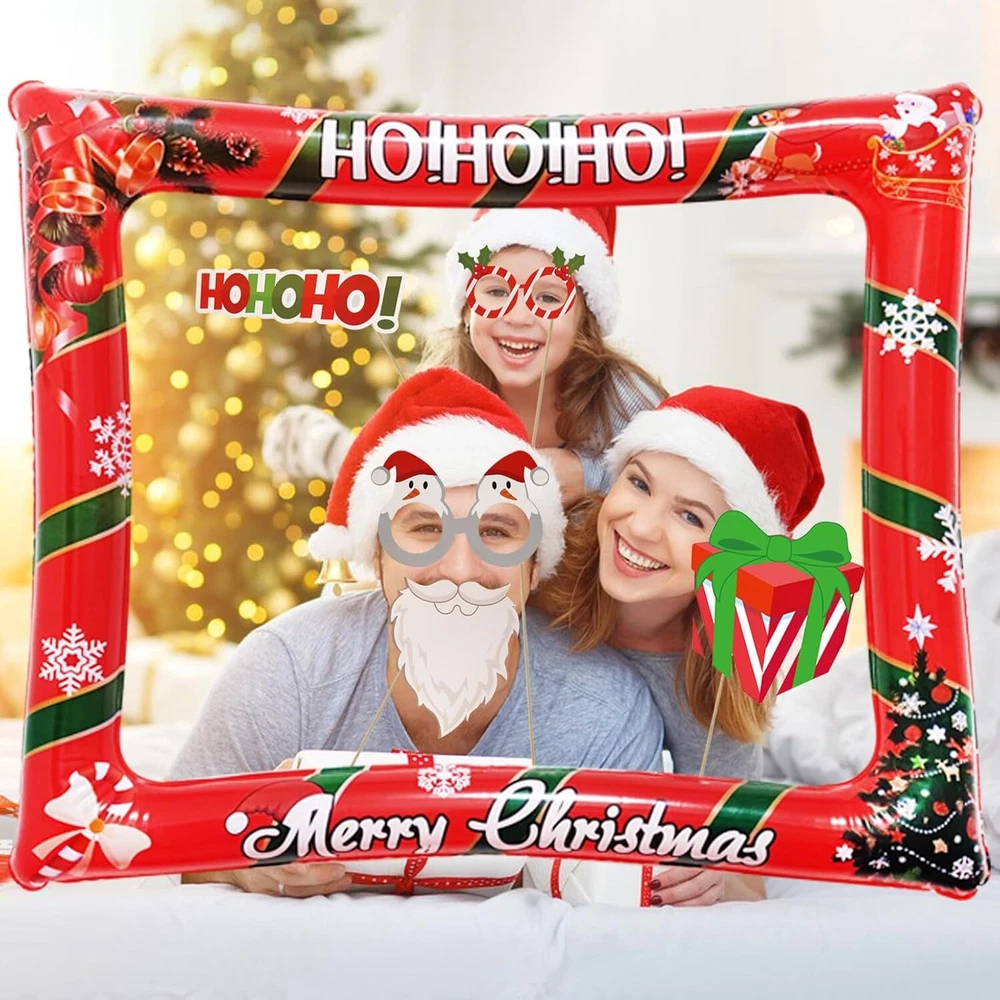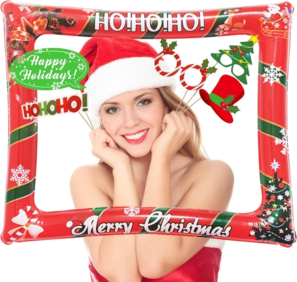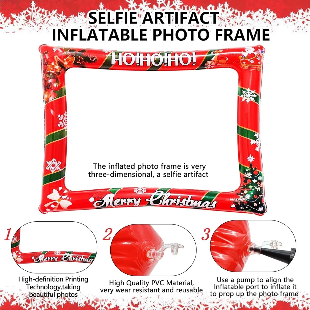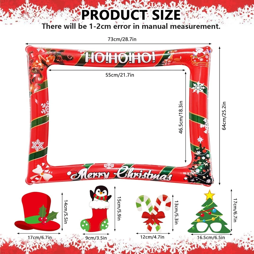 Christmas Party Photo Booth Props Frame, LMSHOWOWO Red Product Details Product Dimensions: 7.87 x 7.87 x 0.75 inches Item Weight: 8.1 ounces Manufacturer: LMSHOWOWO Country of Origin: China Item model number: EJ0020011 【Christmas Desing】The Inflatable Selfie Photo Frame is printed with classic Christmas tree, Santa, ring bell, reindeer and "Merry Christmas" words on the frame edge, adding Christmas festive atmosphere; Traditional Christmas elements make your photo more special 【Widely Applicable】Xmas Photo Booth Frame fits for your Christmas party, new year decoration, family dinner, friends gathering, birthday party, costume party, stage performance, weddings, school events, bars, holidays, pool parties, etc; and other festival occasions, the creative design makes the festive atmosphere more active and joyful, creating more fun when taking photos 【Easy To Use】This funny set of christmas selfie decorations provide strong wooden sticks and glue dots; So easy to assemble and use; Just attach the wooden stickers to the xmas selfie props with the glue dot and inflate the christmas selfie picture frame with an inflator; This christmas picture frame and props is very suitable for those who are love taking photos or selfies at all kinds of parties, leave a good memory 【Rich Christmas Elements Design】The Inflatable Selfie Photo Frame is printed with classic Christmas tree, Santa, ring bell, reindeer and "Merry Christmas" words on the frame edge, adding Christmas festive atmosphere; Traditional Christmas elements make your photo more special and funny