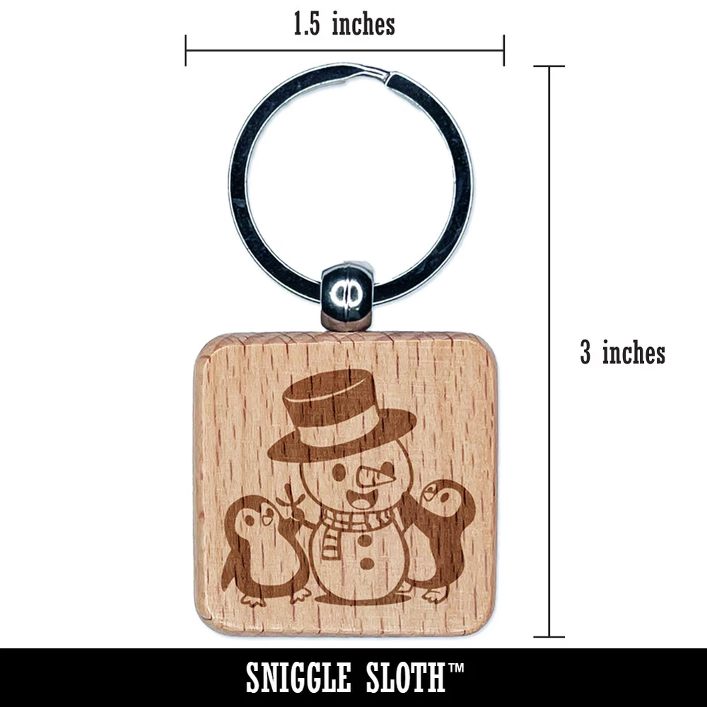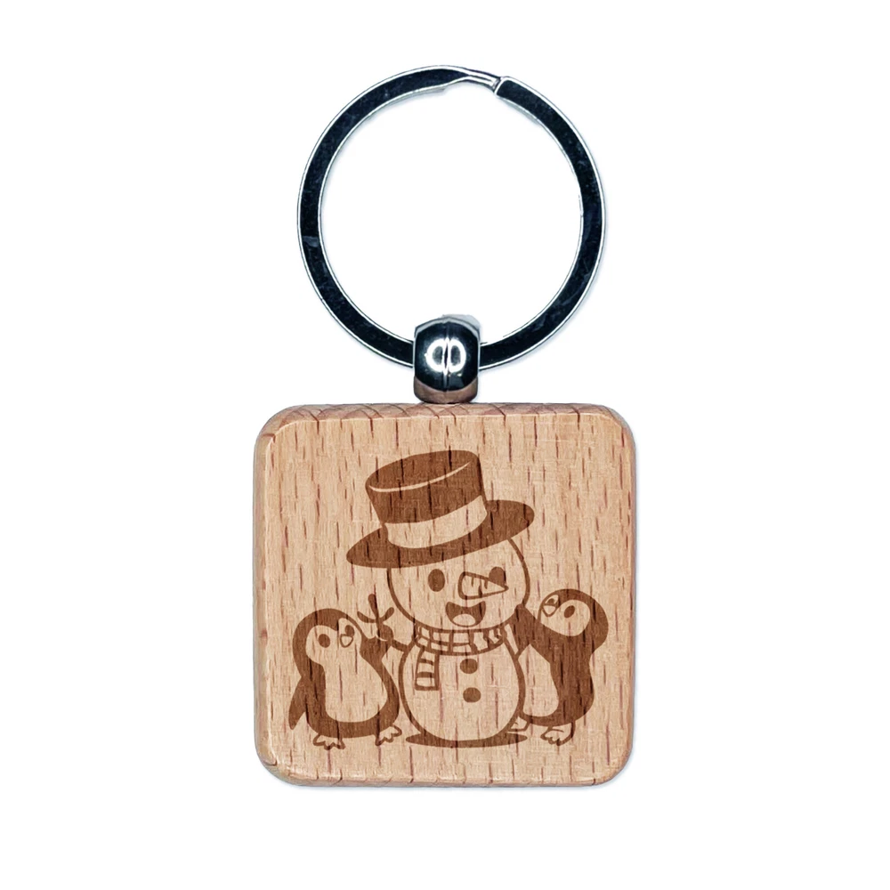 Christmas Penguins Building Snowman Engraved Wood Square Keychain Tag Charm