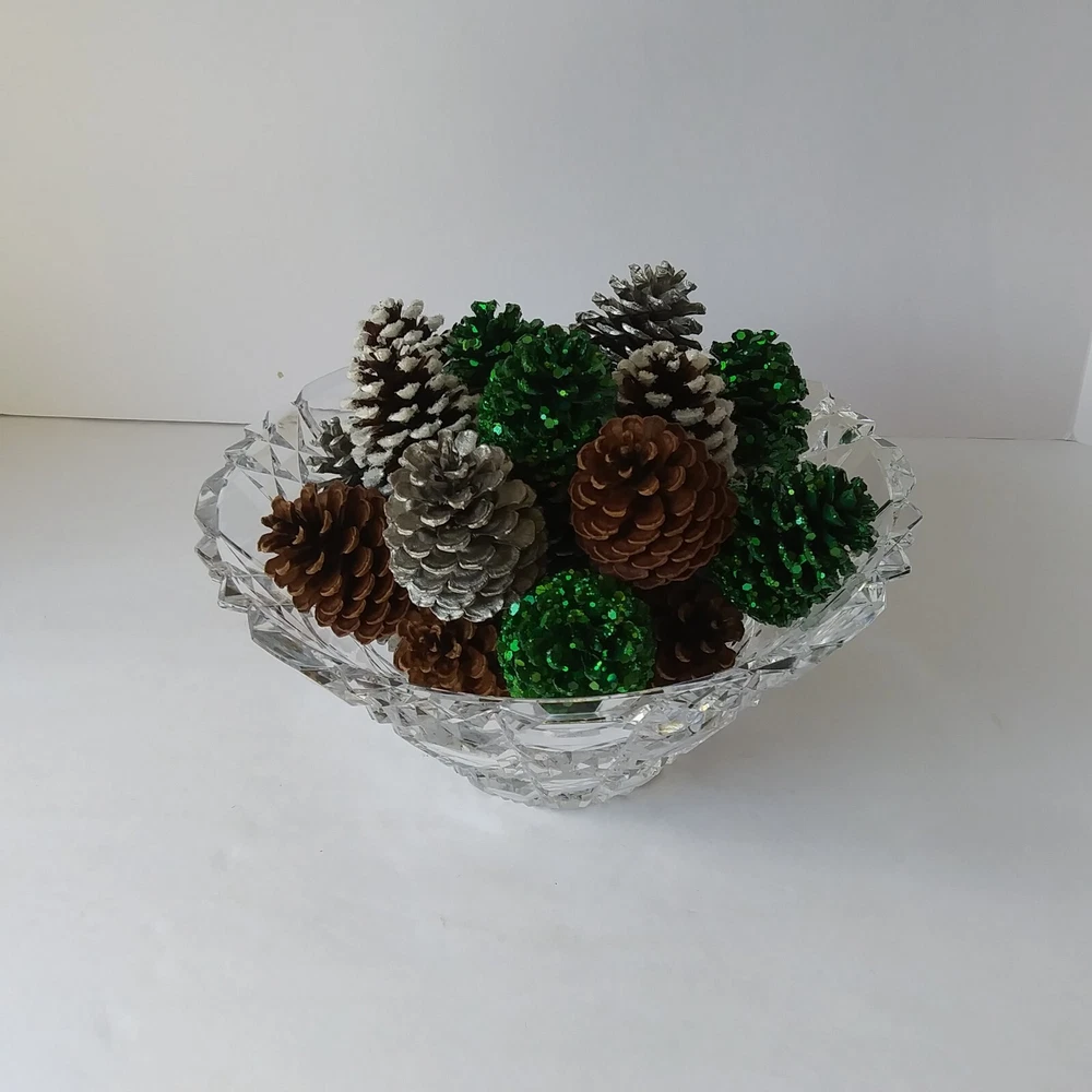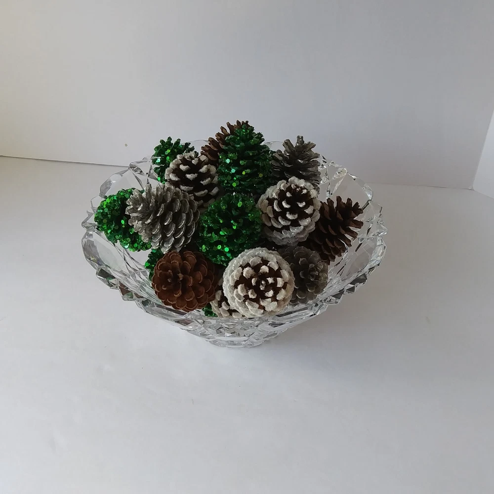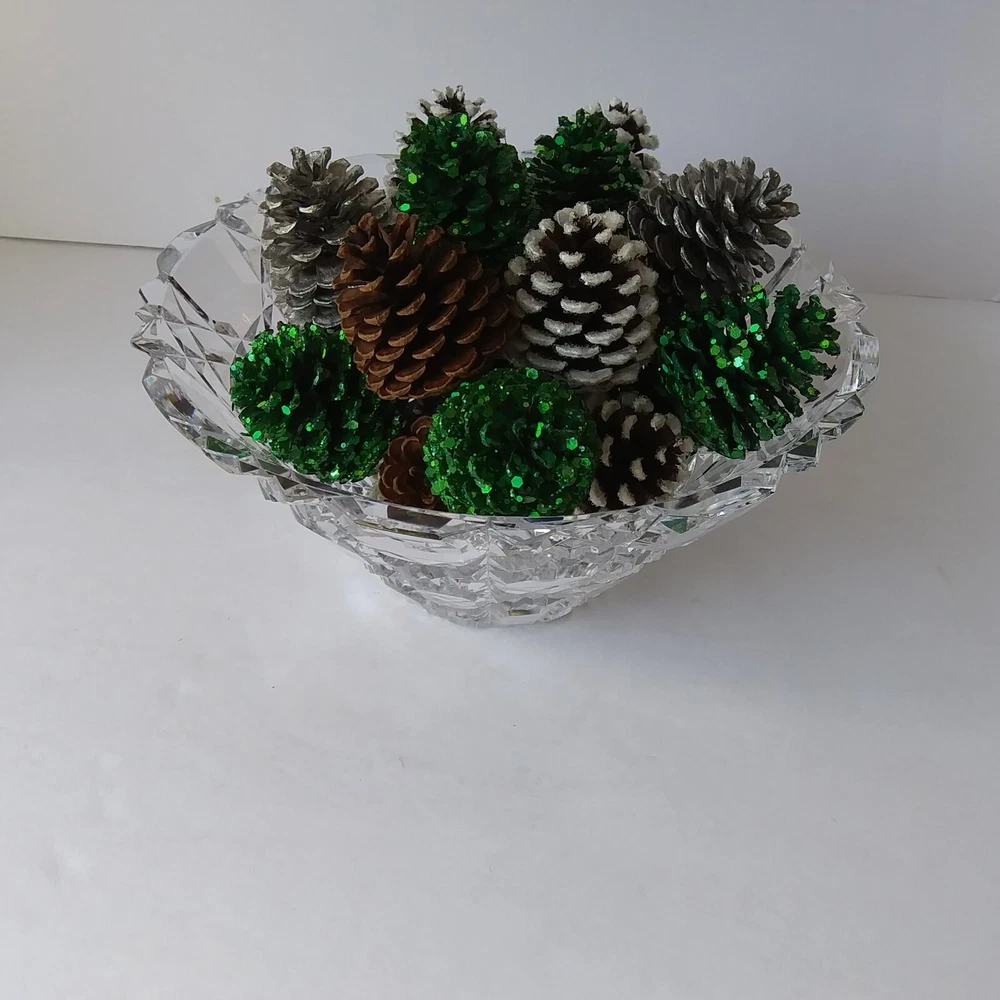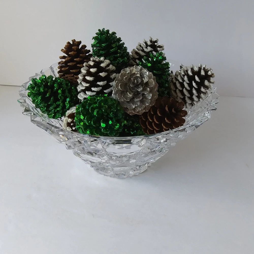 Upscale one-of-a kind designer Holiday glittered pinecone table centerpiece, handcrafted with love in the Berkshire Mountains. Beautiful Crystal Bowl of nearly perfect pinecones painted white and glittered white crystals looking like snow, mirror looking glass spray silver, glittered green, and natural pinecones. In the light it shines it is absolutely stunning. It is perfect for your holiday home decor. It is absolutely beautiful. Note: 30-day returns are accepted, but please contact me with any issues. My goal is for you to love your arrangement. Returns must be received in original new condition; buyer pays shipping and insurance both ways.