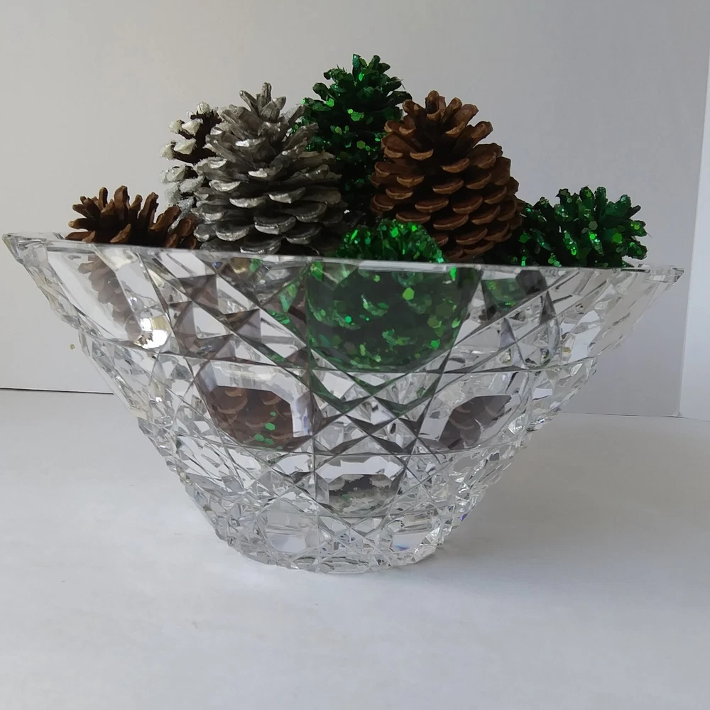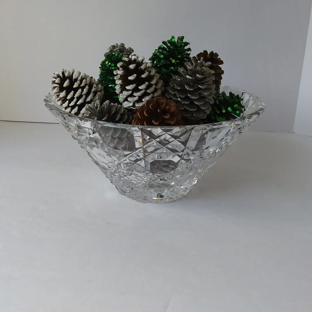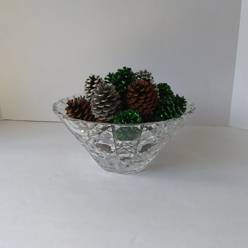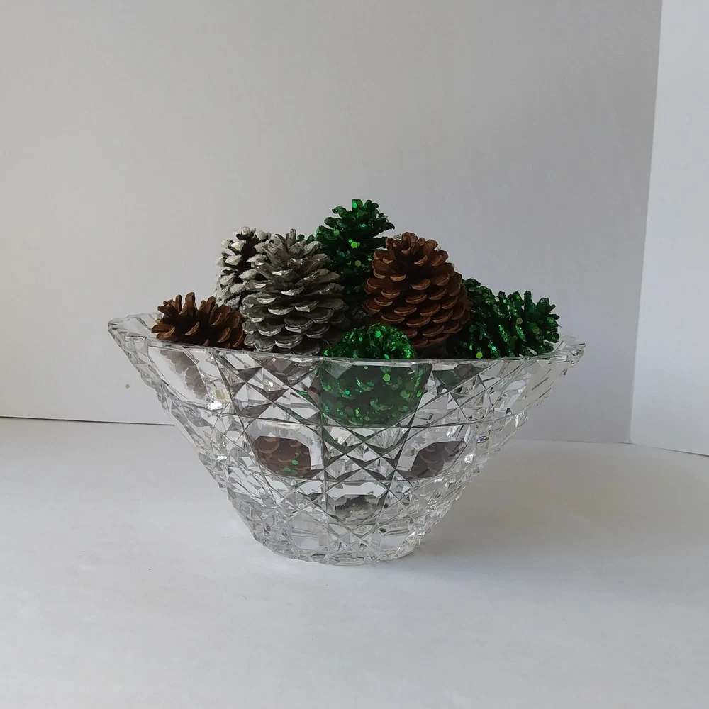 Upscale one-of-a kind designer Holiday glittered pinecone table centerpiece, handcrafted with love in the Berkshire Mountains. Beautiful Crystal Bowl of nearly perfect pinecones painted white and glittered white crystals looking like snow, mirror looking glass spray silver, glittered green, and natural pinecones. In the light it shines it is absolutely stunning. It is perfect for your holiday home decor. It is absolutely beautiful. Note: 30-day returns are accepted, but please contact me with any issues. My goal is for you to love your arrangement. Returns must be received in original new condition; buyer pays shipping and insurance both ways.