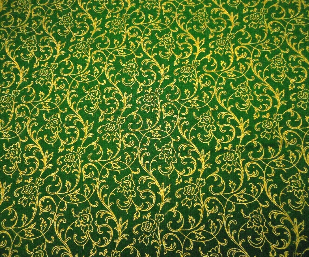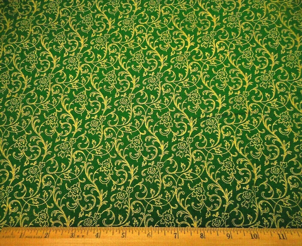 This is a very nice fabric that is 100% cotton. It has metallic gold swirling flowers on a green background. READ: Because computer monitors show colors and shades differently, the fabric colors can vary from the photos. If you have any questions regarding this, please contact me before p urchasing the item. I have been a quilter for 30 years and am an accomplished seamstress & would be happy to answer any questions you might have. This is for 1 Half-Yard of Fabric. If you purchase more than 1 Half-Yard, I will give you one continuous cut. If you have a problem with anything you purchase from me, please contact me before leaving neutral or negative feedback and I will work it out with you. Payment is due within 48 hours. If payment isn't received within 5 days, it will automatically go to Ebay's resolution center for non-payment. INSTRUCTIONS FOR COMBINED SHIPPING: I Do combine shipping. You must add the items to your shopping cart and request an invoice from me using the REQUEST TOTAL BUTTON BEFORE completing the payment process, or I won't be able to combine your shipping. Payment is due upon receipt of your invoice. Thank you for looking and God bless you and your family. IF THERE IS A PROBLEM WITH ANY PURCHASE, PLEASE CONTACT ME, THE SELLER, VIA EBAY'S MESSAGING SYSTEM PRIOR TO OPENING A CASE--OPENING A CASE, EVEN IF RESOLVED SMOOTHLY, CAN HURT THE SELLER'S RATINGS. THANK YOU