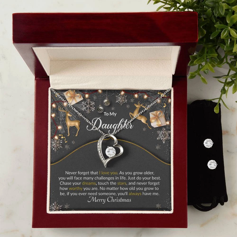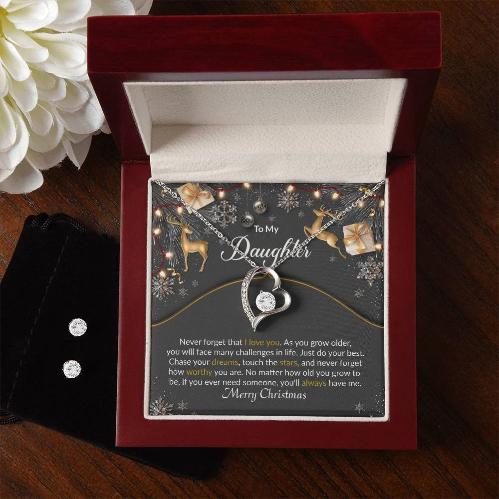 Christmas Reindeer Black Daughter Heart Necklace and Earring Set
