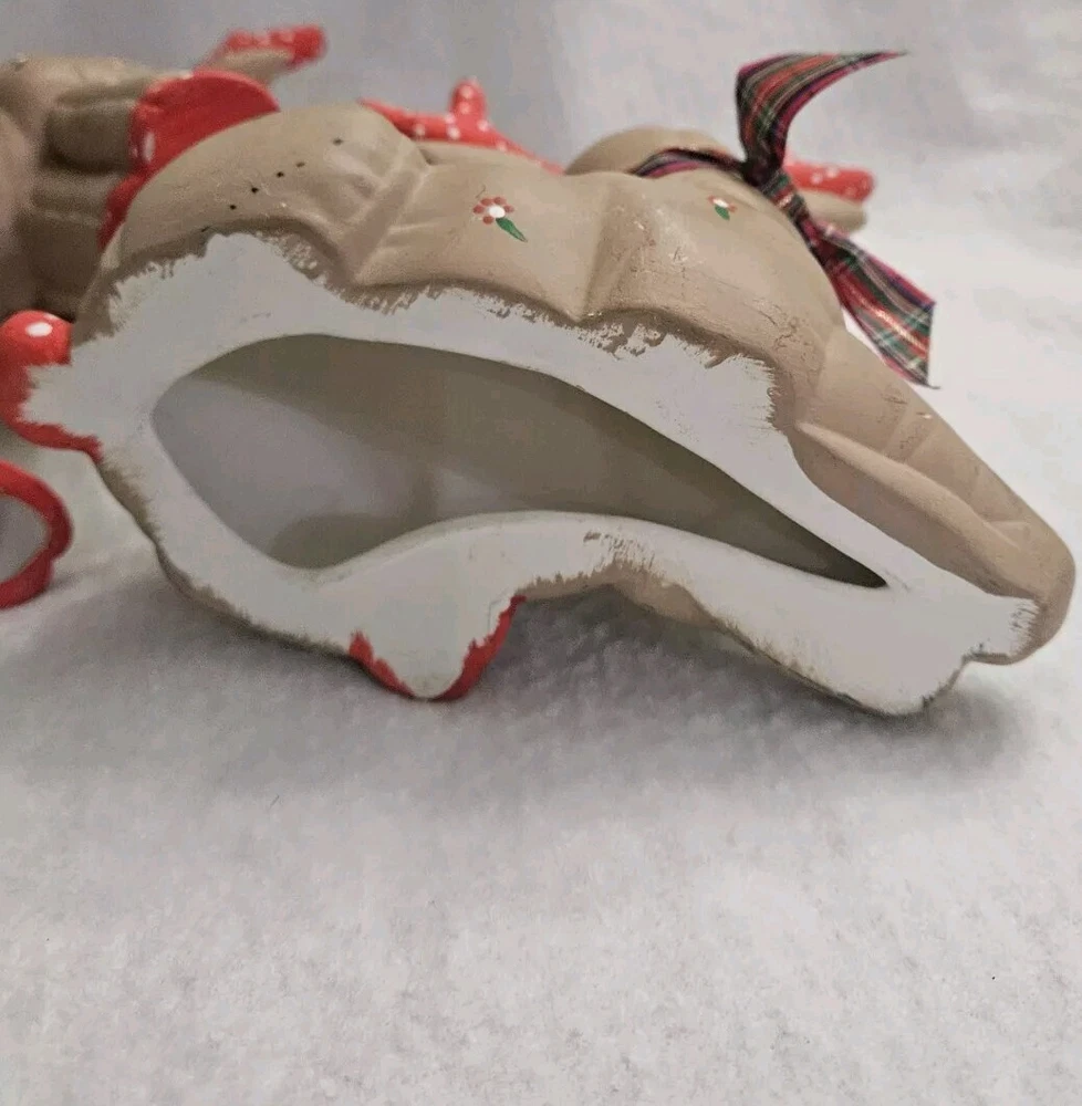 A set of two medium-sized ceramic reindeer figurines manufactured in 1988 by Kimple. These retro-style figurines feature a quilted look and are hand-painted in multicolor. They are suitable for Christmas decor in any room, with a festive reindeer theme. The figurines have a matt finish and are handmade in the United States. Care instructions include cleaning with a damp cloth.