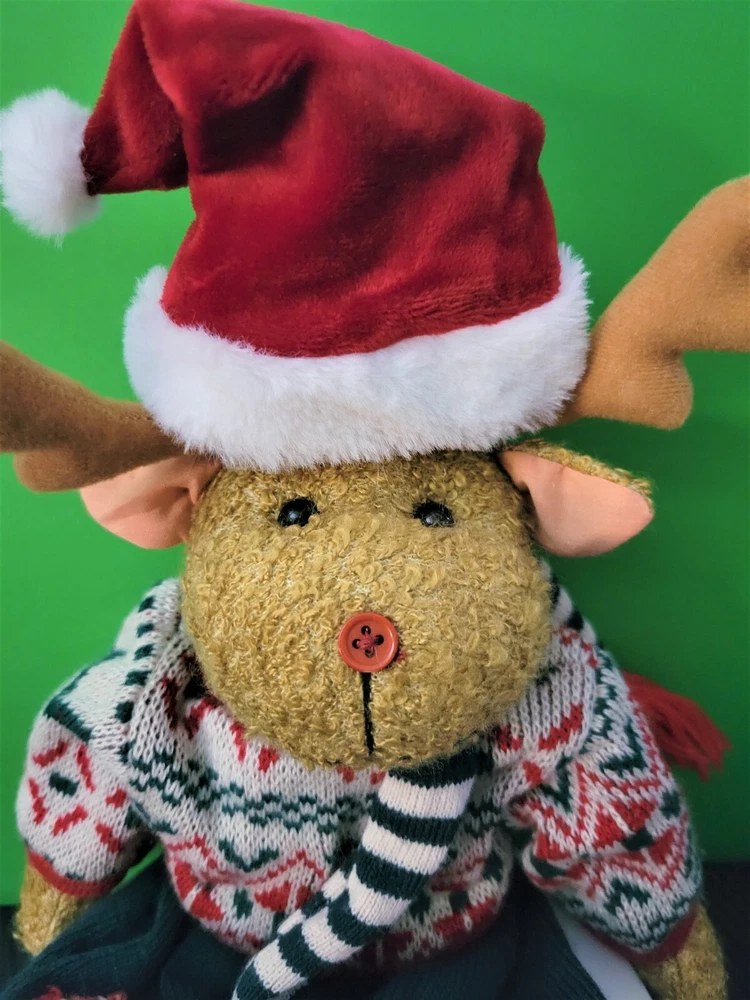 Christmas Reindeer with Santa Hat & Sweater 18” Long Shelf Sitter Dangling Legs. Used in good condition from a smoke and pet free home.
