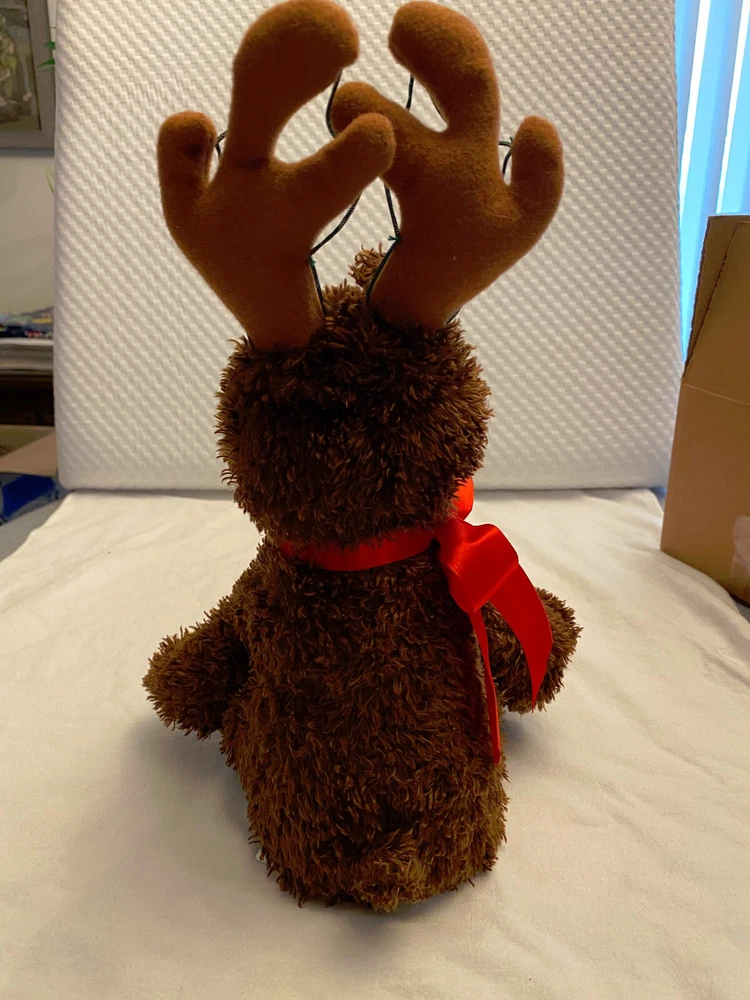 Brown Reindeer with light up antelers plush. Sings jingles bells, head moves white he sings. Great addition to your home for christmas decor. Charming plush reindeer antlers light up as he sings jingle bells and his head dances around. Vintage.
