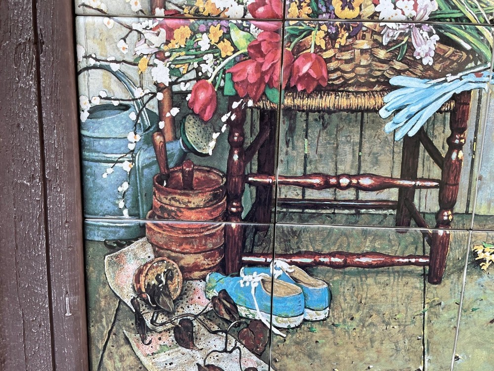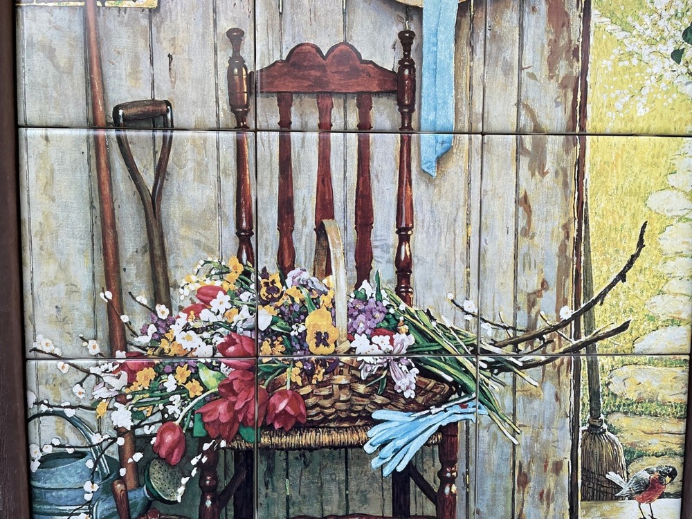 This beautiful framed tile art by Norman Rockwell is the perfect addition to any collection. With its stunning depiction of Spring flowers, this piece will bring a touch of nature and artistry to any room. The brand of this collectible is well-known and highly respected, making it a must-have for any art enthusiast. The tile is suitable for display in a variety of settings and occasions, whether as part of a collection or as a standalone piece. Its features include a sturdy frame that complements the artwork perfectly. Don't miss out on this amazing opportunity to own a piece of history and beauty. Buy Now Sale $49.99reg $399.99 Norman Rockwell Spring Flowers framed tile art. Frame and tile are waterproof, which enables you to display in your garden or on the outside of your house. Emagine this beautiful artwork on a stand among your flower garden. Norman Rockwell " Spring Flowers framed tile artwork. Spring Flowers signed by artist. Kiln fired tile with artwork imbedded in thetile, not painted on the outside. Will not scratch. Norman Rockwell's charming still life, Spring Flowers, was published in McCall's in 1969. It was inspired by his third wife, Molly. By using her sun hat, garden gloves, sneakers, and the arrangement of flowers in the basket, Rockwell portrays Molly's presence without painting her directly. It is a portrait of a woman who stays in touch with nature through the medium of her garden. image size 18x24 frame size 25x31