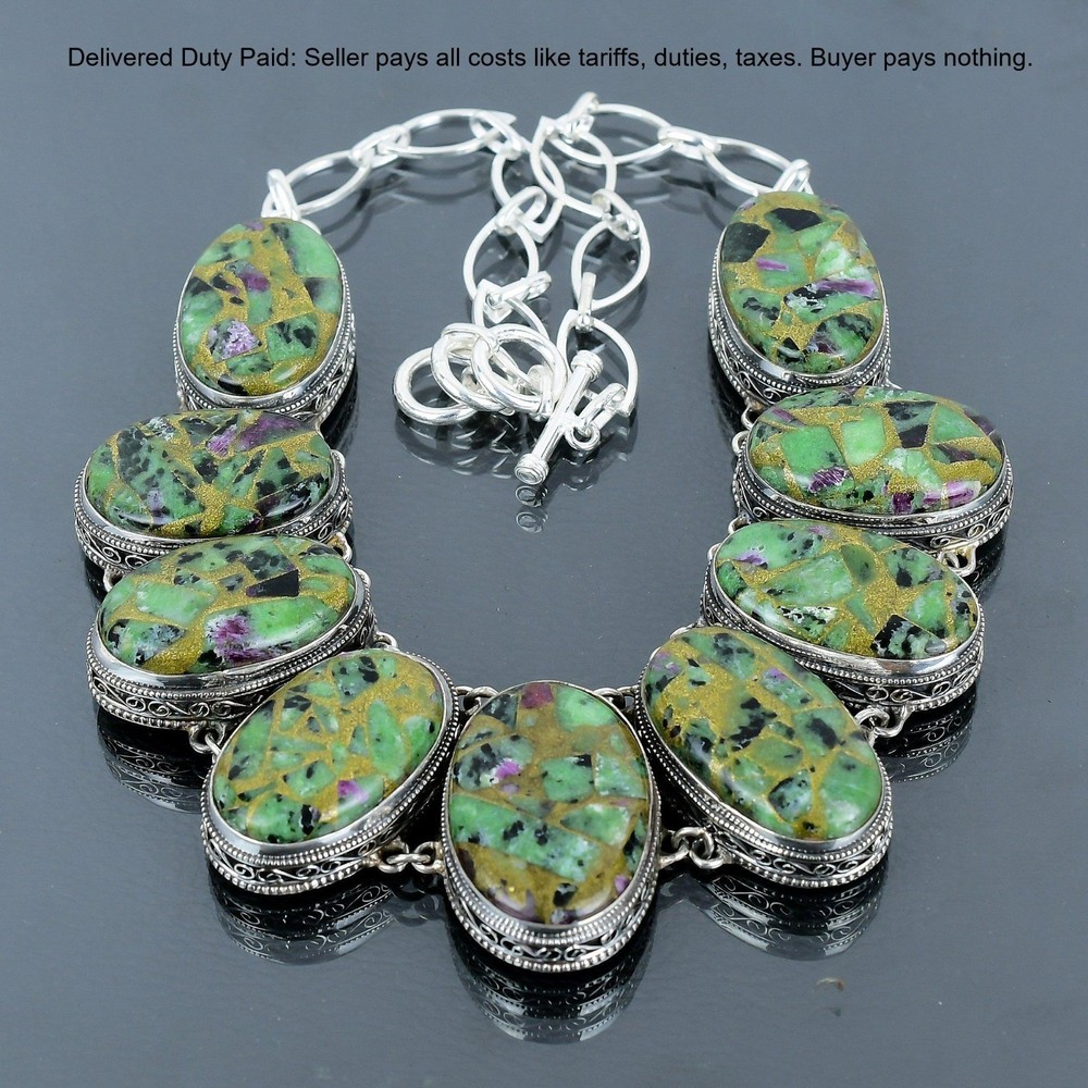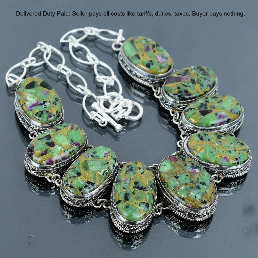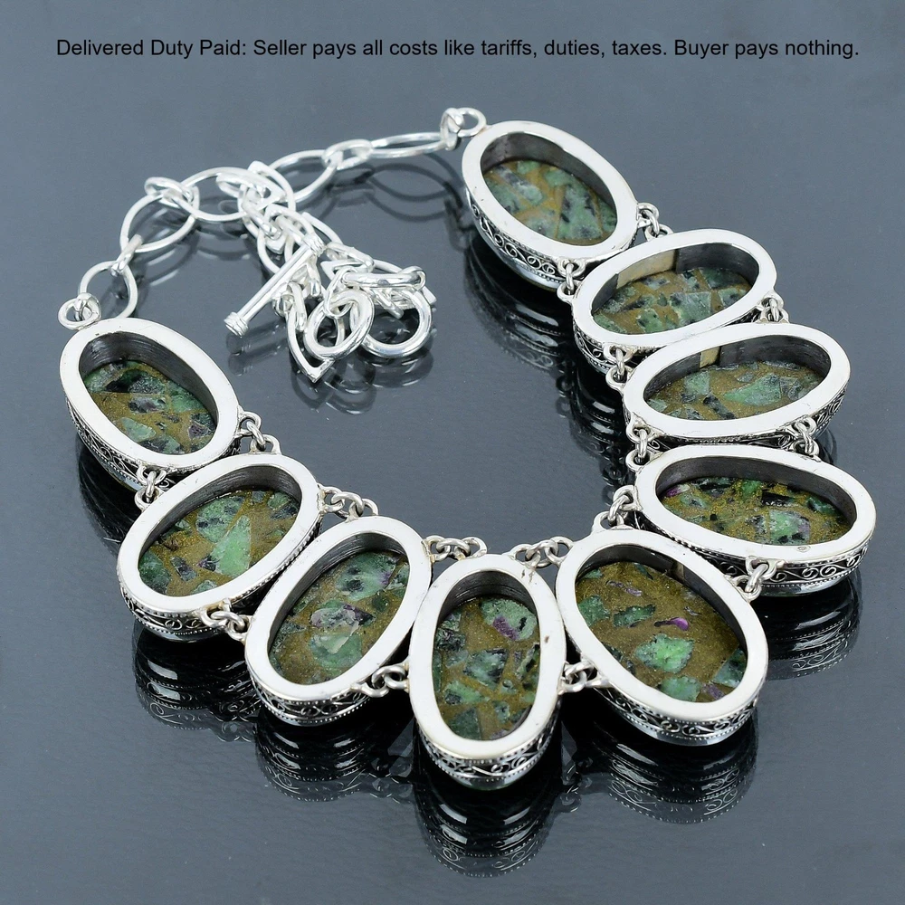 Welcome to Madonna Jewels Christmas Sale 925 Silver Oval Copper Ruby Zoisite Stone Vintage Chain Necklace Handmade Necklace, Sterling Silver Necklace, Copper Ruby Zoisite Necklace, Handcrafted Necklace SKU : VN-1307 Gemstone : Copper Ruby Zoisite Stone Shape : Oval Metal Purity : 925 Sterling Silver Necklace Length : Inches Adjustable : Yes Silver Jewelry is a popular choice for many people due to its unique properties and numerous benefits. Here are some of the key properties and benefits of wearing silver jewelry: Properties: Durability: Silver is a durable metal that can withstand regular wear and tear. Malleability: Silver is highly malleable, which means it can be easily shaped and molded into various designs. Conductivity: Silver is an excellent conductor of heat and electricity. Anti-bacterial: Silver has natural anti-bacterial properties, which can help prevent the growth of harmful bacteria. Benefits: Aesthetic appeal: Silver jewelry is known for its beauty and versatility, and can be worn with a variety of outfits and styles. Hypoallergenic: Silver is generally hypoallergenic, which means it is unlikely to cause an allergic reaction in most people. Healing properties: Some people believe that wearing silver jewelry can help with various physical and emotional conditions, such as arthritis, anxiety, and depression. Spiritual significance: Silver has been used in various cultures for its spiritual and symbolic significance, and wearing silver jewelry can help to connect with these traditions. Investment value: Silver is a precious metal that retains its value over time, and investing in silver jewelry can be a smart financial decision. Overall, silver jewelry offers a unique combination of beauty, durability, and benefits, making it a popular choice for people around the world. For Mother's Day Gift For Father's Day Gift For Promise For Valentine' Day For Halloween Party For Christmas Day Gift For New Year Party For Mom For Her If you can't find the information you need or need some advice for your design? Feel free to contact us. We are fast to reply :) All our work is made by hand with Love and Care in our workshop Thank you so much for visiting and hope you enjoy shopping with us Madonna Jewels is dedicated to providing customers with high-quality sterling silver jewelry. As a manufacturer of handmade jewelry, we offer an extensive range of silver gemstone jewelry that demonstrates our exceptional craftsmanship. We are skilled in adorning gemstones to complement any style, and we give you the freedom to design your own jewelry collection with dazzling, natural, and genuine gemstones. Our talented craftsmen carefully handcraft each jewelry piece, ensuring that it is unique and made with authentic gemstones. The jewelry item you see on our website is precisely the same one you will receive.