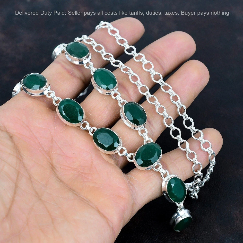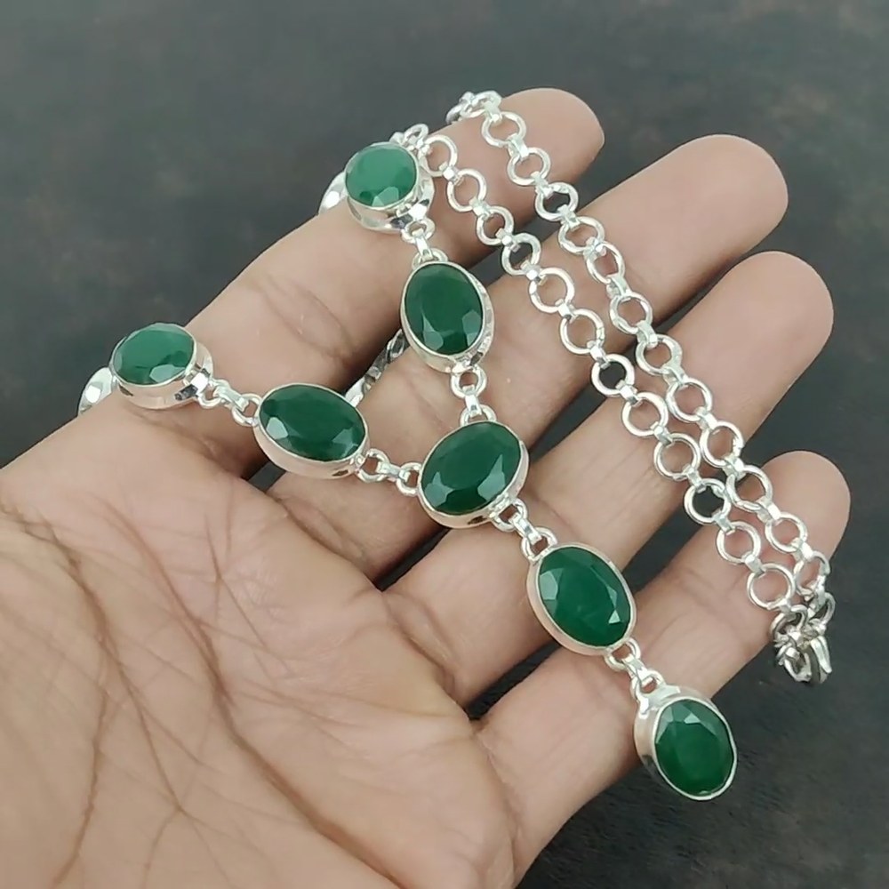 Note : Due to the natural formation of this gemstone. Slight variation in design and color are to be expected. Welcome to Kalka Jewels Christmas Sale 925 Silver Zambian Emrald Gemstone Wedding Chain Bezel Necklace Handmade Necklace, Sterling Silver Necklace, Zambian Emrald Necklace, Handcrafted Necklace SKU : KN-1415 Gemstone : Zambian Emrald Stone Shape : Oval Metal Purity : 925 Sterling Silver Necklace Length : 20 Inches Adjustable : Yes Silver Jewelry is a popular choice for many people due to its unique properties and numerous benefits. Here are some of the key properties and benefits of wearing silver jewelry: Properties: Durability: Silver is a durable metal that can withstand regular wear and tear. Malleability: Silver is highly malleable, which means it can be easily shaped and molded into various designs. Conductivity: Silver is an excellent conductor of heat and electricity. Anti-bacterial: Silver has natural anti-bacterial properties, which can help prevent the growth of harmful bacteria. Benefits: Aesthetic appeal: Silver jewelry is known for its beauty and versatility, and can be worn with a variety of outfits and styles. Hypoallergenic: Silver is generally hypoallergenic, which means it is unlikely to cause an allergic reaction in most people. Healing properties: Some people believe that wearing silver jewelry can help with various physical and emotional conditions, such as arthritis, anxiety, and depression. Spiritual significance: Silver has been used in various cultures for its spiritual and symbolic significance, and wearing silver jewelry can help to connect with these traditions. Investment value: Silver is a precious metal that retains its value over time, and investing in silver jewelry can be a smart financial decision. Overall, silver jewelry offers a unique combination of beauty, durability, and benefits, making it a popular choice for people around the world. For Mother's Day Gift For Father's Day Gift For Promise For Valentine' Day For Halloween Party For Christmas Day Gift For New Year Party For Mom For Her If you can't find the information you need or need some advice for your design? Feel free to contact us. We are fast to reply :) All our work is made by hand with Love and Care in our workshop Thank you so much for visiting and hope you enjoy shopping with us Kalka Jewels is dedicated to providing customers with high-quality sterling silver jewelry. As a manufacturer of handmade jewelry, we offer an extensive range of silver gemstone jewelry that demonstrates our exceptional craftsmanship. We are skilled in adorning gemstones to complement any style, and we give you the freedom to design your own jewelry collection with dazzling, natural, and genuine gemstones. Our talented craftsmen carefully handcraft each jewelry piece, ensuring that it is unique and made with authentic gemstones.