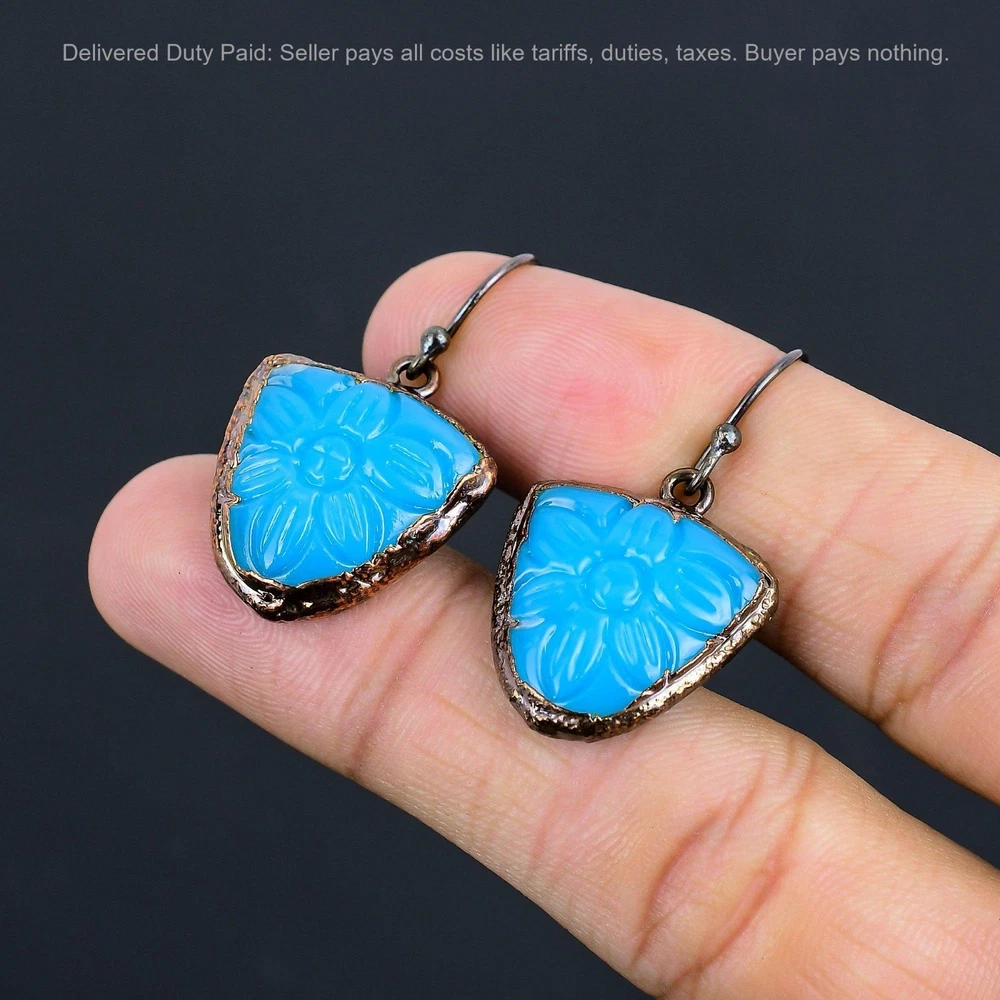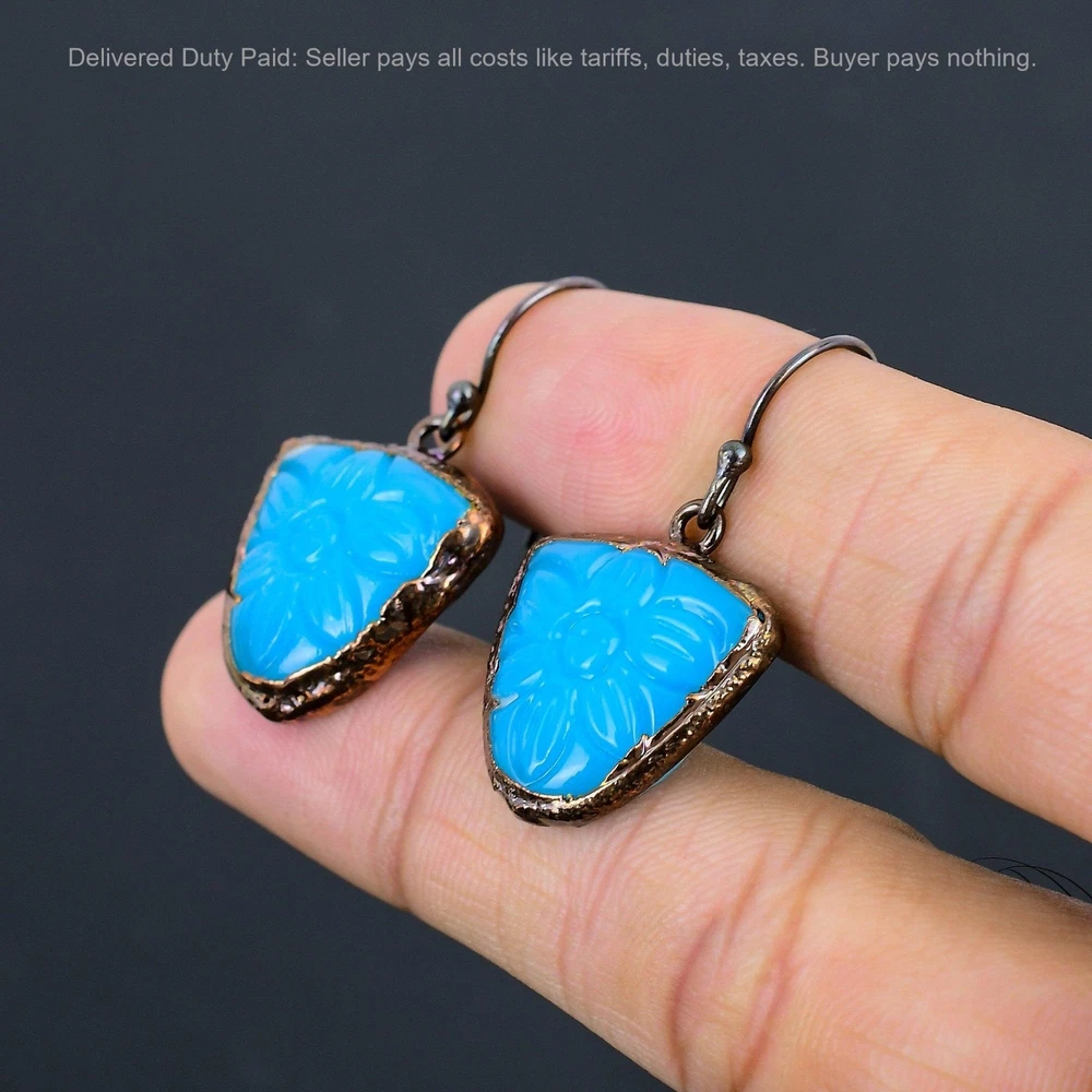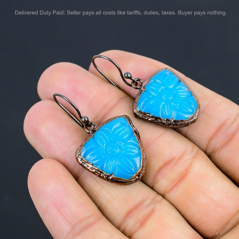 Welcome to bdenterprises123 Christmas Sale Copper Carved Blue Onyx Stone Dangle Drop Electroformed Earrings Handmade Earrings, Wire Wrapped Earrings, Wire Wrapped Jewelry, Copper Pendant, Copper Wire Earrings, Wrapped Jewelry, Wire Wrap Earrings, Wire Wrap Jewelry SKU : HZE-45 Gemstone : Carved Blue Onyx Stone Shape : Trillion Metal Purity : Unknown Copper Length : 39 Millimeters Width : 22 Millimeters Copper has been used for jewelry making for thousands of years, dating back to ancient civilizations such as the Egyptians, Romans, and Aztecs. Copper was valued for its beauty, versatility, and durability, and was often used to make everything from jewelry and coins to cookware and tools. In addition to its historical significance, copper jewelry also offers several benefits. Copper is a natural conductor of heat and electricity, which makes it ideal for energy healing and therapeutic purposes. Wearing copper jewelry is believed to have various health benefits, such as improving circulation, reducing inflammation, and boosting the immune system. Some people also believe that copper jewelry has the ability to balance energy and improve mood. For Mother's Day Gift For Father's Day Gift For Promise For Valentine's Day For Halloween Party For Christmas Day Gift For New Year Party For Mom For Her If you can't find the information you need or need some advice for your design? Feel free to contact us. We are fast to reply :) All our work is made by hand with Love and Care in our workshop Thank you so much for visiting and hope you enjoy shopping with us bdenterprises123 is committed to delivering the best quality sterling silver jewelry to customers. As a handmade jewelry manufacturer, we offer an extensive selection of copper gemstone jewelry that showcases the brilliance of our craftsmanship. We are an experienced handmade jewelry supplier with expertise in embellishing gemstones to suit every style. We offer you the liberty to create your jewelry ensemble with sparkling, earthy, and pure gemstones. Our Talented artisans masterfully handcraft each piece of jewelry you see here. Our pieces are made with genuine gemstones. The one-of-a-kind piece you see here is the same exact piece you will receive.