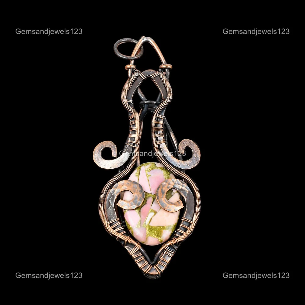 Note : Due to the natural formation of this gemstone. Slight Variation in design and color are to be expected. Welcome to gemsandjewels123 Handmade Pendant, Wire Wrapped Pendant, Wire Wrapped Jewelry, Copper Pendant, Copper Wire Pendant, Wrapped Jewelry, Wire Wrap Pendant, Wire Wrap Jewelry SKU : ZFWP-3539 Gemstone : Copper Pink Opal Stone Shape : Oval Metal Purity : Unknown Copper Length : 97 Millimetres Width : 38 Millimetres Copper has been used for jewelry making for thousands of years, dating back to ancient civilizations such as the Egyptians, Romans, and Aztecs. Copper was valued for its beauty, versatility, and durability, and was often used to make everything from jewelry and coins to cookware and tools. In addition to its historical significance, copper jewelry also offers several benefits. Copper is a natural conductor of heat and electricity, which makes it ideal for energy healing and therapeutic purposes. Wearing copper jewelry is believed to have various health benefits, such as improving circulation, reducing inflammation, and boosting the immune system. Some people also believe that copper jewelry has the ability to balance energy and improve mood. For Mother's Day Gift For Father's Day Gift For Promise For Valentine's Day For Halloween Party For Christmas Day Gift For New Year Party For Mom For Her If you can't find the information you need or need some advice for your design? Feel free to contact us. We are fast to reply :) All our work is made by hand with Love and Care in our workshop Thank you so much for visiting and hope you enjoy shopping with us gemsandjewels123 is committed to delivering the best quality sterling silver jewelry to customers. As a handmade jewelry manufacturer, we offer an extensive selection of copper gemstone jewelry that showcases the brilliance of our craftsmanship. We are an experienced handmade jewelry supplier with expertise in embellishing gemstones to suit every style. We offer you the liberty to create your jewelry ensemble with sparkling, earthy, and pure gemstones. Our Talented artisans masterfully handcraft each piece of jewelry you see here. Our pieces are made with genuine gemstones. The one-of-a-kind piece you see here is the same exact piece you will receive.