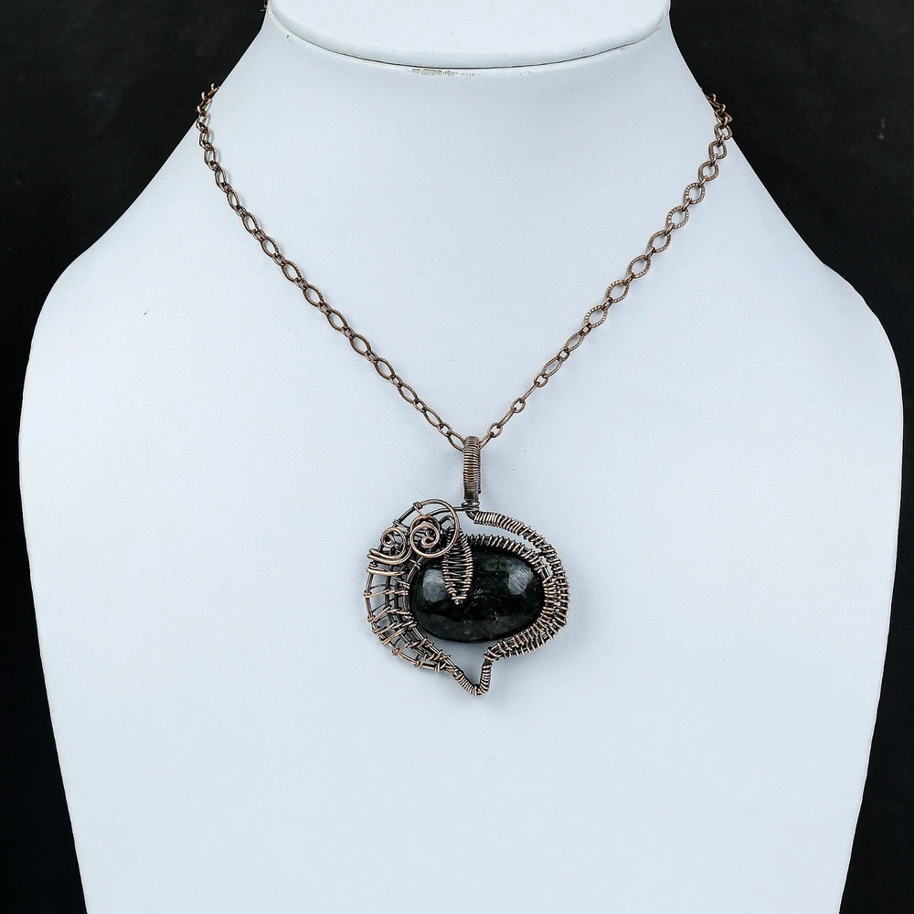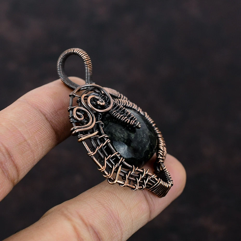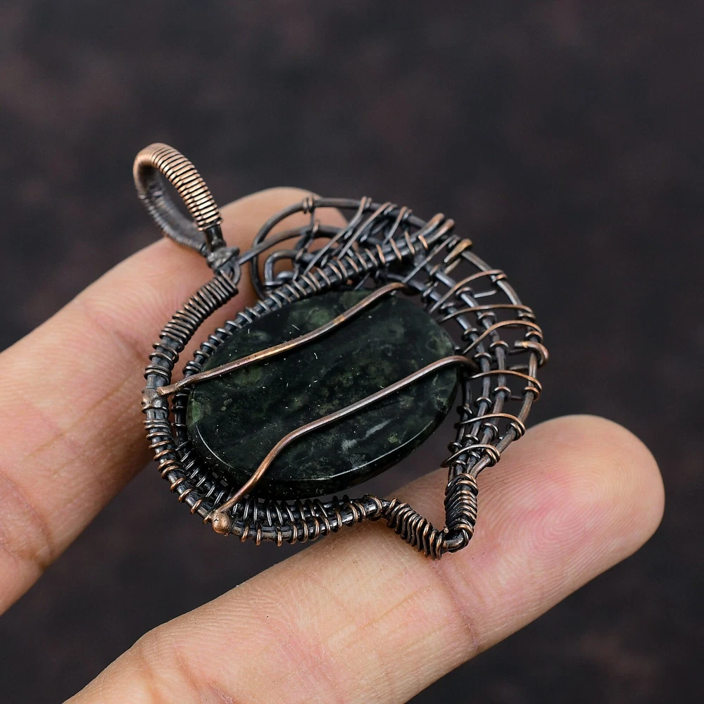 Note : Due to the natural formation of this gemstone. Slight variation in design and color are to be expected. Welcome to Silver Creation Handmade Pendant, Wire Wrapped Pendant, Wire Wrapped Jewelry, Copper Pendant, Copper Wire Pendant, Wrapped Jewelry, Wire Wrap Pendant, Wire Wrap Jewelry SKU : VFWP-1582 Gemstone : Kambaba Jasper Stone Shape : Oval Metal Purity : Unknown Copper Length : 56 Millimetres Width : 45 Millimetres Copper has been used for jewelry making for thousands of years, dating back to ancient civilizations such as the Egyptians, Romans, and Aztecs. Copper was valued for its beauty, versatility, and durability, and was often used to make everything from jewelry and coins to cookware and tools. In addition to its historical significance, copper jewelry also offers several benefits. Copper is a natural conductor of heat and electricity, which makes it ideal for energy healing and therapeutic purposes. Wearing copper jewelry is believed to have various health benefits, such as improving circulation, reducing inflammation, and boosting the immune system. Some people also believe that copper jewelry has the ability to balance energy and improve mood. For Mother's Day Gift For Father's Day Gift For Promise For Valentine' Day For Halloween Party For Christmas Day Gift For New Year Party For Mom For Her If you can't find the information you need or need some advice for your design? Feel free to contact us. We are fast to reply :) All our work is made by hand with Love and Care in our workshop Thank you so much for visiting and hope you enjoy shopping with us Silvercreations is committed to delivering the best quality sterling silver jewelry to customers. As a handmade jewelry manufacturer, we offer an extensive selection of copper gemstone jewelry that showcases the brilliance of our craftsmanship. We are an experienced handmade jewelry supplier with expertise in embellishing gemstones to suit every style. We offer you the liberty to create your jewelry ensemble with sparkling, earthy, and pure gemstones. Our Talented artisans masterfully handcraft each piece of jewelry you see here. Our pieces are made with genuine gemstones.