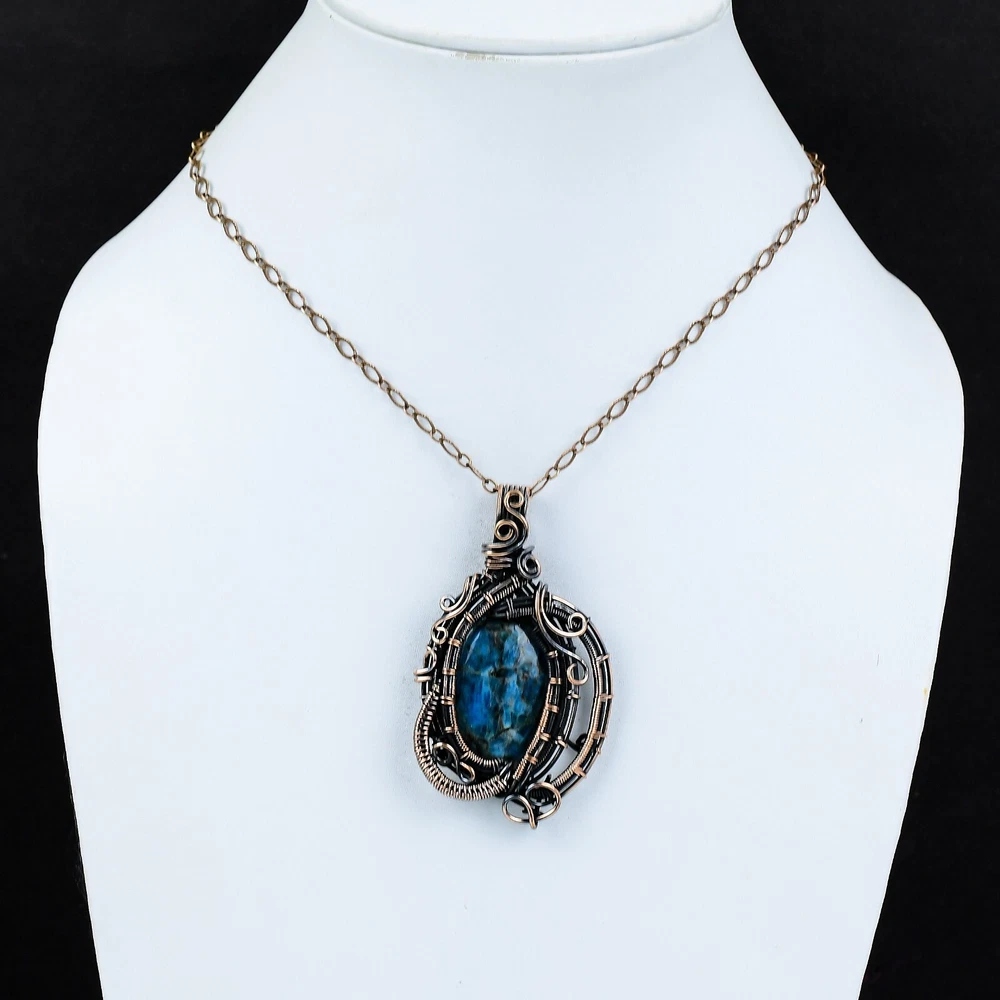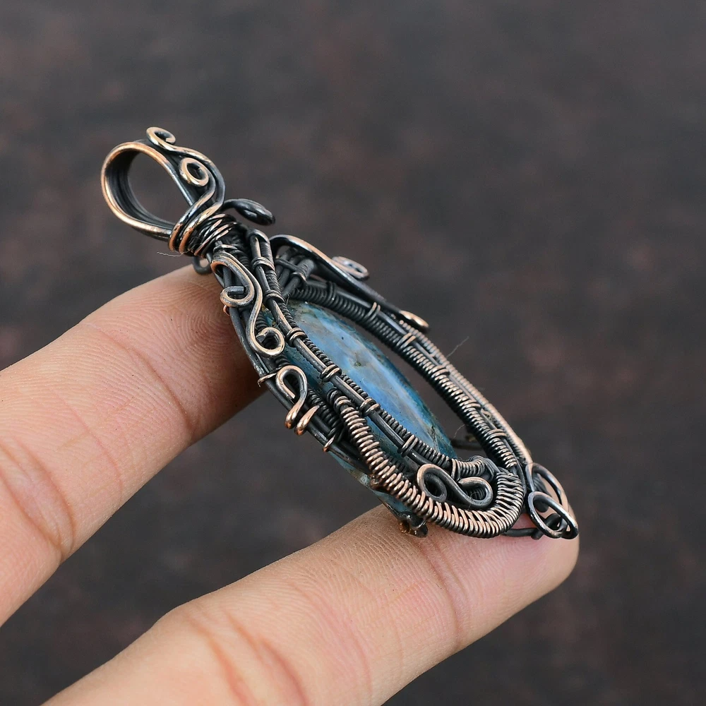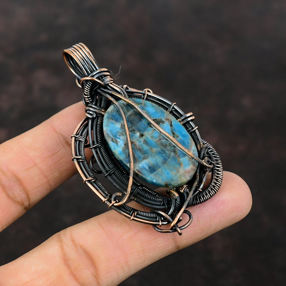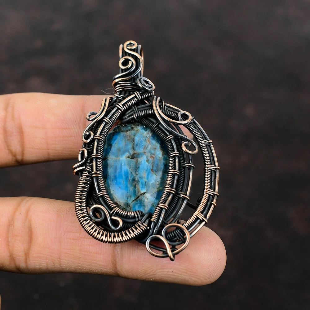 Note : Due to the natural formation of this gemstone. Slight variation in design and color are to be expected. Welcome to Silver Creation Christmas Sale Copper Oval Neon Apatite Stone Wire Wrapped Anniversary Pendant Handmade Pendant, Wire Wrapped Pendant, Wire Wrapped Jewelry, Copper Pendant, Copper Wire Pendant, Wrapped Jewelry, Wire Wrap Pendant, Wire Wrap Jewelry SKU : VFWP-3634 Gemstone : Neon Apatite Stone Shape : Oval Metal Purity : Unknown Copper Length : 72 $Pendant Unit$ Width : 43 $Pendant Unit$ Copper has been used for jewelry making for thousands of years, dating back to ancient civilizations such as the Egyptians, Romans, and Aztecs. Copper was valued for its beauty, versatility, and durability, and was often used to make everything from jewelry and coins to cookware and tools. In addition to its historical significance, copper jewelry also offers several benefits. Copper is a natural conductor of heat and electricity, which makes it ideal for energy healing and therapeutic purposes. Wearing copper jewelry is believed to have various health benefits, such as improving circulation, reducing inflammation, and boosting the immune system. Some people also believe that copper jewelry has the ability to balance energy and improve mood. For Mother's Day Gift For Father's Day Gift For Promise For Valentine' Day For Halloween Party For Christmas Day Gift For New Year Party For Mom For Her If you can't find the information you need or need some advice for your design? Feel free to contact us. We are fast to reply :) All our work is made by hand with Love and Care in our workshop Thank you so much for visiting and hope you enjoy shopping with us Silvercreations is committed to delivering the best quality sterling silver jewelry to customers. As a handmade jewelry manufacturer, we offer an extensive selection of copper gemstone jewelry that showcases the brilliance of our craftsmanship. We are an experienced handmade jewelry supplier with expertise in embellishing gemstones to suit every style. We offer you the liberty to create your jewelry ensemble with sparkling, earthy, and pure gemstones. Our Talented artisans masterfully handcraft each piece of jewelry you see here. Our pieces are made with genuine gemstones.