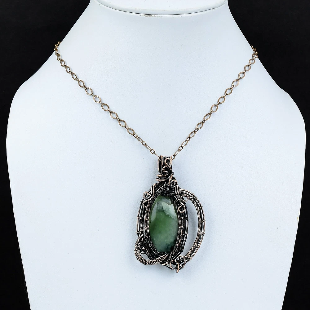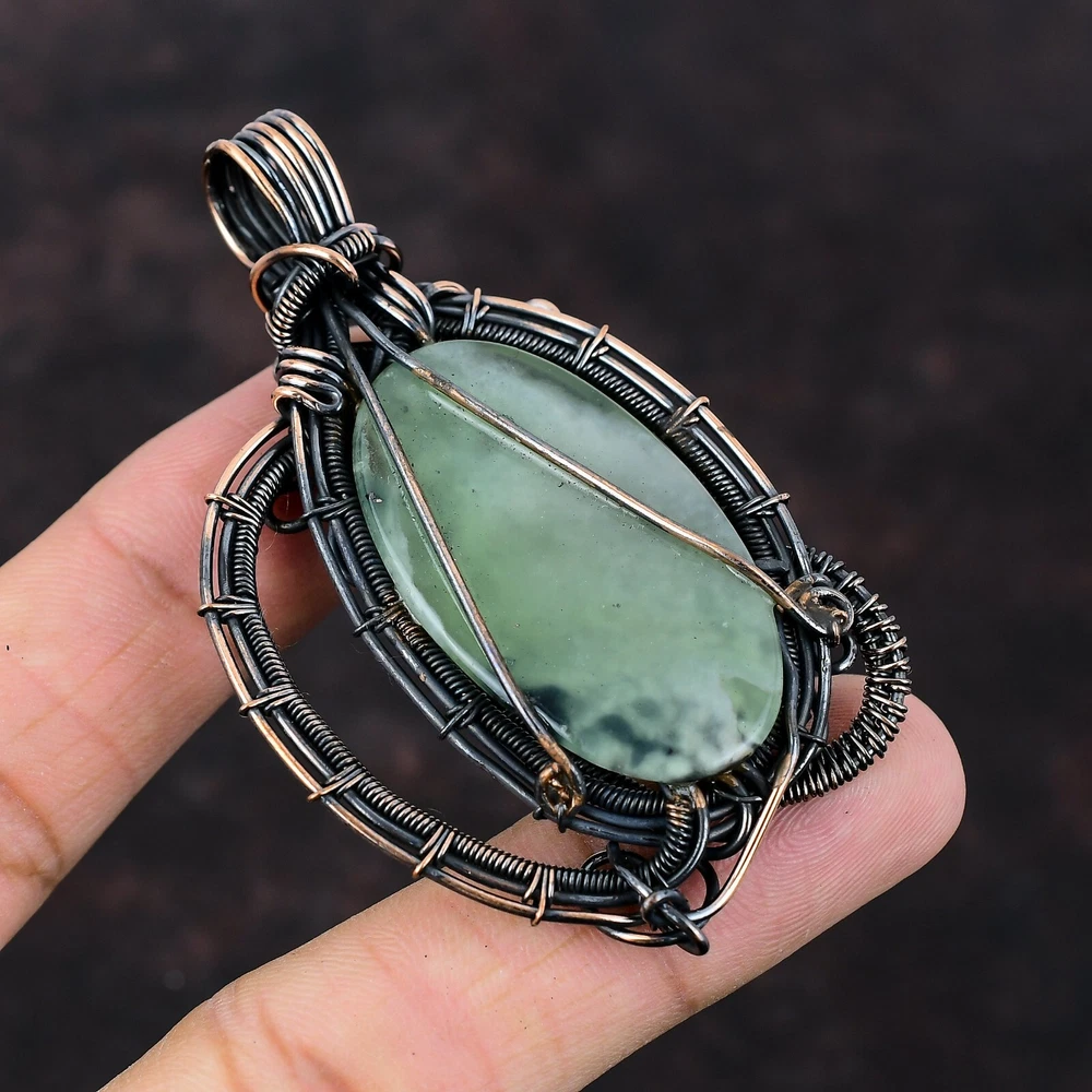 Note : Due to the natural formation of this gemstone. Slight variation in design and color are to be expected. Welcome to Silver Creation Handmade Pendant, Wire Wrapped Pendant, Wire Wrapped Jewelry, Copper Pendant, Copper Wire Pendant, Wrapped Jewelry, Wire Wrap Pendant, Wire Wrap Jewelry SKU : VFWP-3601 Gemstone : Prehnite Stone Shape : Oval Metal Purity : Unknown Copper Length : 77 Millimetres Width : 45 Millimetres Copper has been used for jewelry making for thousands of years, dating back to ancient civilizations such as the Egyptians, Romans, and Aztecs. Copper was valued for its beauty, versatility, and durability, and was often used to make everything from jewelry and coins to cookware and tools. In addition to its historical significance, copper jewelry also offers several benefits. Copper is a natural conductor of heat and electricity, which makes it ideal for energy healing and therapeutic purposes. Wearing copper jewelry is believed to have various health benefits, such as improving circulation, reducing inflammation, and boosting the immune system. Some people also believe that copper jewelry has the ability to balance energy and improve mood. For Mother's Day Gift For Father's Day Gift For Promise For Valentine' Day For Halloween Party For Christmas Day Gift For New Year Party For Mom For Her If you can't find the information you need or need some advice for your design? Feel free to contact us. We are fast to reply :) All our work is made by hand with Love and Care in our workshop Thank you so much for visiting and hope you enjoy shopping with us Silvercreations is committed to delivering the best quality sterling silver jewelry to customers. As a handmade jewelry manufacturer, we offer an extensive selection of copper gemstone jewelry that showcases the brilliance of our craftsmanship. We are an experienced handmade jewelry supplier with expertise in embellishing gemstones to suit every style. We offer you the liberty to create your jewelry ensemble with sparkling, earthy, and pure gemstones. Our Talented artisans masterfully handcraft each piece of jewelry you see here. Our pieces are made with genuine gemstones.