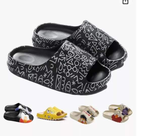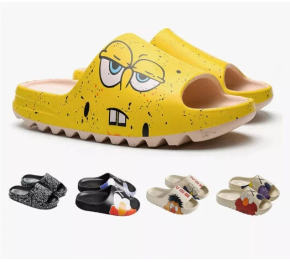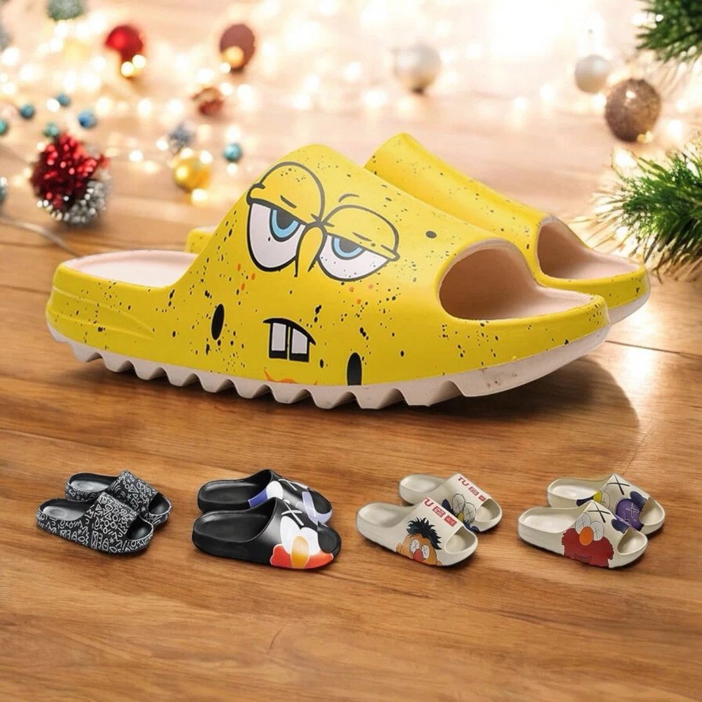 Step out in style with these Yeezy Slides featuring an anti-slip cartoon print. The almond toe shape adds a touch of elegance to these unisex slippers, perfect for travel, activewear, casual, or workwear occasions. The slip-resistant and non-slip features provide comfort and safety, while the breathable and water-resistant material makes them suitable for all seasons. These Yeezy Slides are made with ethylene vinyl acetate upper and lining material, and feature graffiti accents of Elmo and SpongeBob SquarePants. The slipper's outsole and insole are also made of ethylene vinyl acetate material. These slippers are perfect for anyone looking for a comfortable, stylish, and practical addition to their wardrobe. You can also check out our main store for a discount by heading visiting to https://toonfeet.com .