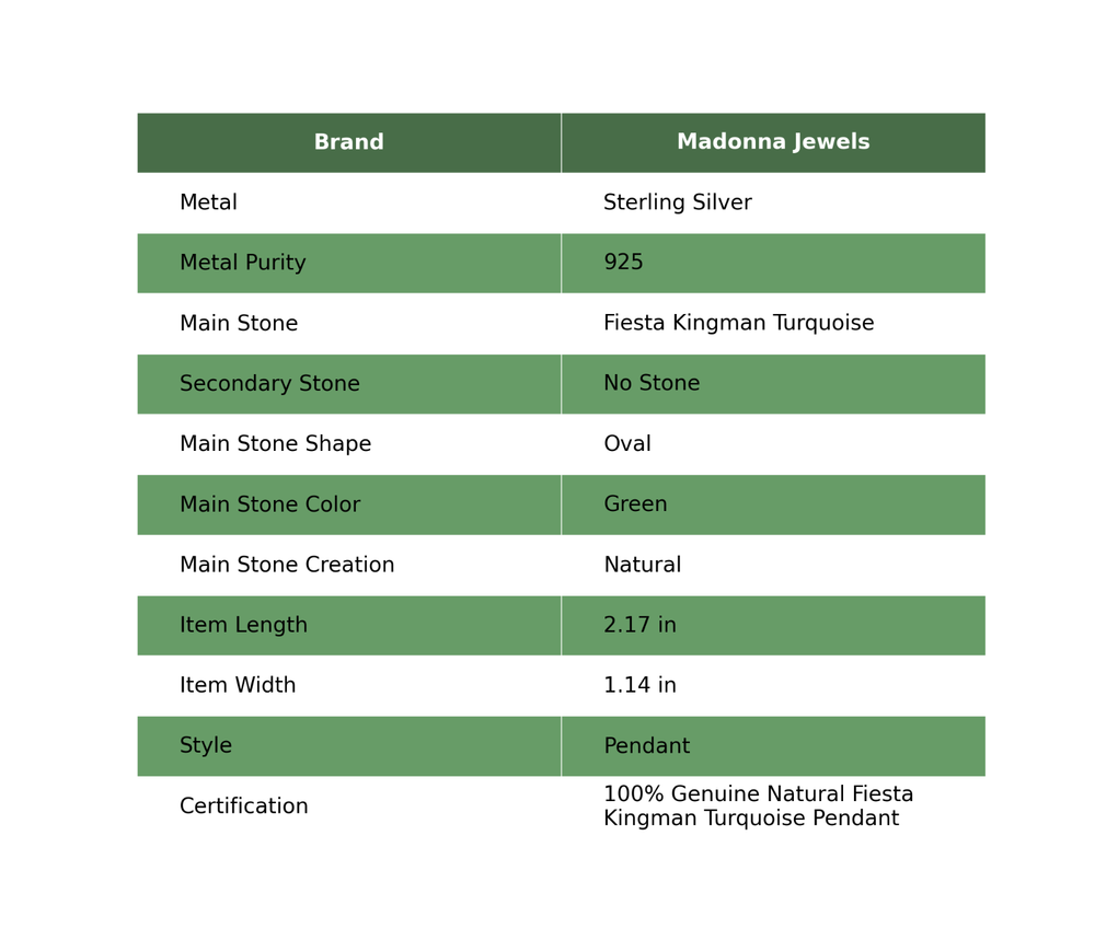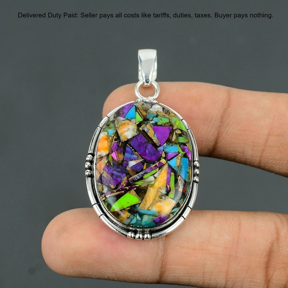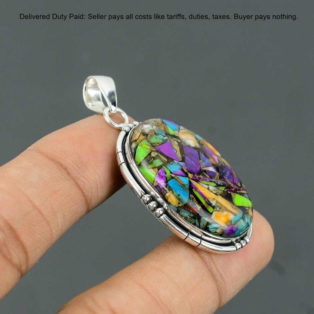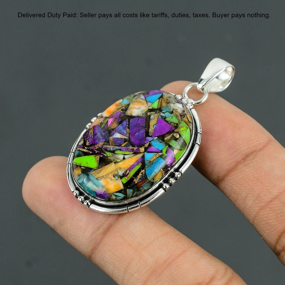Welcome to Madonna Jewels Christmas Sale Fiesta Kingman Turquoise Gemstone Pendant Jewelry Sterling Silver Handmade Pendant, Sterling Silver Pendant, Fiesta Kingman Turquoise Pendant, Handcrafted Pendant SKU : VP-212 Gemstone : Fiesta Kingman Turquoise Stone Shape : Oval Metal Purity : 925 Sterling Silver Length : 55 Millimeters Width : 29 Millimeters Silver Jewelry is a popular choice for many people due to its unique properties and numerous benefits. Here are some of the key properties and benefits of wearing silver jewelry: Properties: Durability: Silver is a durable metal that can withstand regular wear and tear. Malleability: Silver is highly malleable, which means it can be easily shaped and molded into various designs. Conductivity: Silver is an excellent conductor of heat and electricity. Anti-bacterial: Silver has natural anti-bacterial properties, which can help prevent the growth of harmful bacteria. Benefits: Aesthetic appeal: Silver jewelry is known for its beauty and versatility, and can be worn with a variety of outfits and styles. Hypoallergenic: Silver is generally hypoallergenic, which means it is unlikely to cause an allergic reaction in most people. Healing properties: Some people believe that wearing silver jewelry can help with various physical and emotional conditions, such as arthritis, anxiety, and depression. Spiritual significance: Silver has been used in various cultures for its spiritual and symbolic significance, and wearing silver jewelry can help to connect with these traditions. Investment value: Silver is a precious metal that retains its value over time, and investing in silver jewelry can be a smart financial decision. Overall, silver jewelry offers a unique combination of beauty, durability, and benefits, making it a popular choice for people around the world. For Mother's Day Gift For Father's Day Gift For Promise For Valentine' Day For Halloween Party For Christmas Day Gift For New Year Party For Mom For Her If you can't find the information you need or need some advice for your design? Feel free to contact us. We are fast to reply :) All our work is made by hand with Love and Care in our workshop Thank you so much for visiting and hope you enjoy shopping with us Madonna Jewels is dedicated to providing customers with high-quality sterling silver jewelry. As a manufacturer of handmade jewelry, we offer an extensive range of silver gemstone jewelry that demonstrates our exceptional craftsmanship. We are skilled in adorning gemstones to complement any style, and we give you the freedom to design your own jewelry collection with dazzling, natural, and genuine gemstones. Our talented craftsmen carefully handcraft each jewelry piece, ensuring that it is unique and made with authentic gemstones. The jewelry item you see on our website is precisely the same one you will receive.