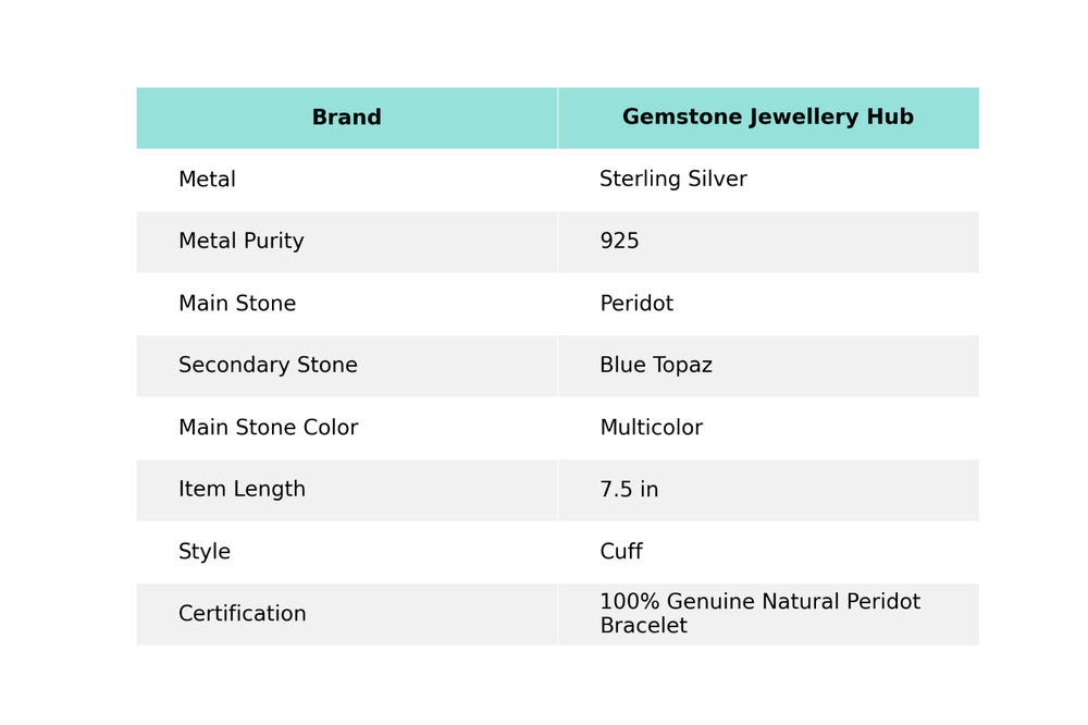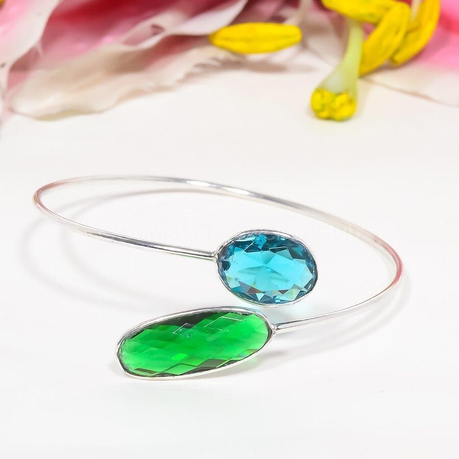 Setting Style: Channel-Set Main Stone Color: Multicolor Seller Warranty: Yes Style: Cuff Features: Adjustable, Engraved, Nickel-Free, Handcrafted Brand: Unbranded Shape: As Seen As Picture Gemstone Clarity Grade: Eye Clean Chain Type: Not Applicable Item Length: 7.5 in Main Stone: Peridot Signed: Yes Main Stone Shape: As Seen In Picture Vintage: No Metal Purity: 925 Antique: No Material: Crystal, Gemstone, Stone, Metal Cut Grade: Excellent Color: Silver Occasion: Anniversary, Birthday, Engagement, Wedding Theme: Beauty, Bohemian, Ethnic, Healing, Love, Luck, Special Occasion, Halo, Love & Hearts Base Metal: Silver Metal: Silver Type: Bracelet Sizable: Yes Wholesale: Yes Country/Region of Manufacture: India Charm Type: Traditional Main Stone Treatment: Not Enhanced Customized: No Secondary Stone: Blue Topaz Number of Gemstones: As Seen in Picture Era: Undated