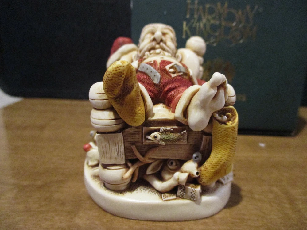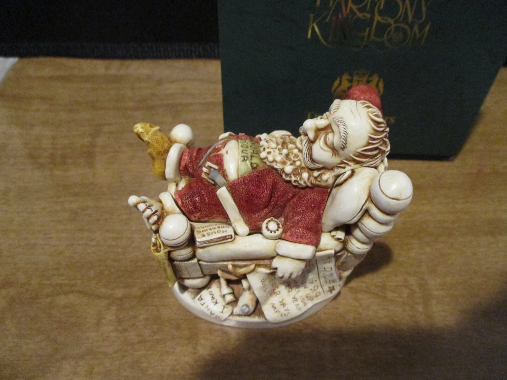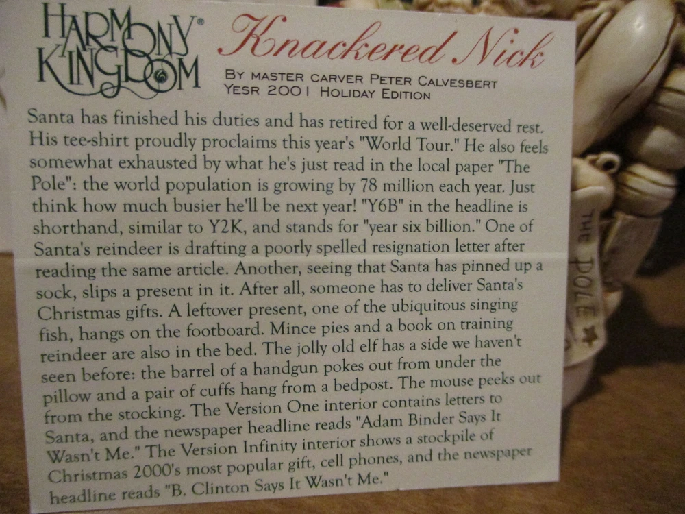 Please Note : If you are interested in collecting Harmony Kingdom, Adam Binder Editions or Fragile World pieces, please select me as one of your favorite sellers on eBay, or contact me about a piece you are looking for, and I will be happy to list it, if I have it. I have a large selection of pieces in my ebay store, but due to the expense of listing them all at one time, I will be listing only a few auctions each week. I will try and list a variety of pieces each week and hopefully you will find items of interest to you. This Harmony Kingdom box figurine named "Knackered Nick" was carved by Peter Calvesbert in 2001. It was hand painted/finished by local craftsmen in the Cotswold area of England. "Santa has finished his duties and has retired for a well deserved rest. His tee-shirt proudly proclaims this year's "World Tour." He also feels somewhat exhausted by what he's just read in the local paper "The Pole": the world population is growing by 78 million each year. Just think how much busier he'll be next year! "Y6B" in the headline is shorthand, similar to Y2K, and stands for "year six billion." One of Santa's reindeer is drafting a poorly spelled resignation letter after reading the same article. Another, seeing that Santa has pinned up a sock, slips a present in it. After all, someone has to deliver Santa's Christmas gifts. A leftover present, one of the ubiquitous singing fish, hangs on the footboard. Mince pies and a book on training reindeer are also in the bed. The jolly old elf has a side we haven't seen before: the barrel of a handgun pokes out from under the pillow and a pair of cuffs hang from a bedpost. The mouse peeks out from the stocking. The Version One interior contains letters to Santa and the newspaper headline reads "A. Binder Says Wasn't Me." The Version Infinity interior shows a stockpile of Christmas 2000's most popular gift, cell phones, and the newspaper headline reads "B. Clinton Says Wasn't Me." USPS Ground Advantage insured shipping in the US. The piece is "mint in box". Thanks for looking!