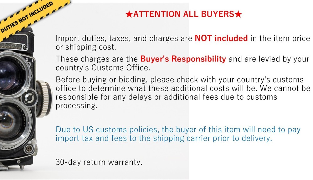 This seller far exceeded my expectations. Caught in the midst of the US drastically altering their policies regarding import duties on low cost items, the seller provided the information clearly on the listing and followed up with a detailed email message to me that included all pertinent information. Also, the item is considerably better than top mint. From my perspective, the lens appears to be in brand new condition. Thank you for a professional experience and a beautiful product. A+ Seller!!