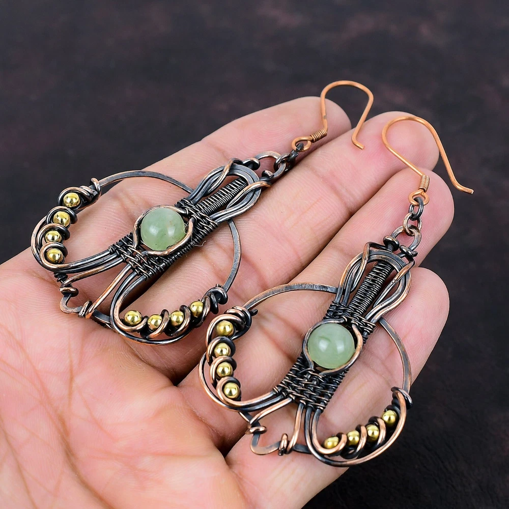 Style: Drop/Dangle Main Stone Shape: Round Shape: Wire Wrapped Type: Earrings Number of Gemstones: As Seen in Picture Country of Origin: India Cut Grade: Very Good Metal: Copper Item Length: 3.35 in Setting Style: Wire Wrap Features: Engraved, Handcrafted Color: Brown Material: Crystal, Stone, Gemstone, Metal, Mineral Closure: Hook Antique: No Signed: Yes Metal Purity: Unknown Seller Notes: “Handcrafted Copper Gemstone Earrings Jewelry” Base Metal: Copper Occasion: Anniversary, Birthday, Engagement, Wedding Main Stone: Prehnite Brand: Unbranded Ear Area: Lobe Seller Warranty: Yes Main Stone Treatment: Not Enhanced Wholesale: Yes Vintage: No Theme: Beauty, Bohemian, Ethnic, Love, Luck, Healing, Holiday Main Stone Color: Green Country/Region of Manufacture: India Main Stone Creation: Natural Customized: No