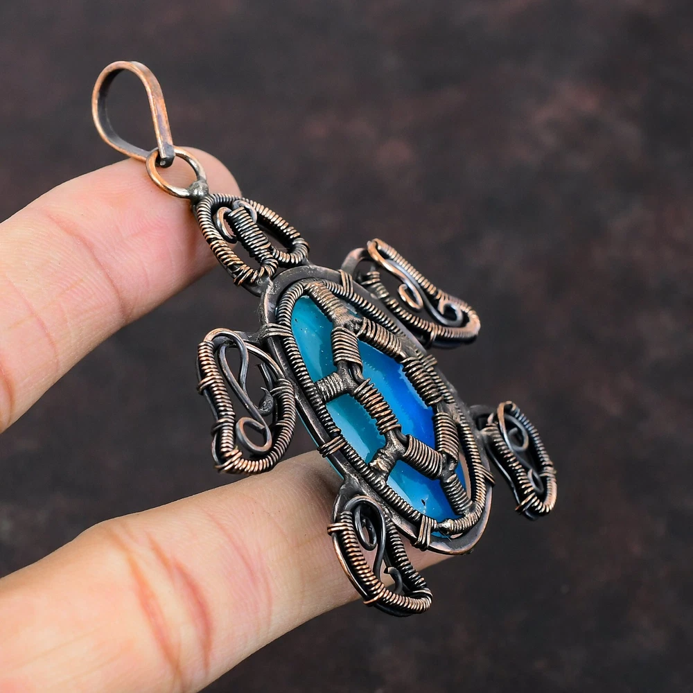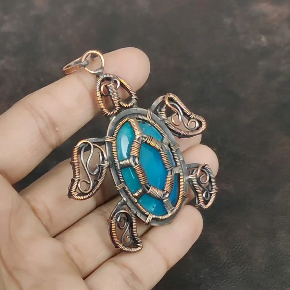 Note : Due to the natural formation of this gemstone. Slight variation in design and color are to be expected. Welcome to Silver Creation Handmade Pendant, Wire Wrapped Pendant, Wire Wrapped Jewelry, Copper Pendant, Copper Wire Pendant, Wrapped Jewelry, Wire Wrap Pendant, Wire Wrap Jewelry SKU : VFWP-4107 Gemstone : Smithsonite Stone Shape : Oval Metal Purity : Unknown Copper Length : 77 Millimetres Width : 60 Millimetres Copper has been used for jewelry making for thousands of years, dating back to ancient civilizations such as the Egyptians, Romans, and Aztecs. Copper was valued for its beauty, versatility, and durability, and was often used to make everything from jewelry and coins to cookware and tools. In addition to its historical significance, copper jewelry also offers several benefits. Copper is a natural conductor of heat and electricity, which makes it ideal for energy healing and therapeutic purposes. Wearing copper jewelry is believed to have various health benefits, such as improving circulation, reducing inflammation, and boosting the immune system. Some people also believe that copper jewelry has the ability to balance energy and improve mood. For Mother's Day Gift For Father's Day Gift For Promise For Valentine' Day For Halloween Party For Christmas Day Gift For New Year Party For Mom For Her If you can't find the information you need or need some advice for your design? Feel free to contact us. We are fast to reply :) All our work is made by hand with Love and Care in our workshop Thank you so much for visiting and hope you enjoy shopping with us Silvercreations is committed to delivering the best quality sterling silver jewelry to customers. As a handmade jewelry manufacturer, we offer an extensive selection of copper gemstone jewelry that showcases the brilliance of our craftsmanship. We are an experienced handmade jewelry supplier with expertise in embellishing gemstones to suit every style. We offer you the liberty to create your jewelry ensemble with sparkling, earthy, and pure gemstones. Our Talented artisans masterfully handcraft each piece of jewelry you see here. Our pieces are made with genuine gemstones.